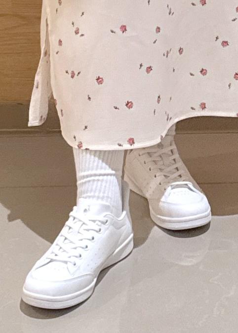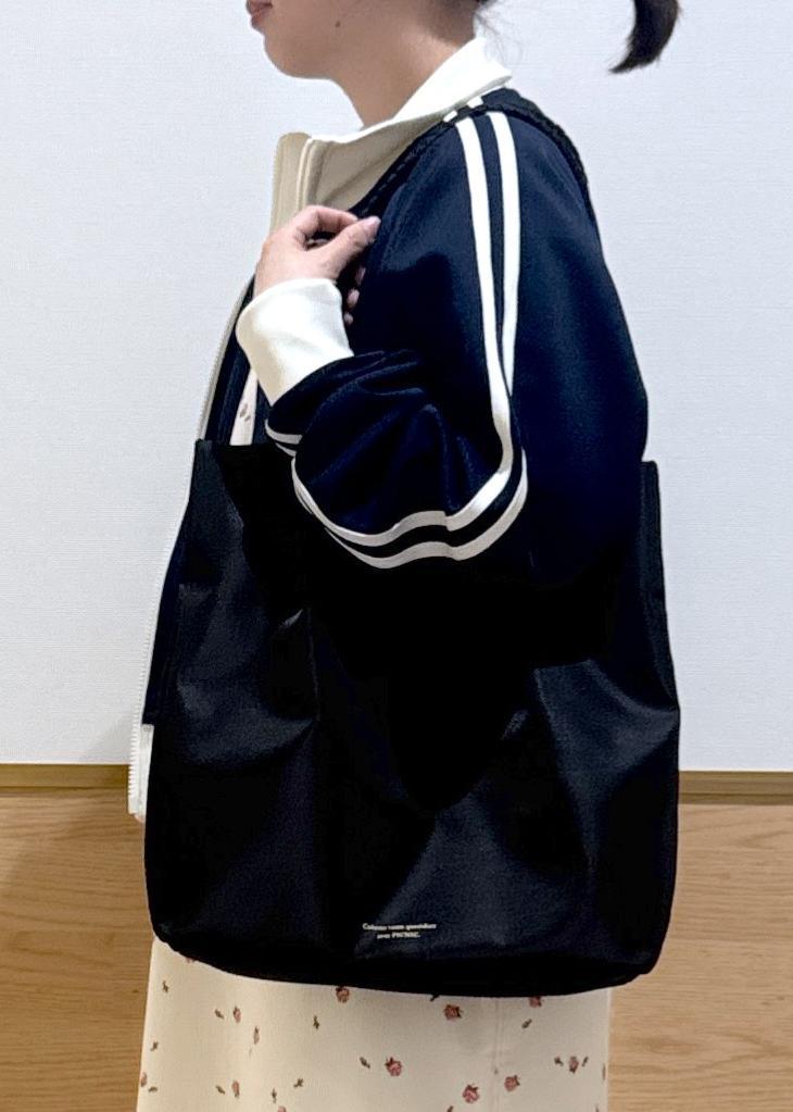 小物もスニーカーやポリエステル素材のトートバッグで、カジュアルに仕上げました。