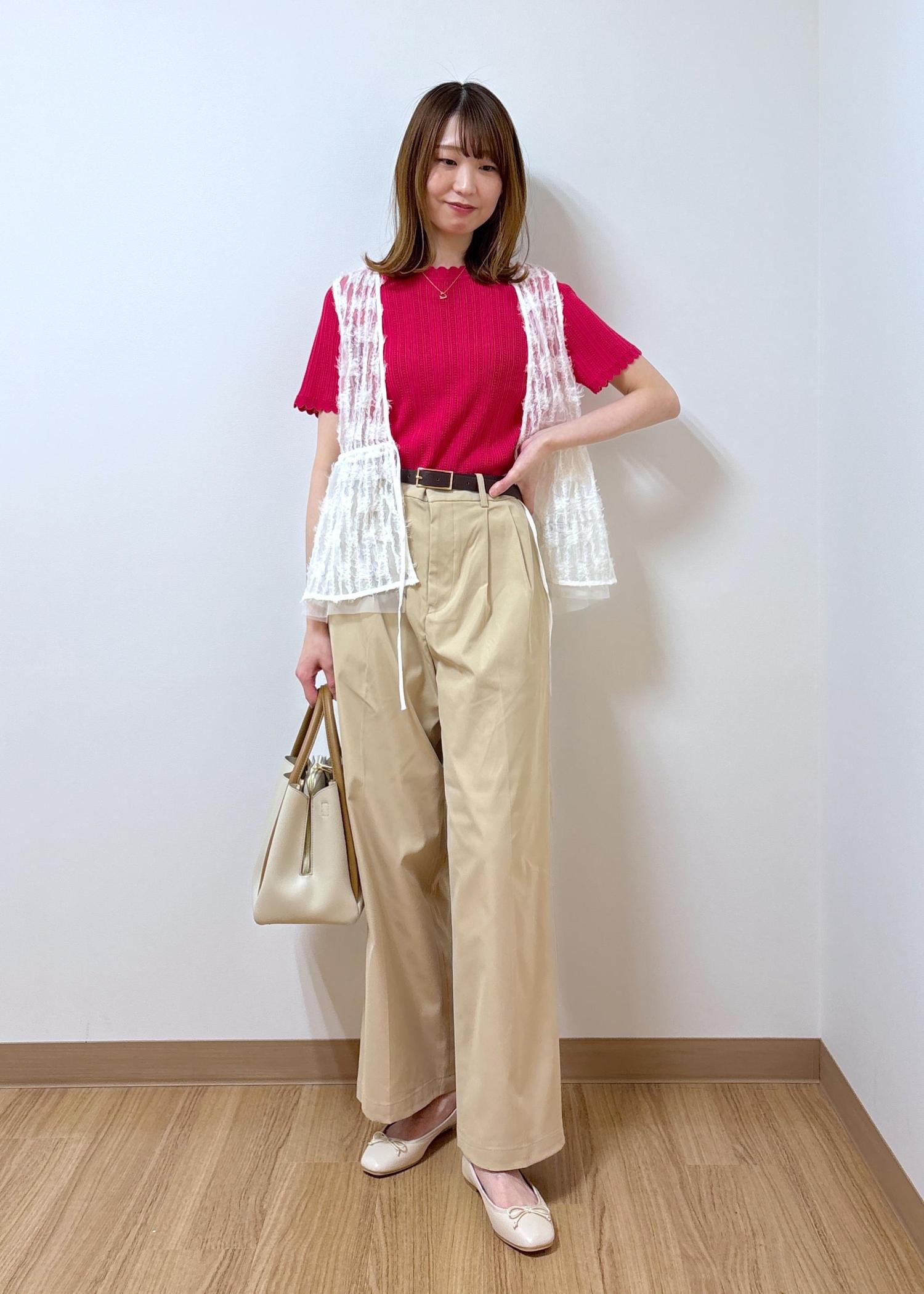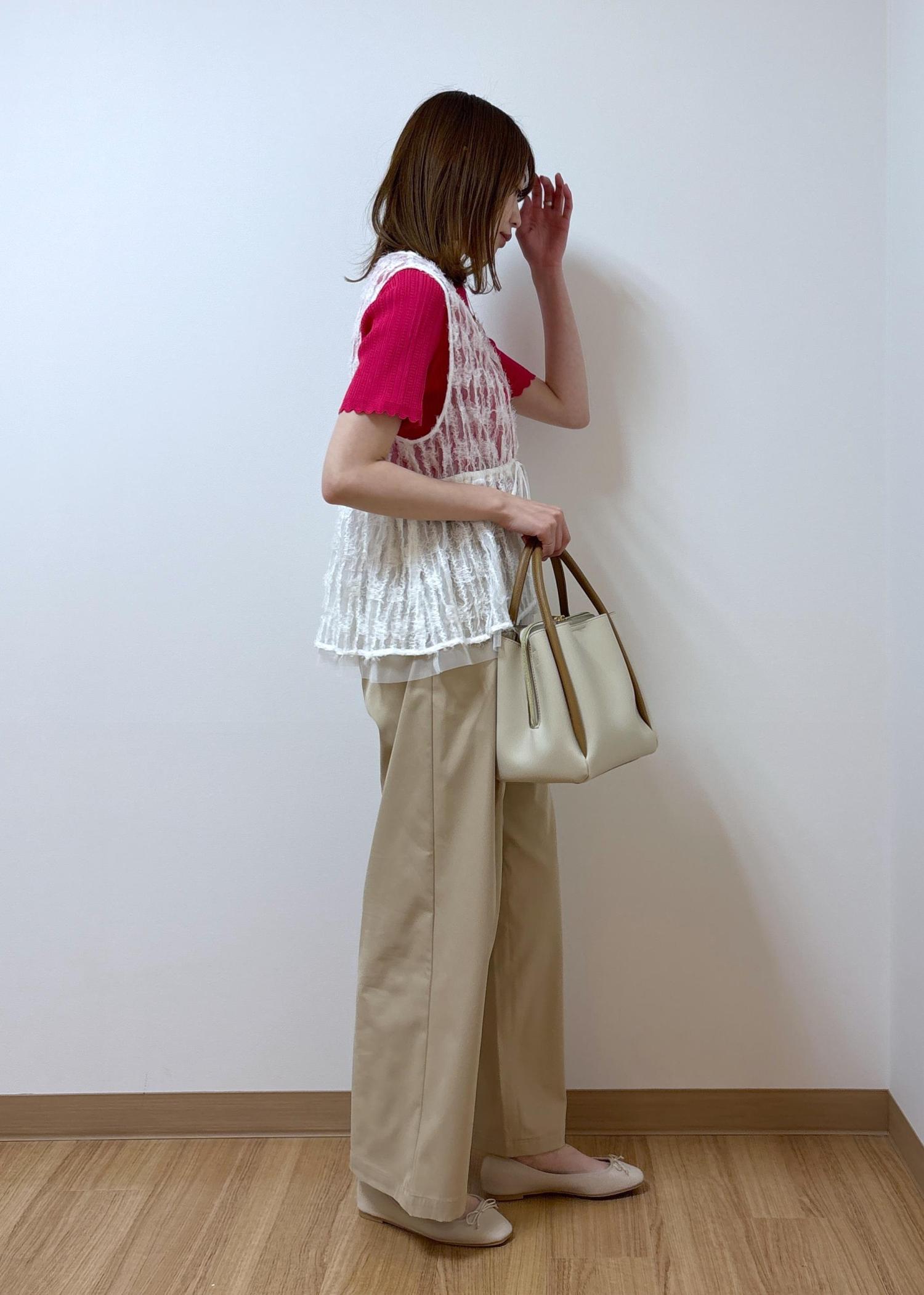 カジュアルなスタイリングにレースジレで女性らしさをプラスしてみました。