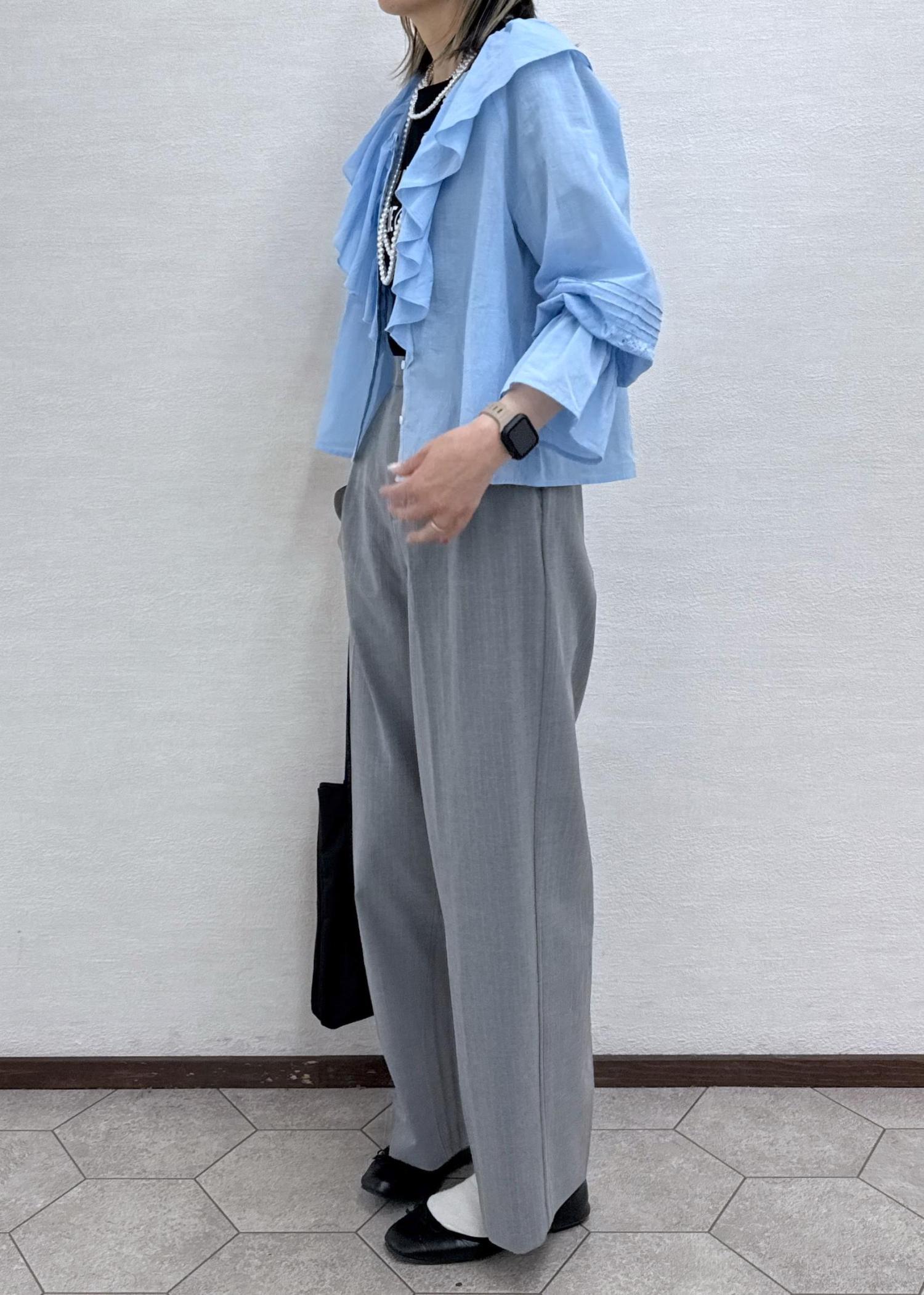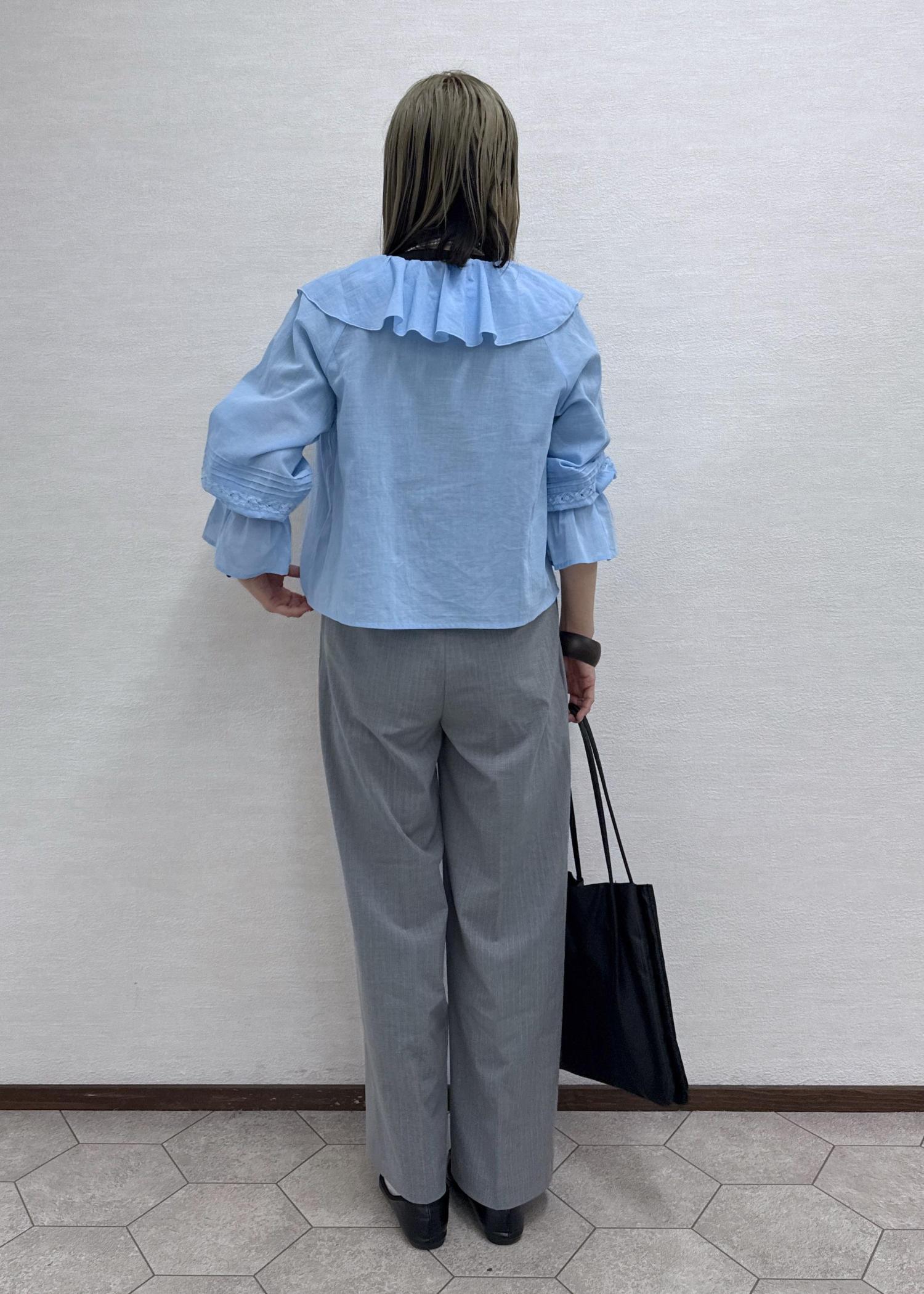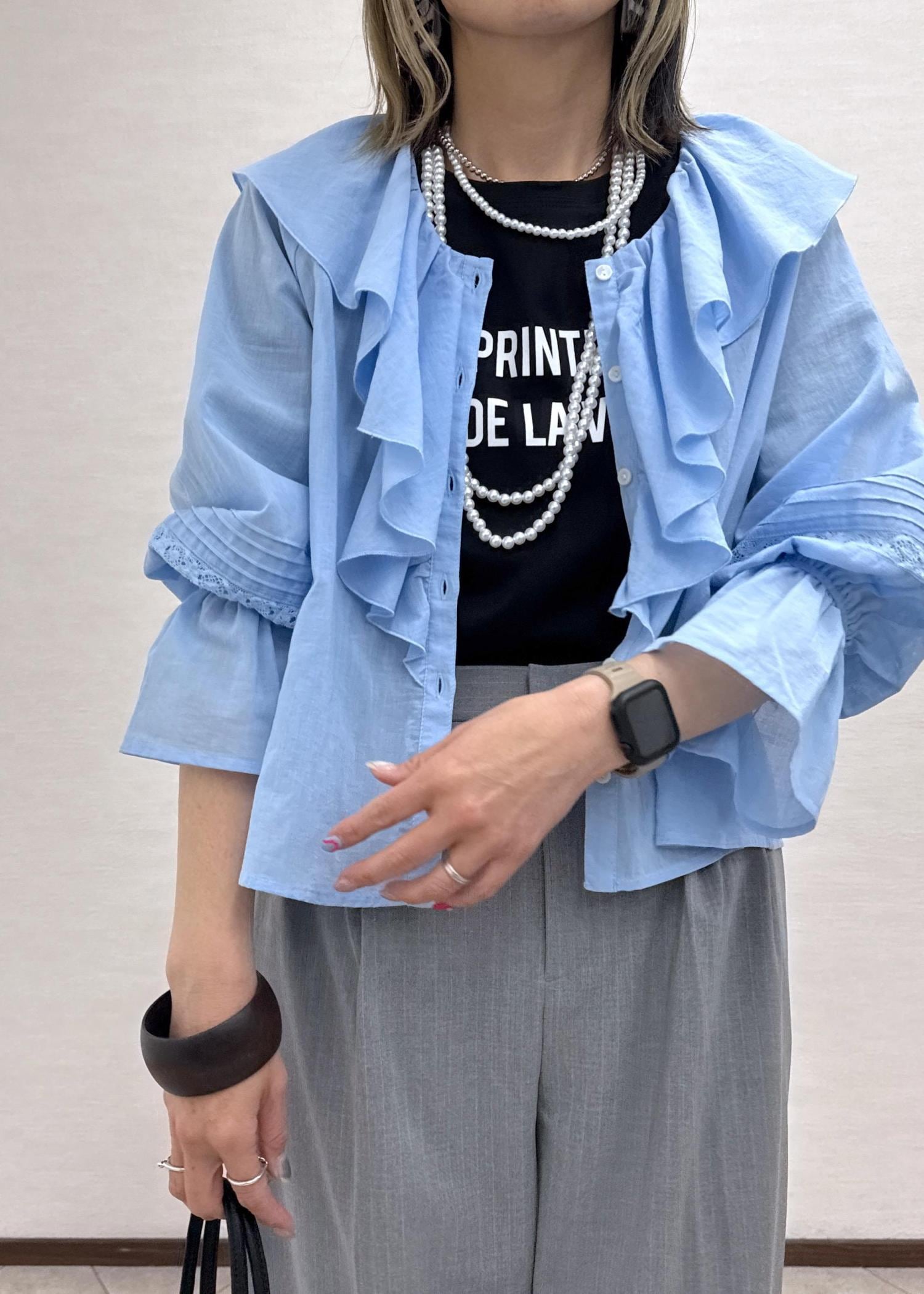 アウトレットROPÉ PICNIC【接触冷感・通気性】お着軽シャツシリーズ/綿ボイルフリルブラウスサックス / 38¥4,391レビューボリュームのあるお袖と胸元のフリルが可愛いブラウス。身幅はゆったりとしていてボタンを開けて羽織りでも◎1枚でコーデが華やかになる決まる1着です。