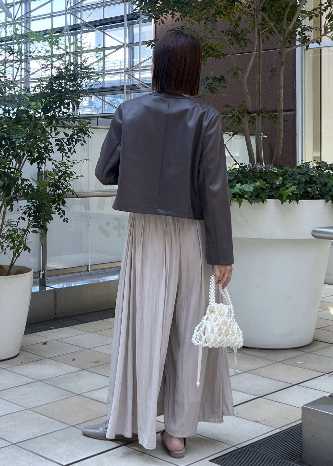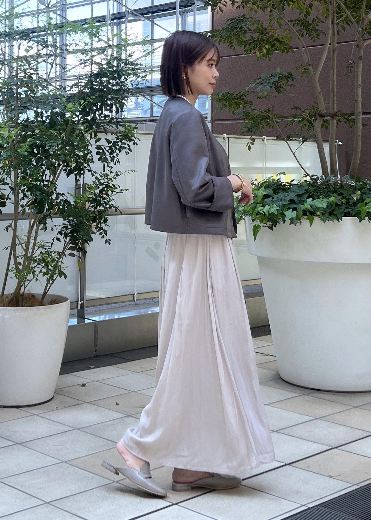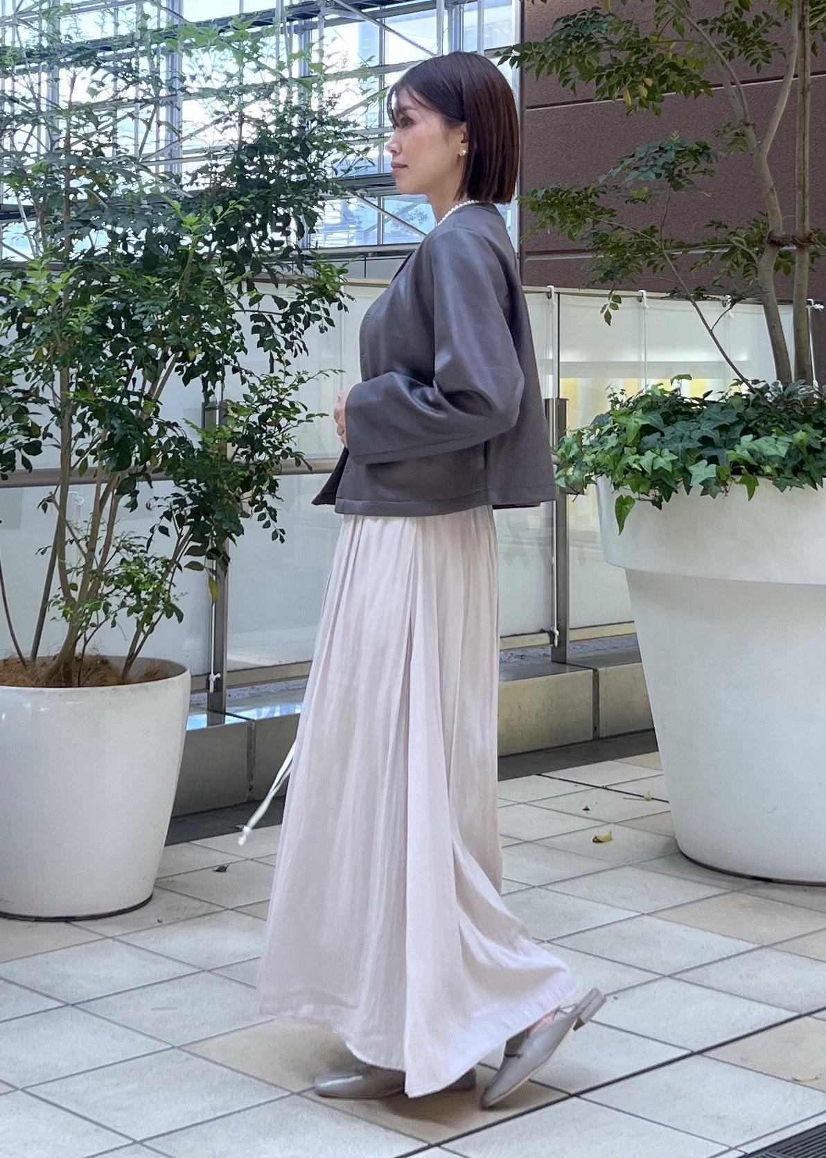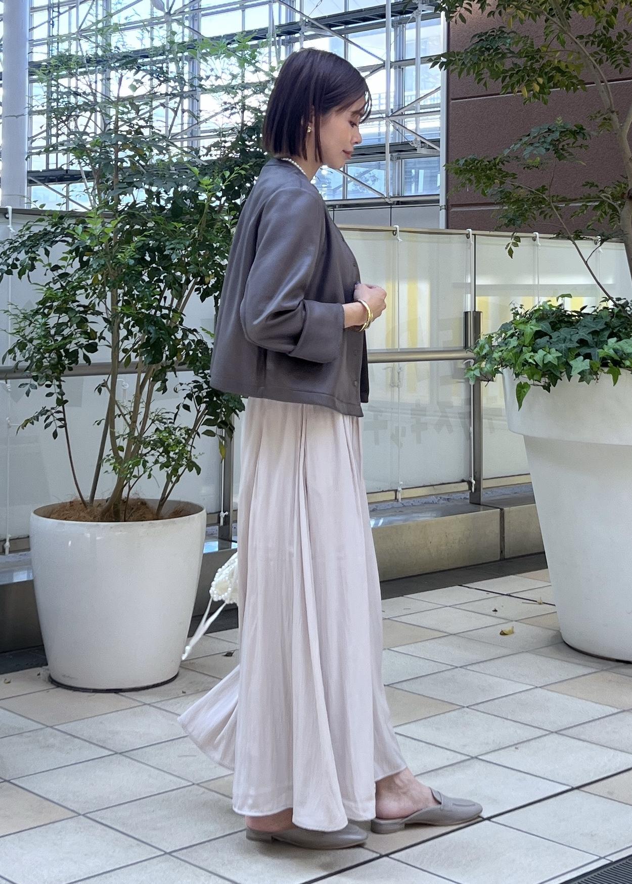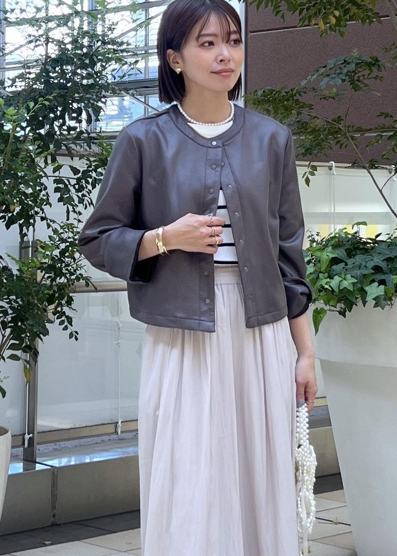 ノーカラーのブルゾンは柔らかく羽織やすい生地感。