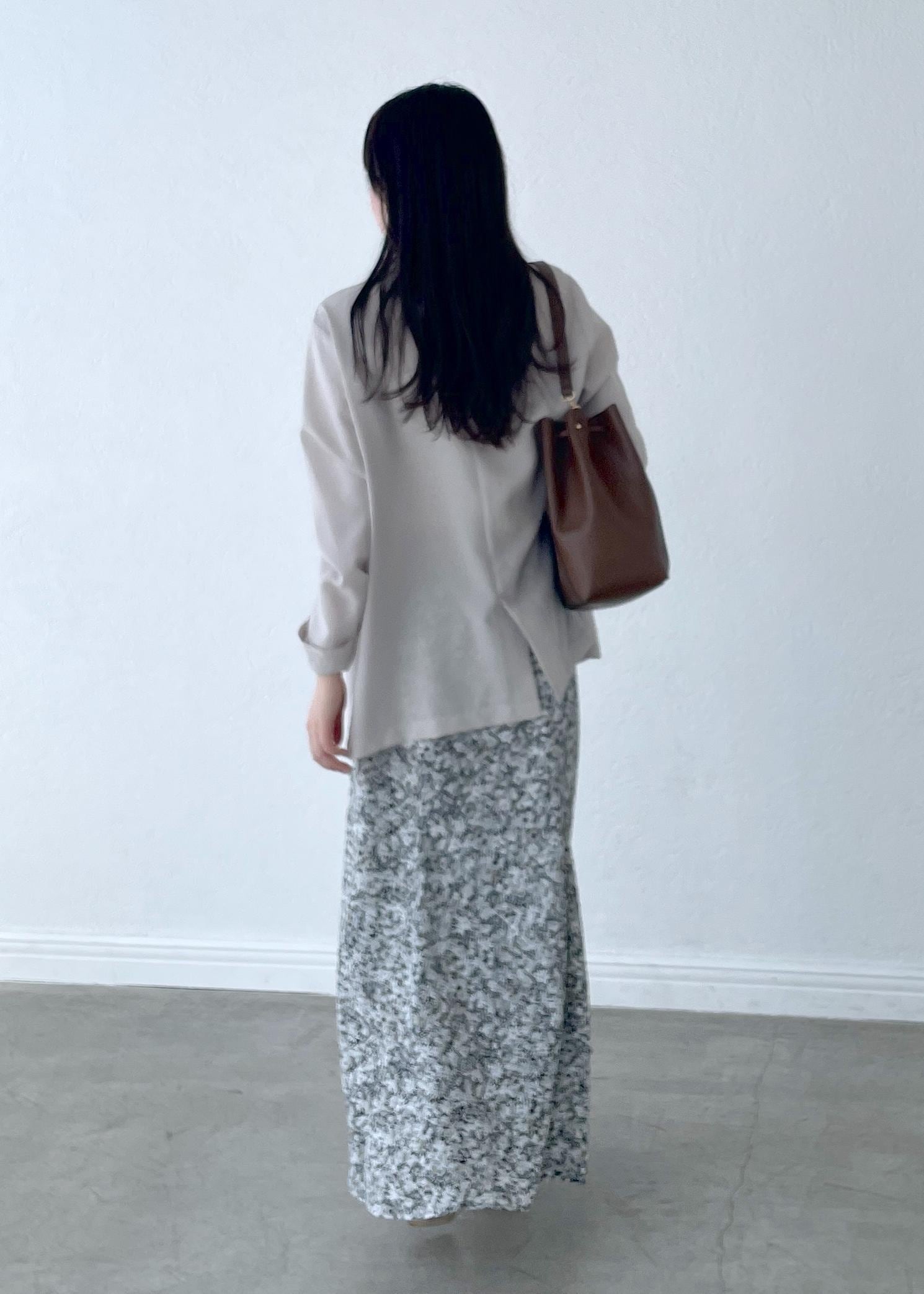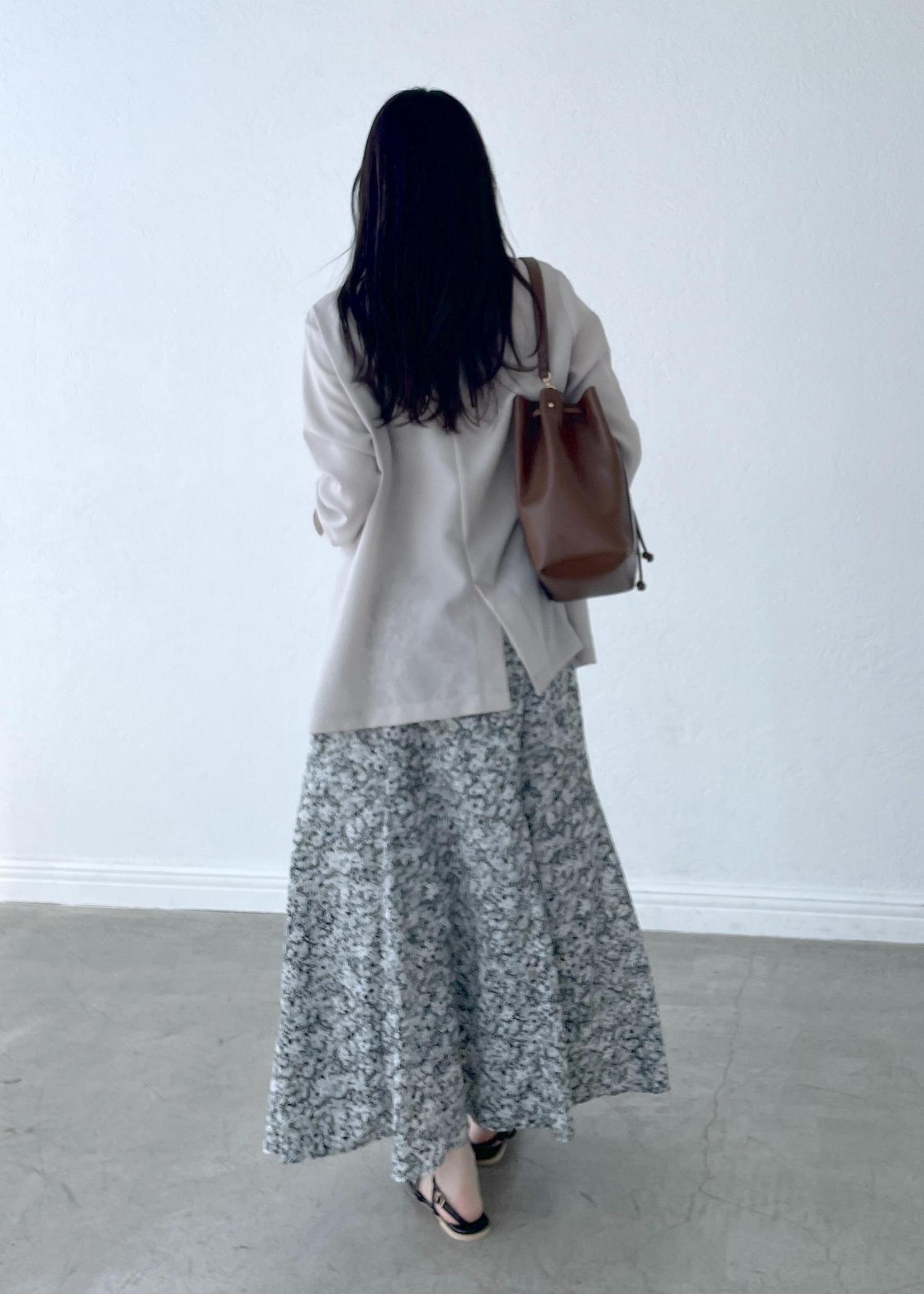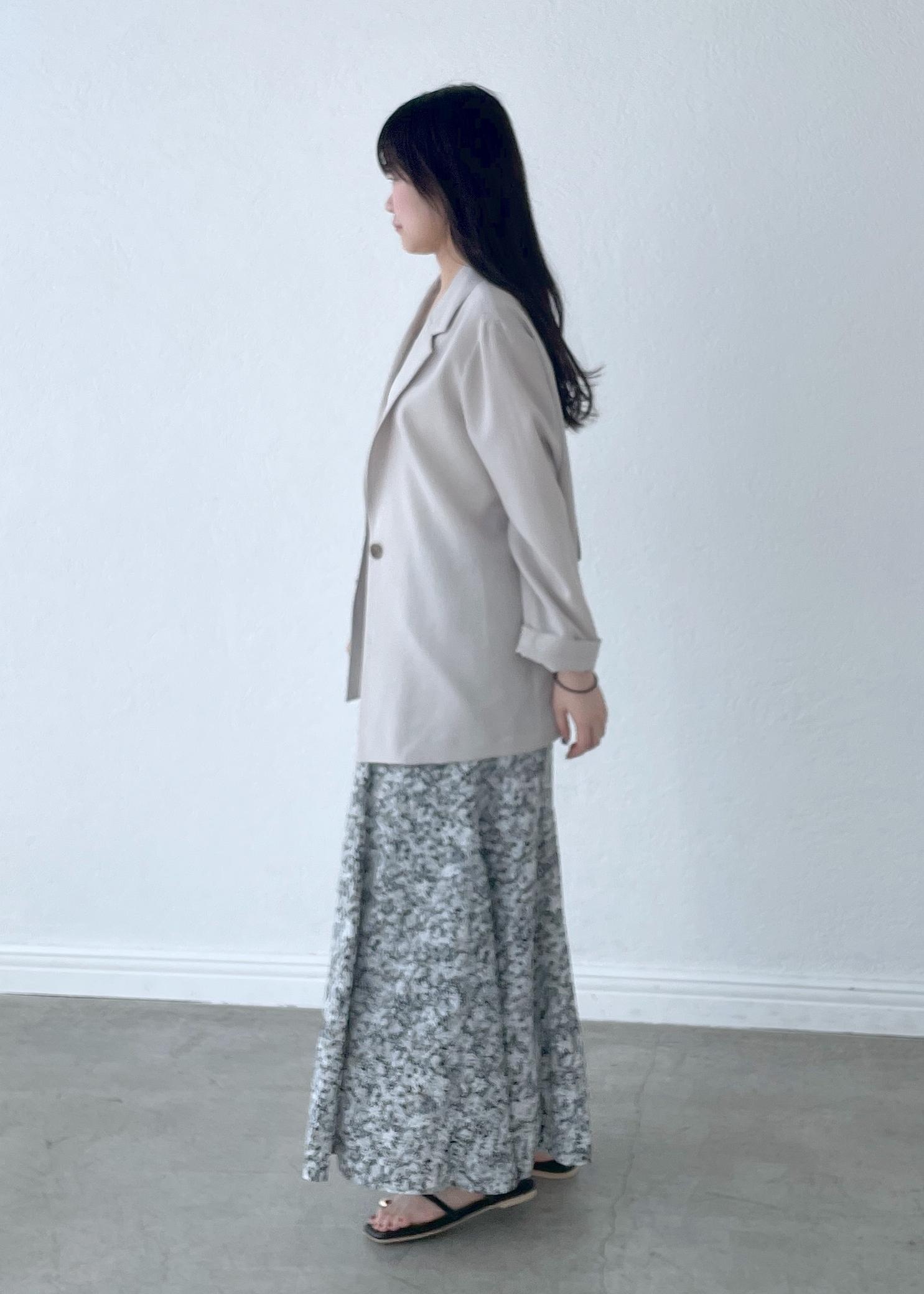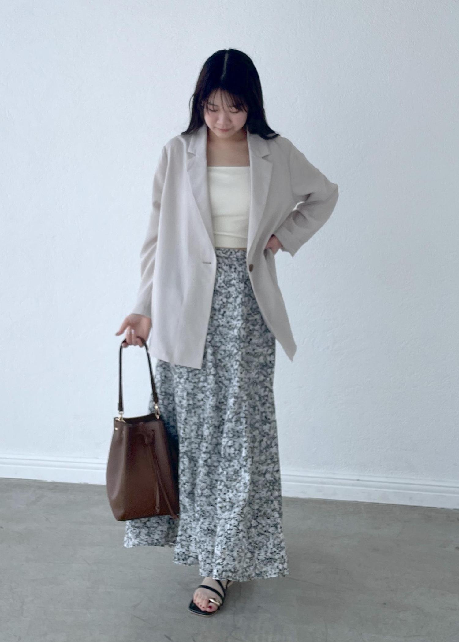 花柄のスカートを主役に大きめなシルエットのジャケットを羽織った大人らしいコーディネートです。