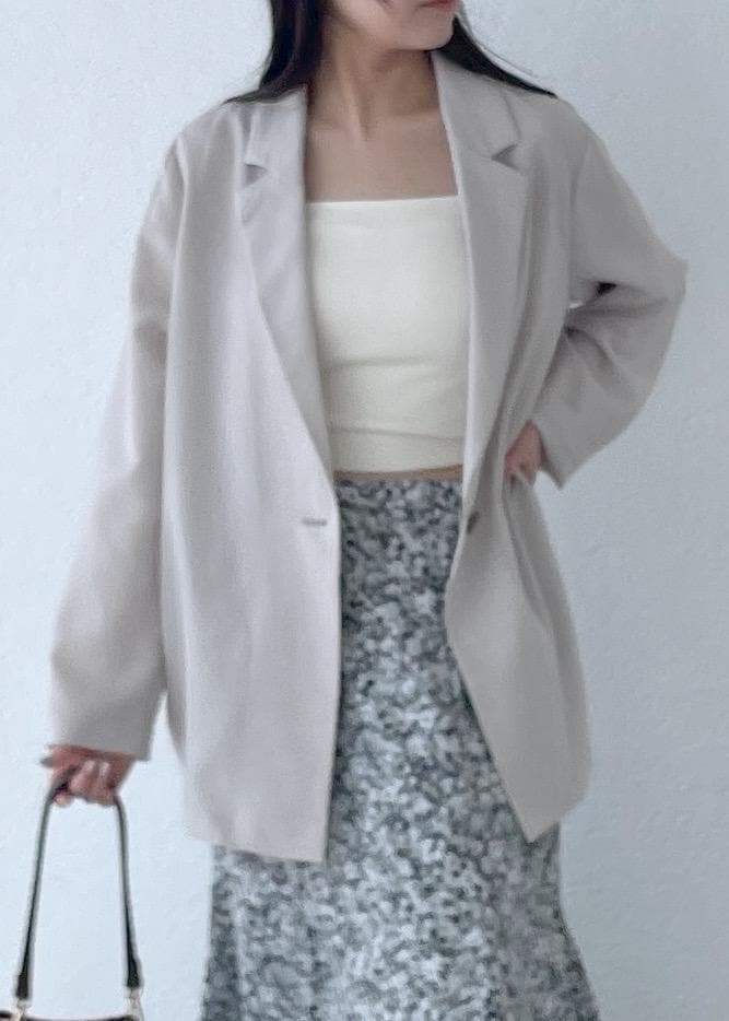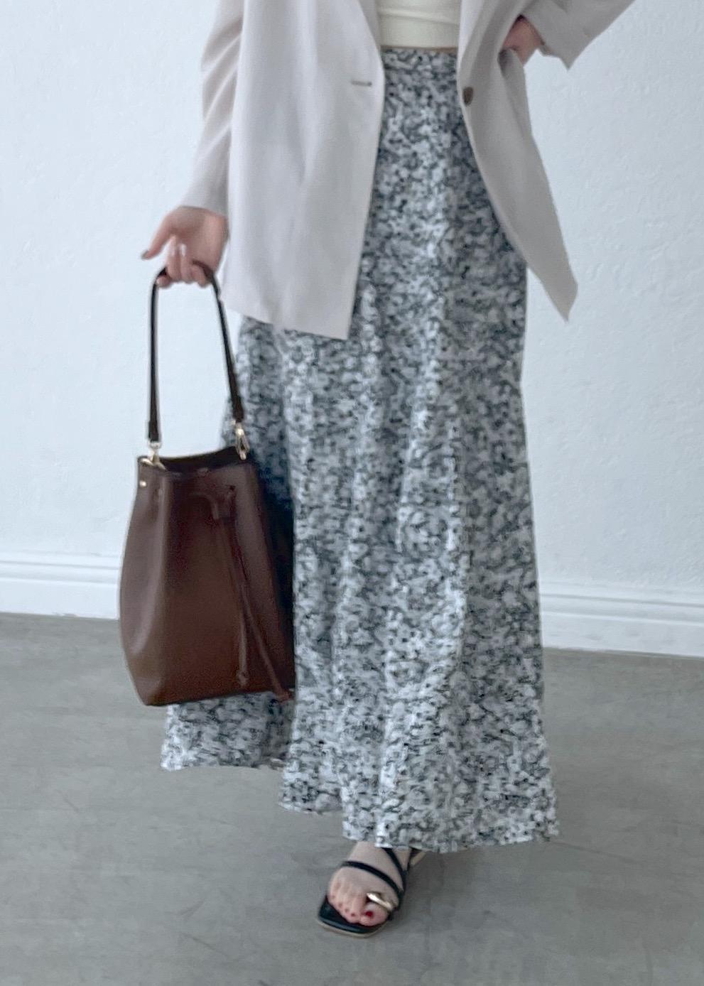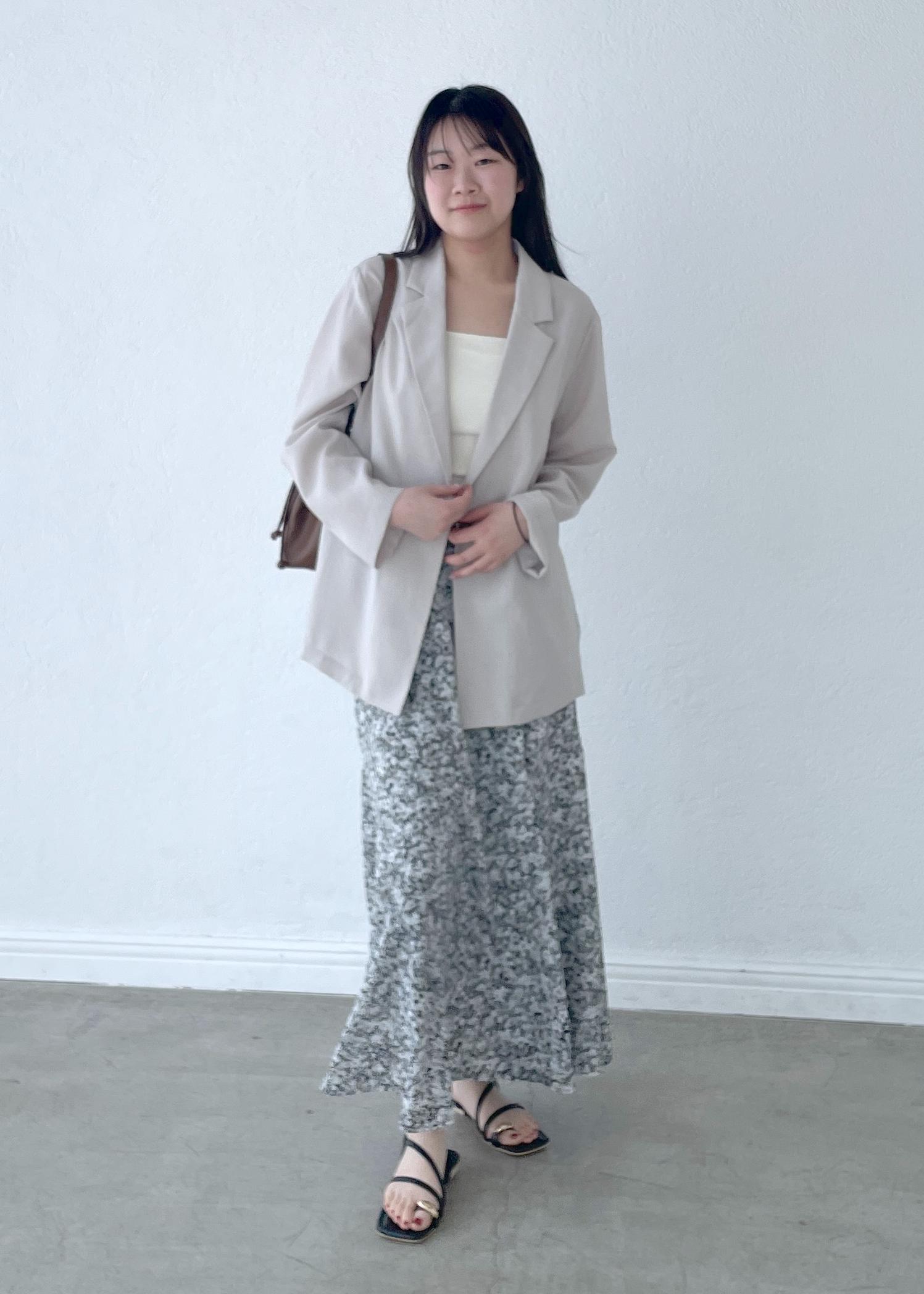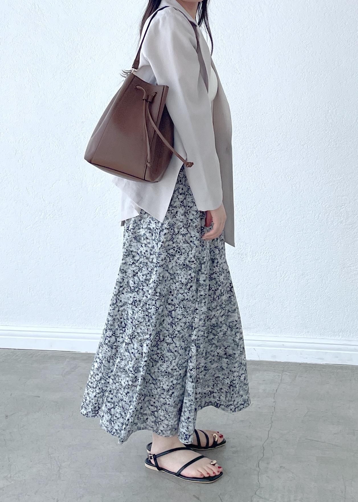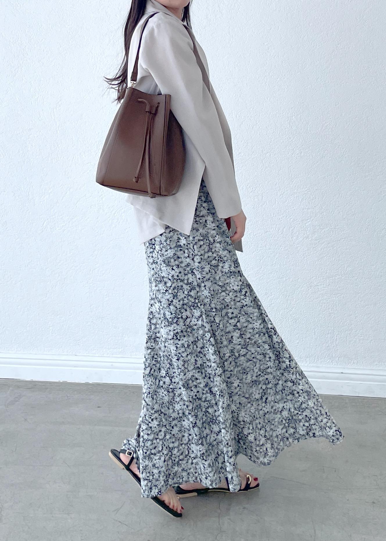 花柄のスカートを主役に大きめなシルエットのジャケットを羽織った大人らしいコーディネートです。