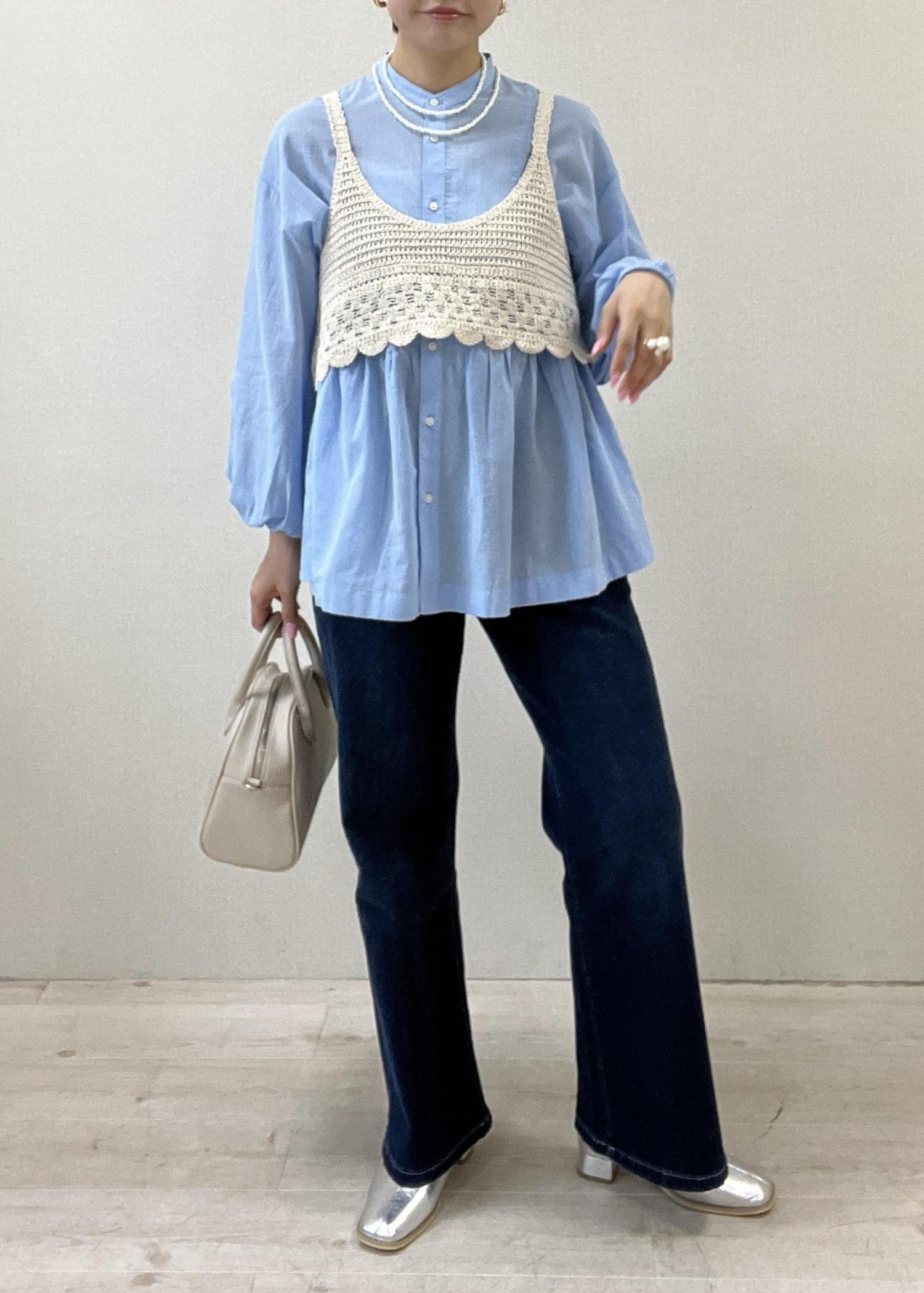 シャツとデニムパンツを合わせたワントーンコーデ。