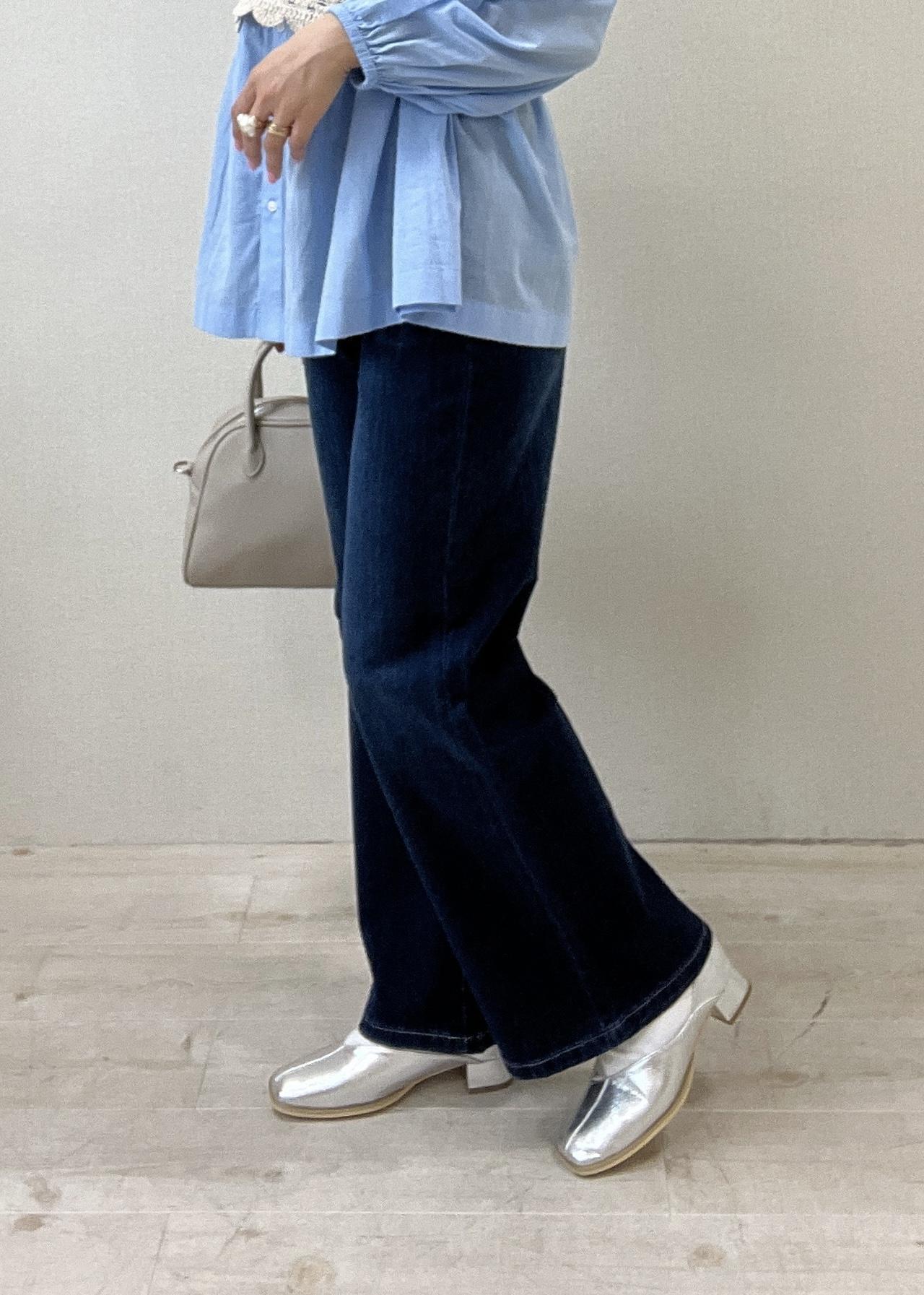 ブルーの色味と相性抜群のシルバーを足下に合わせて、