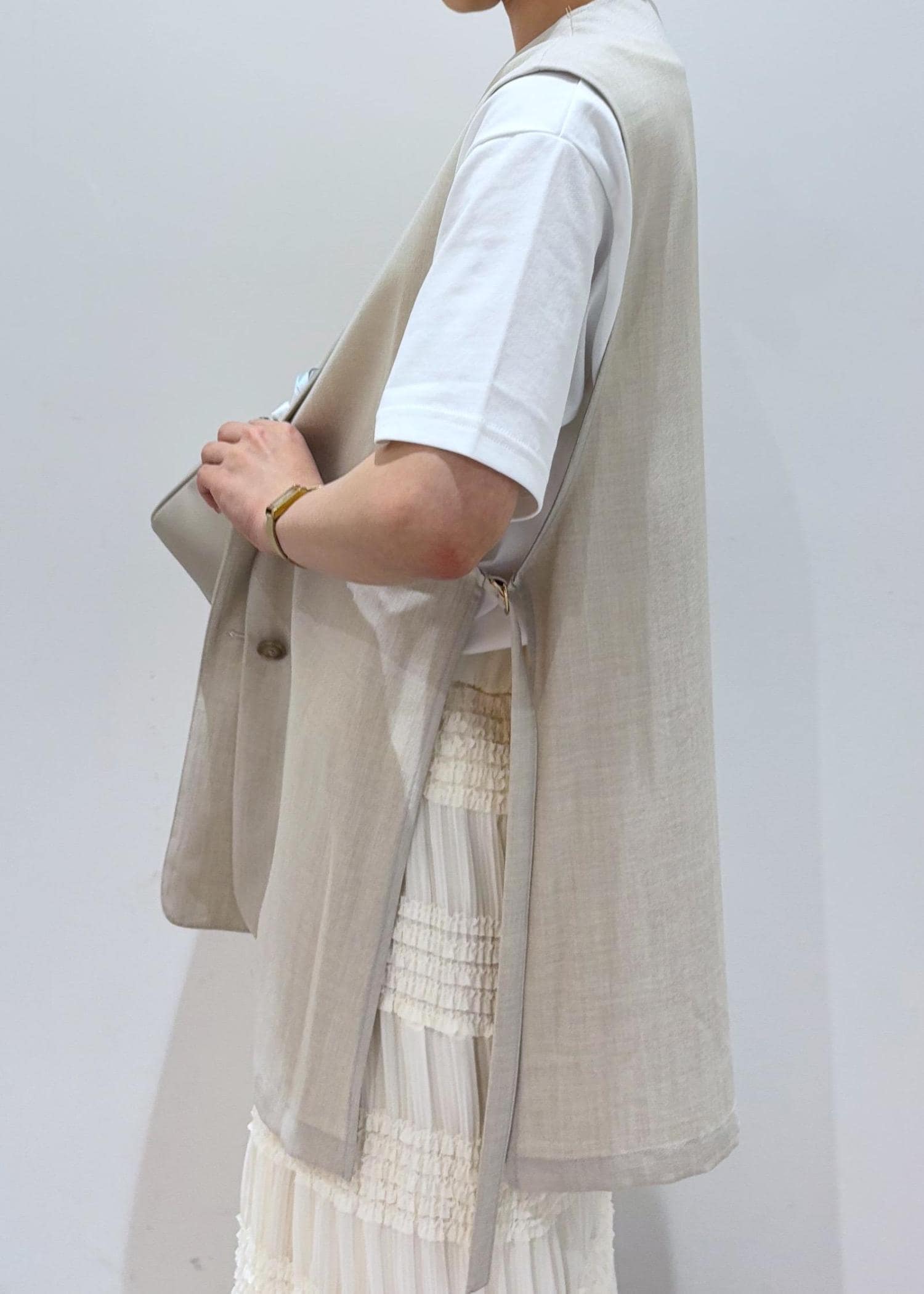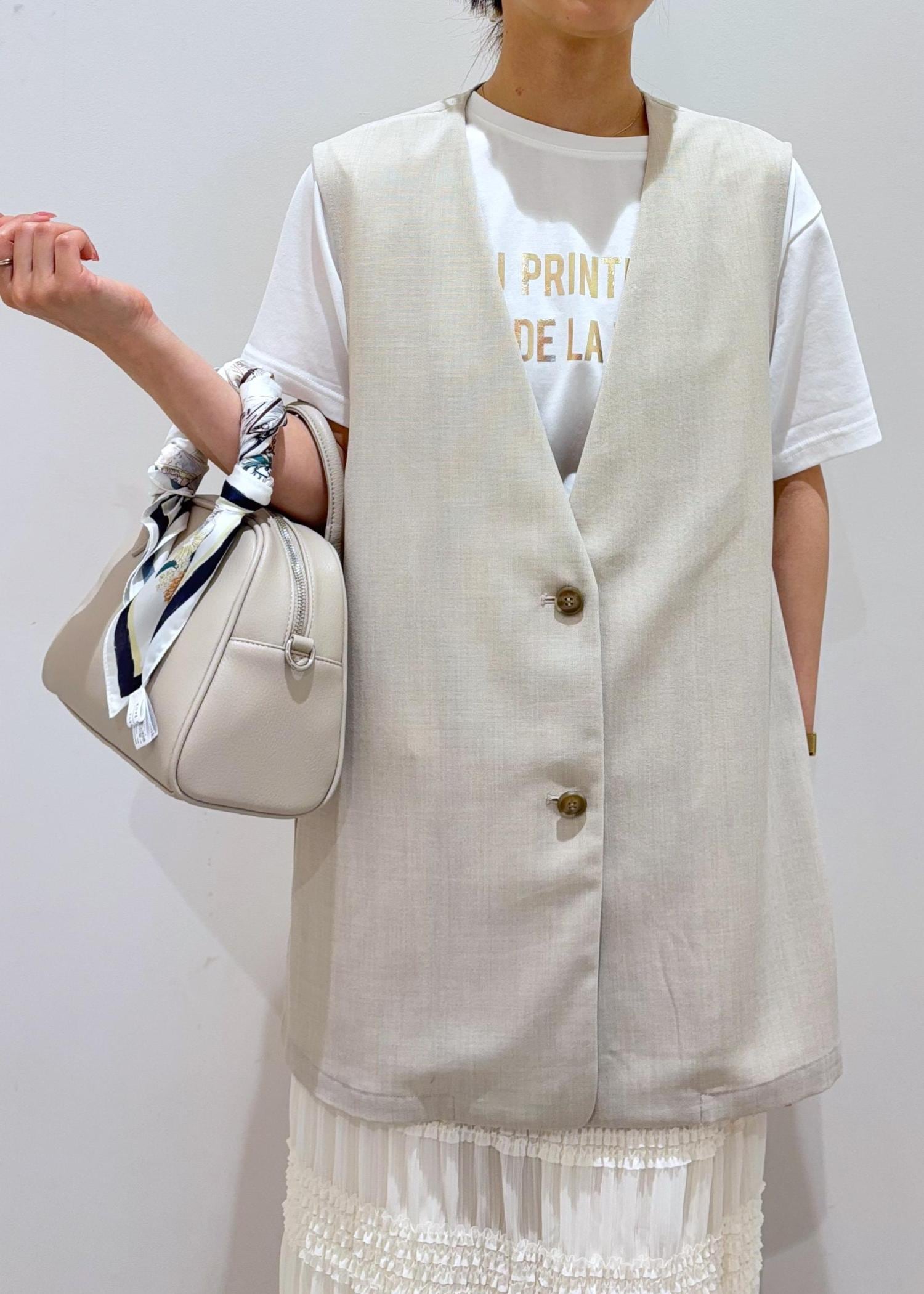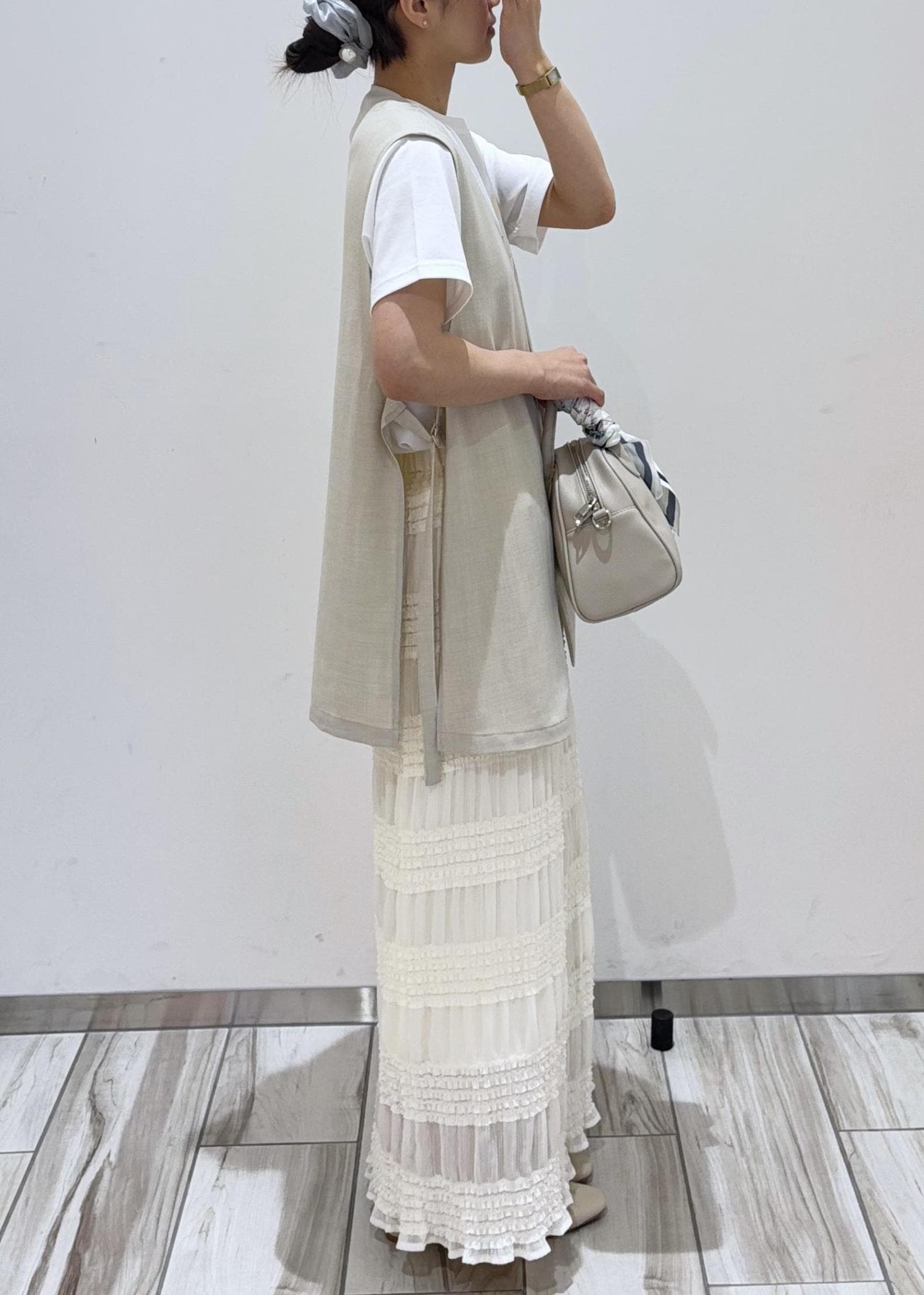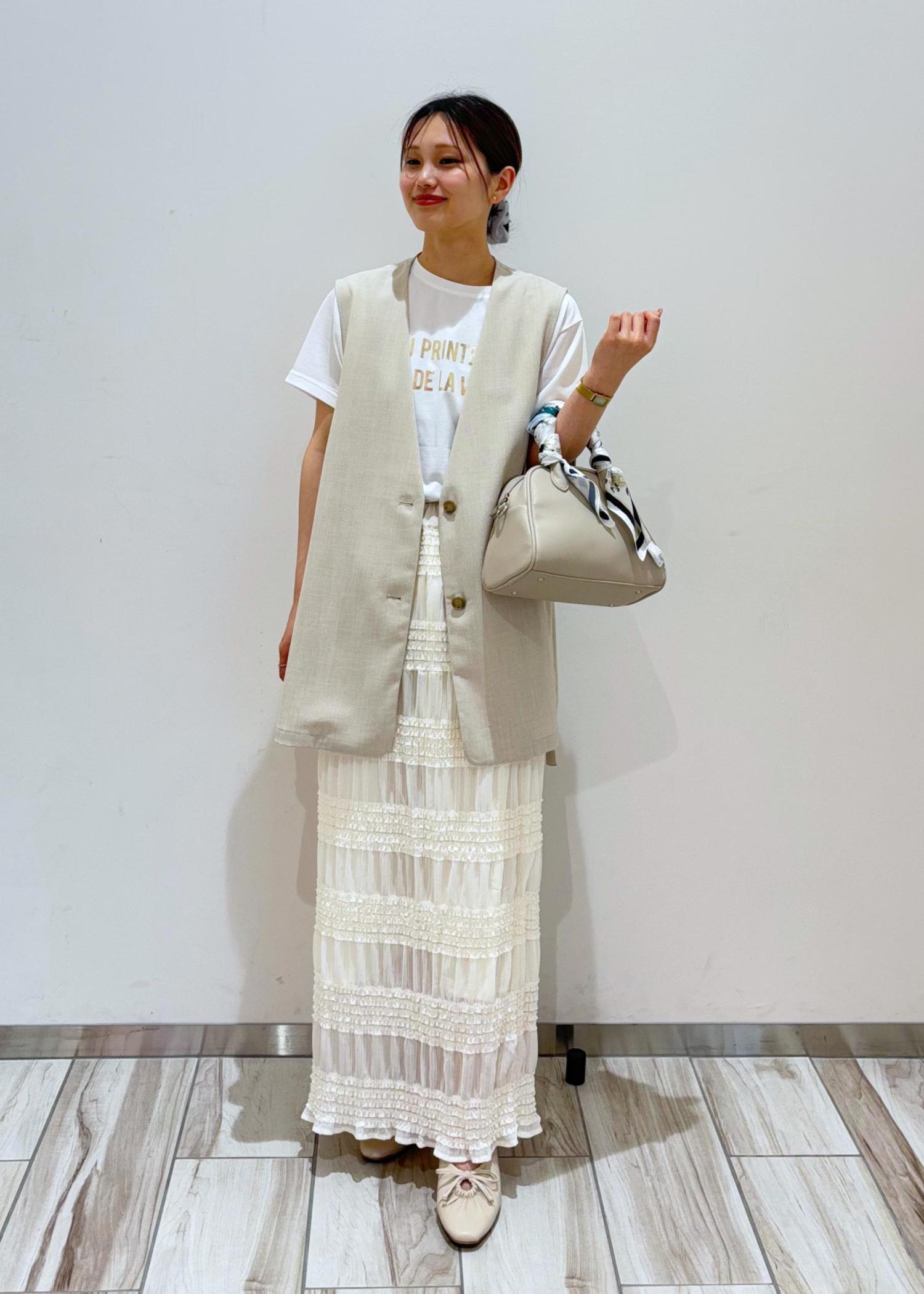 Tシャツとスカートだけではシンプルなコーディネートもジレを羽織るだけでおしゃれに♪デニムとも相性抜群です◎