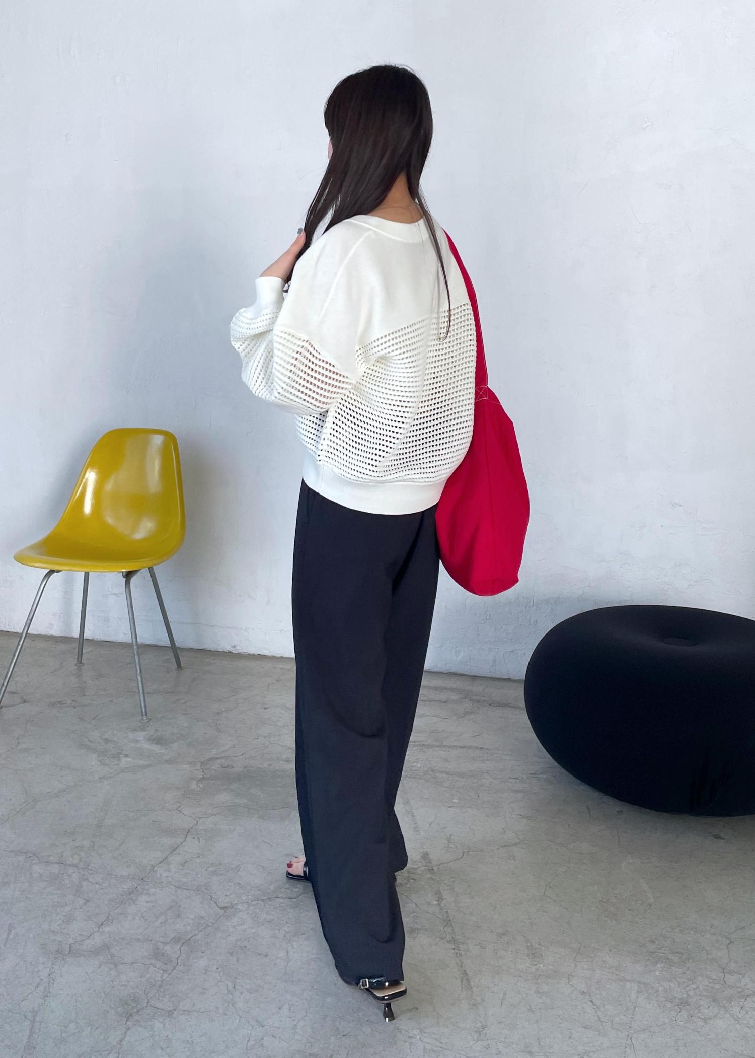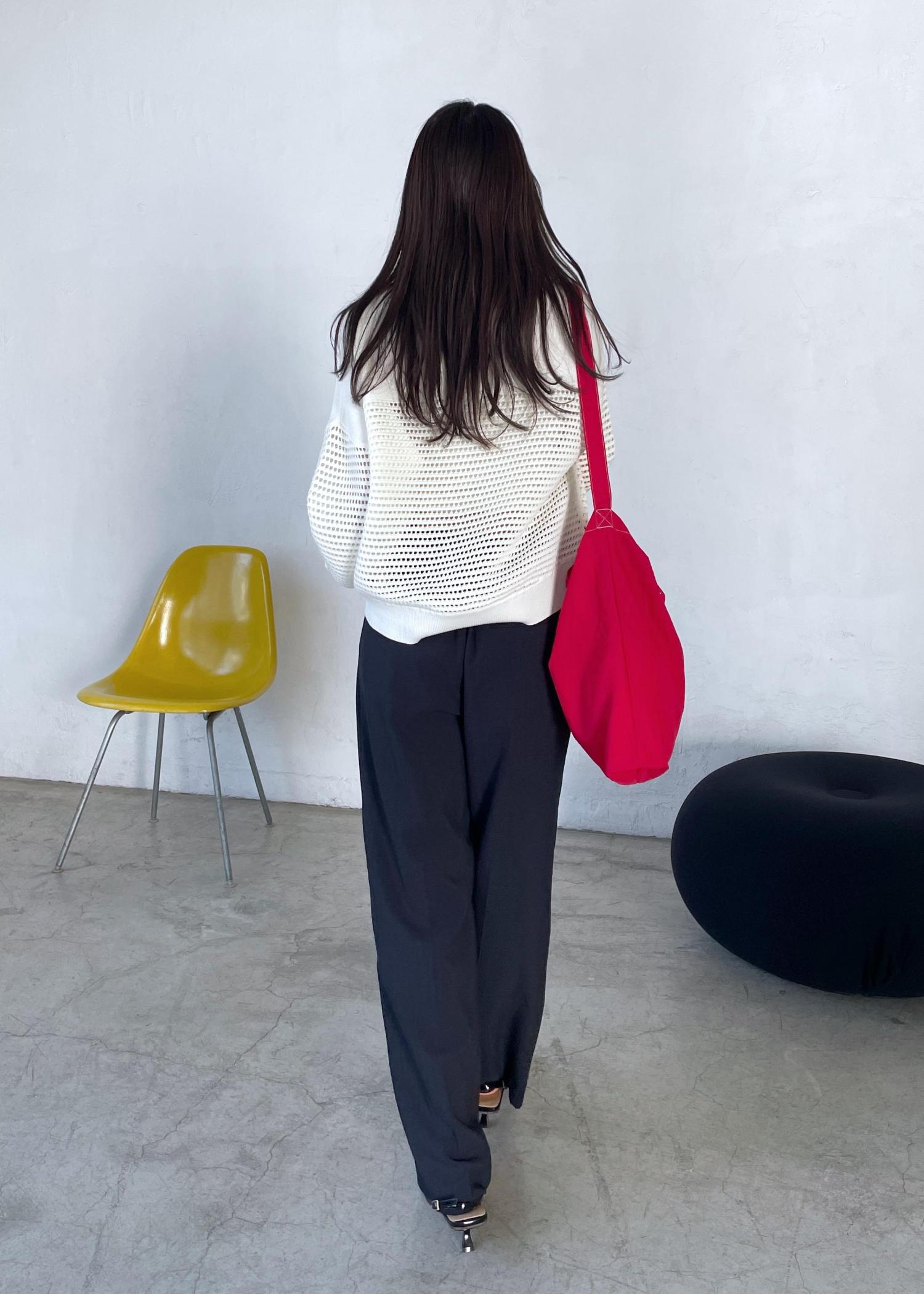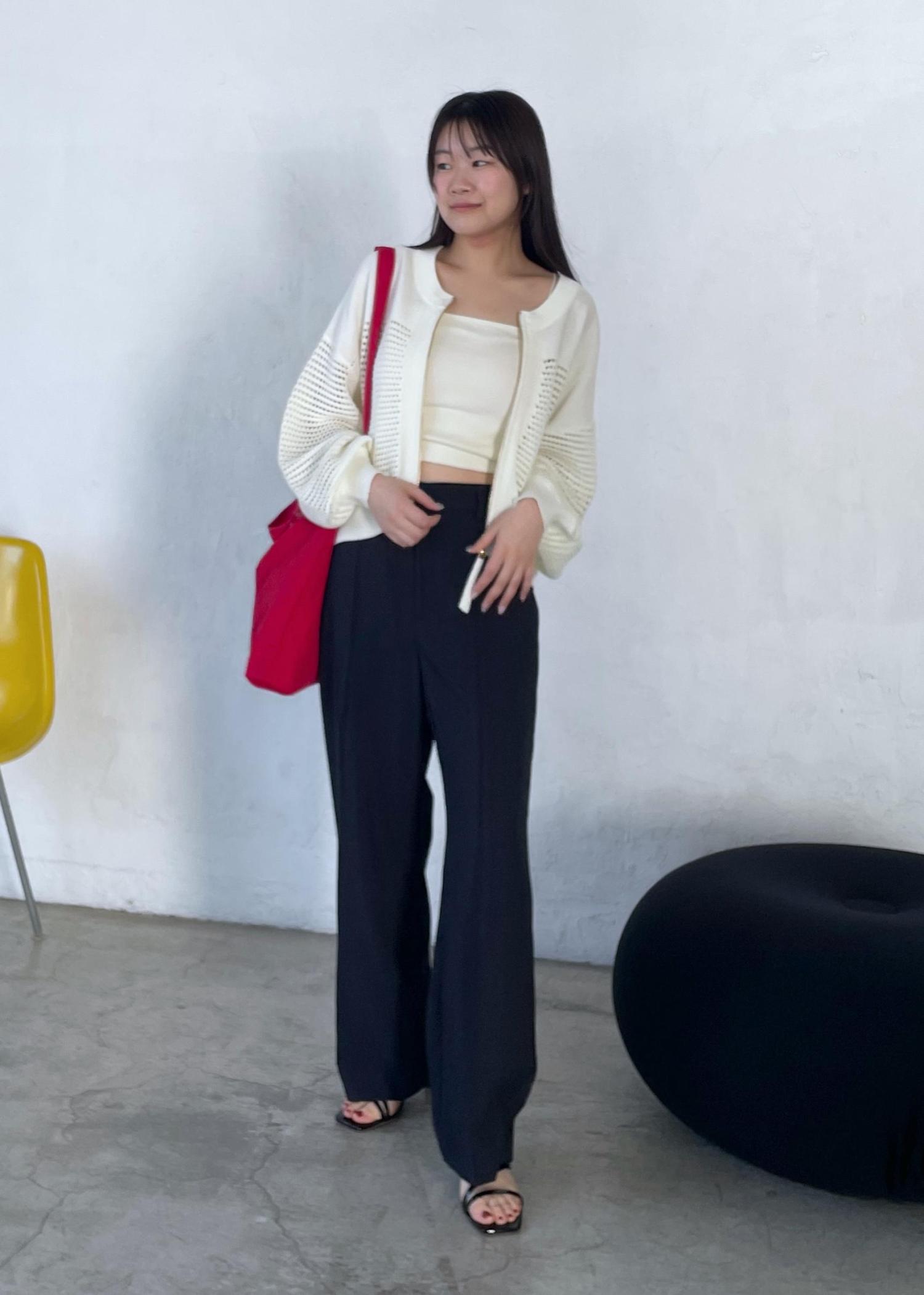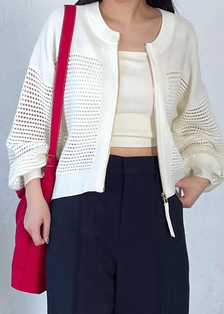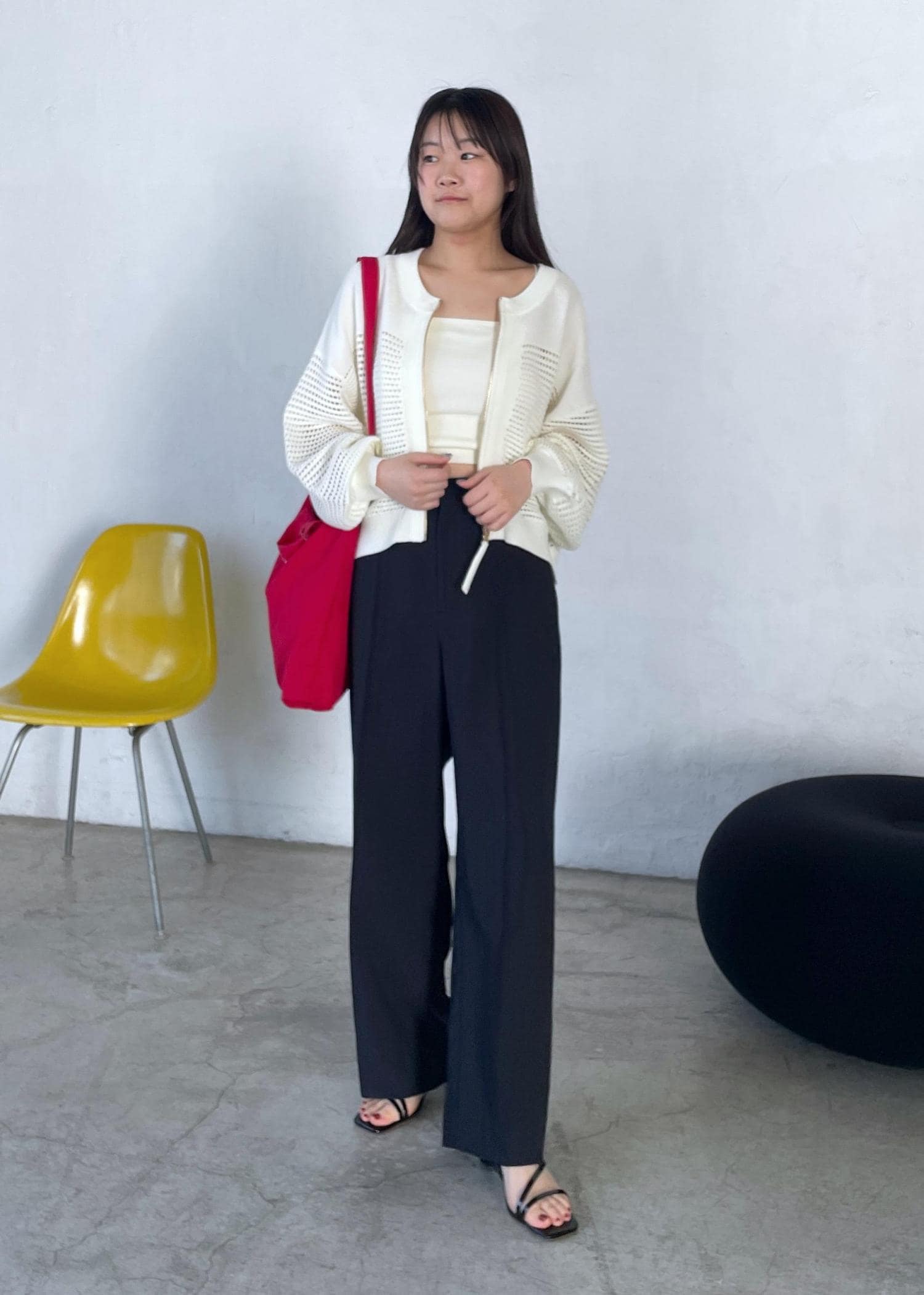 編み目が大きいカーディガンが涼しげな印象のコーディネートです。