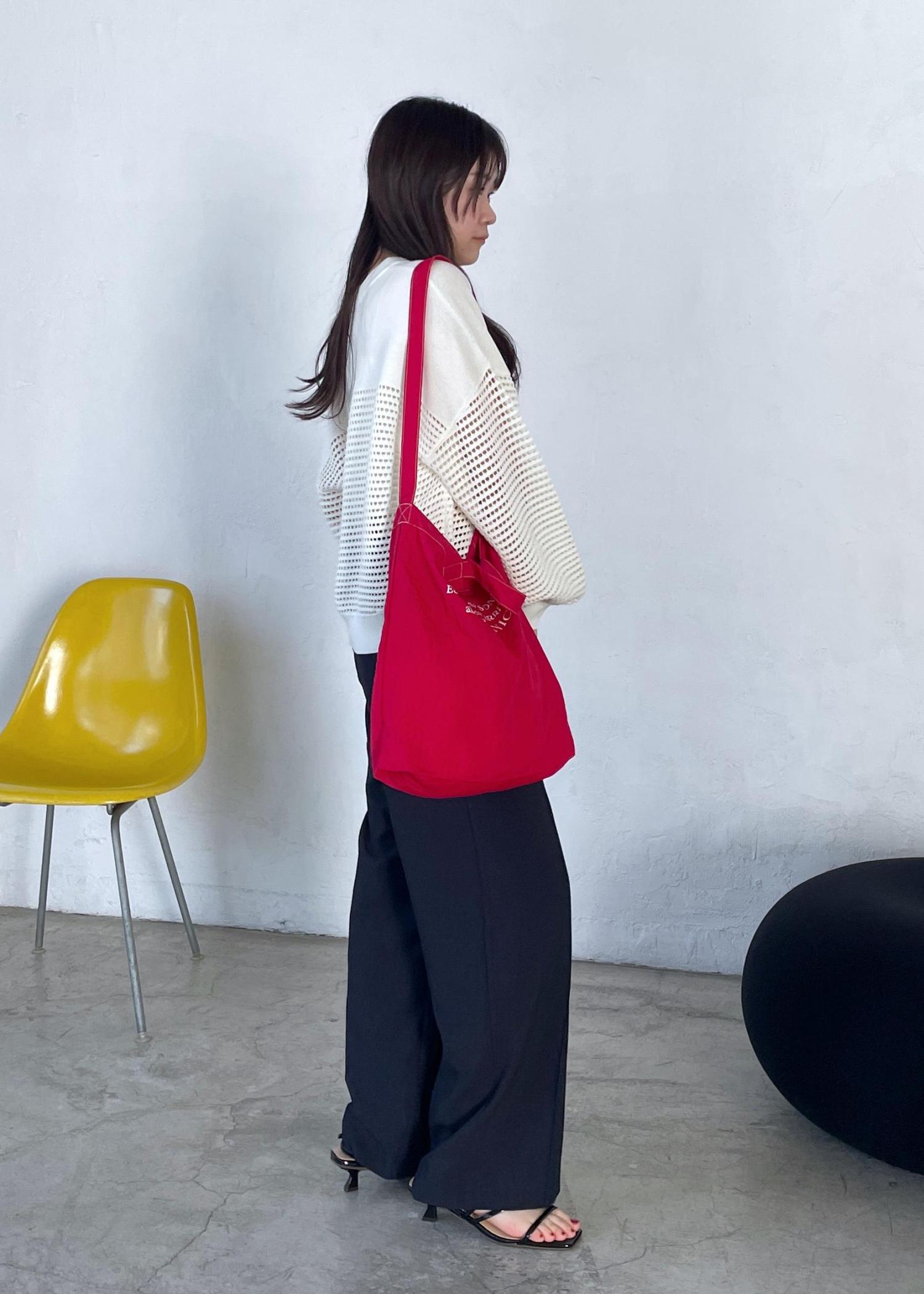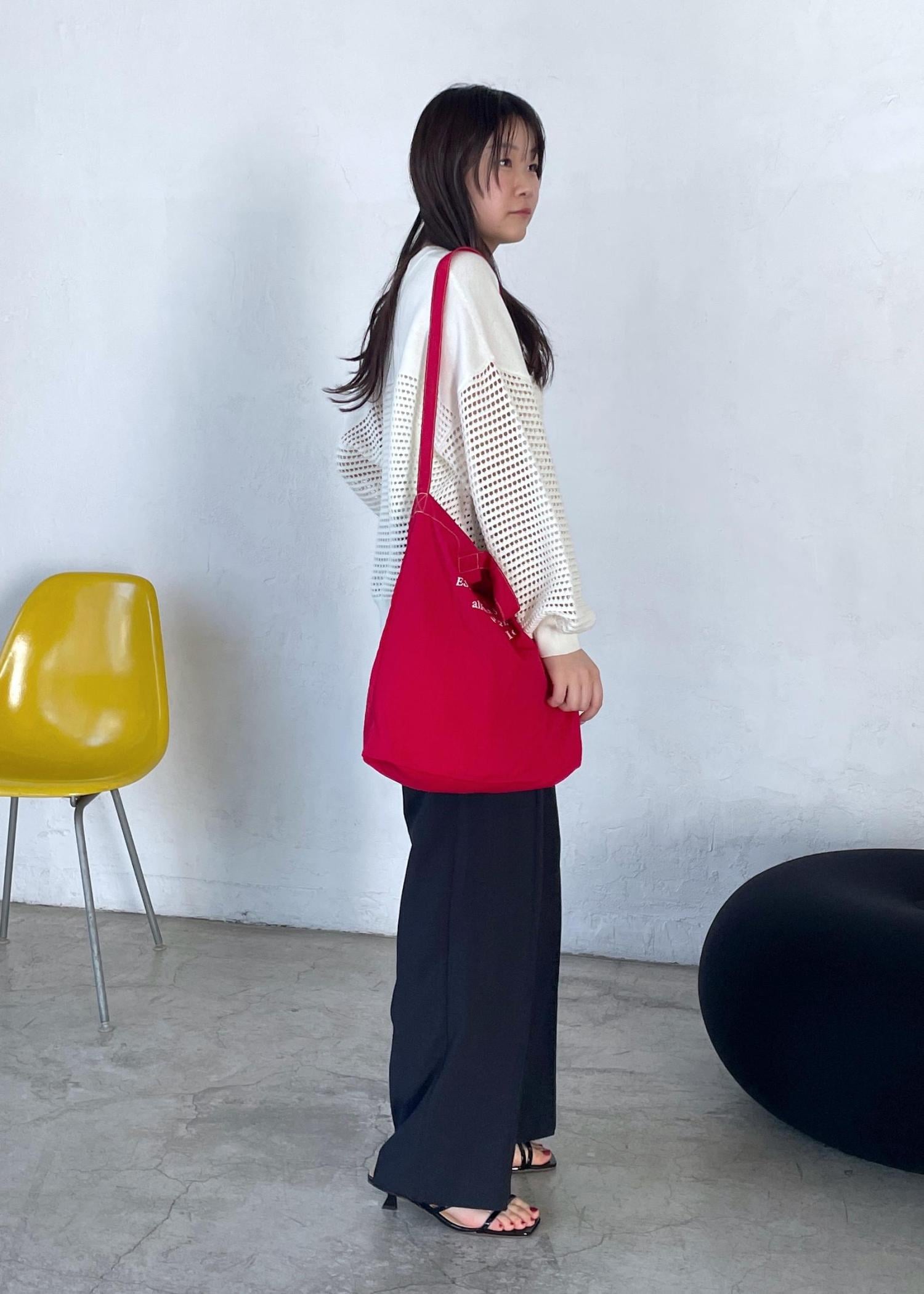 赤のバッグを持ち、コーディネートに差し色をプラス。