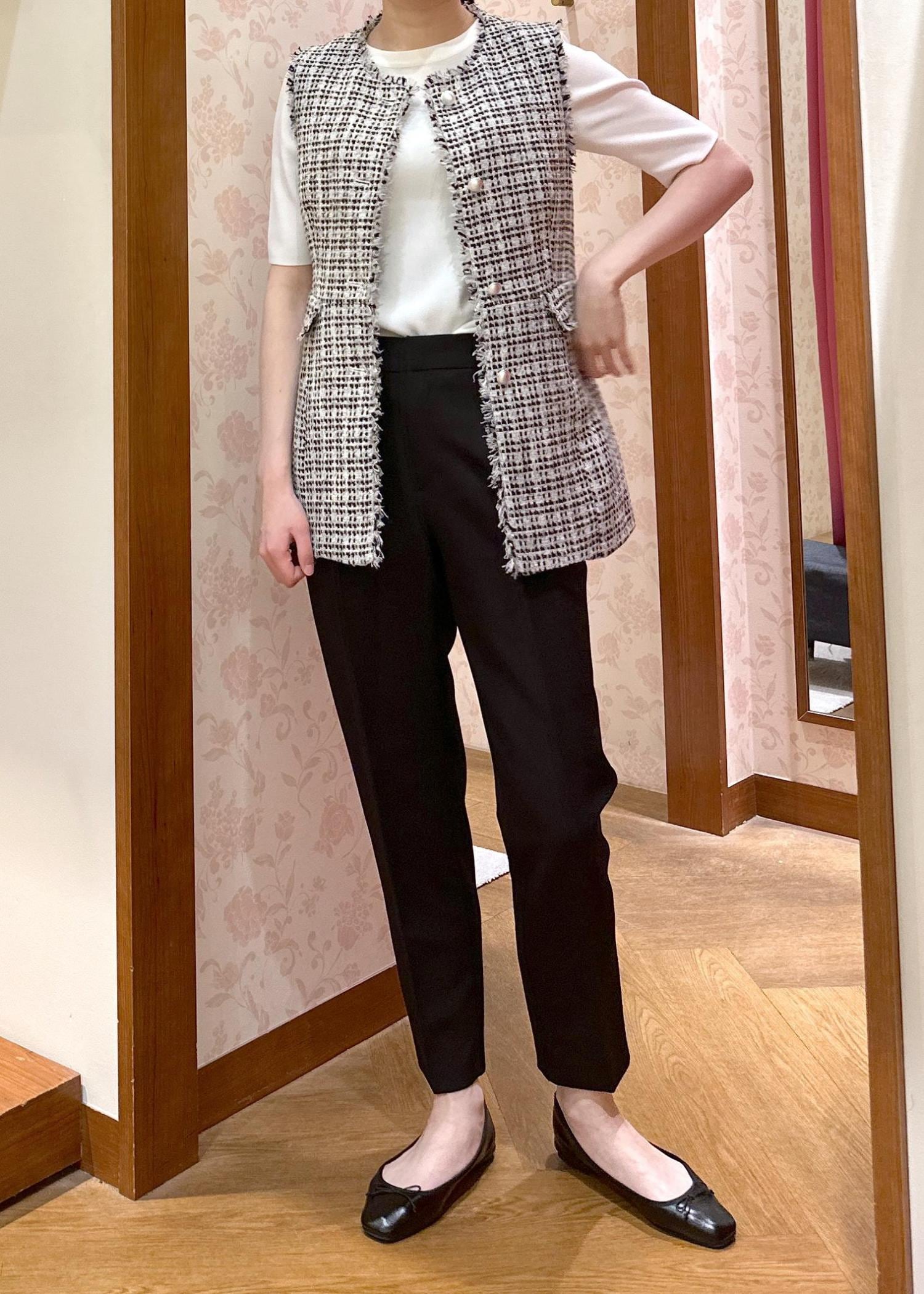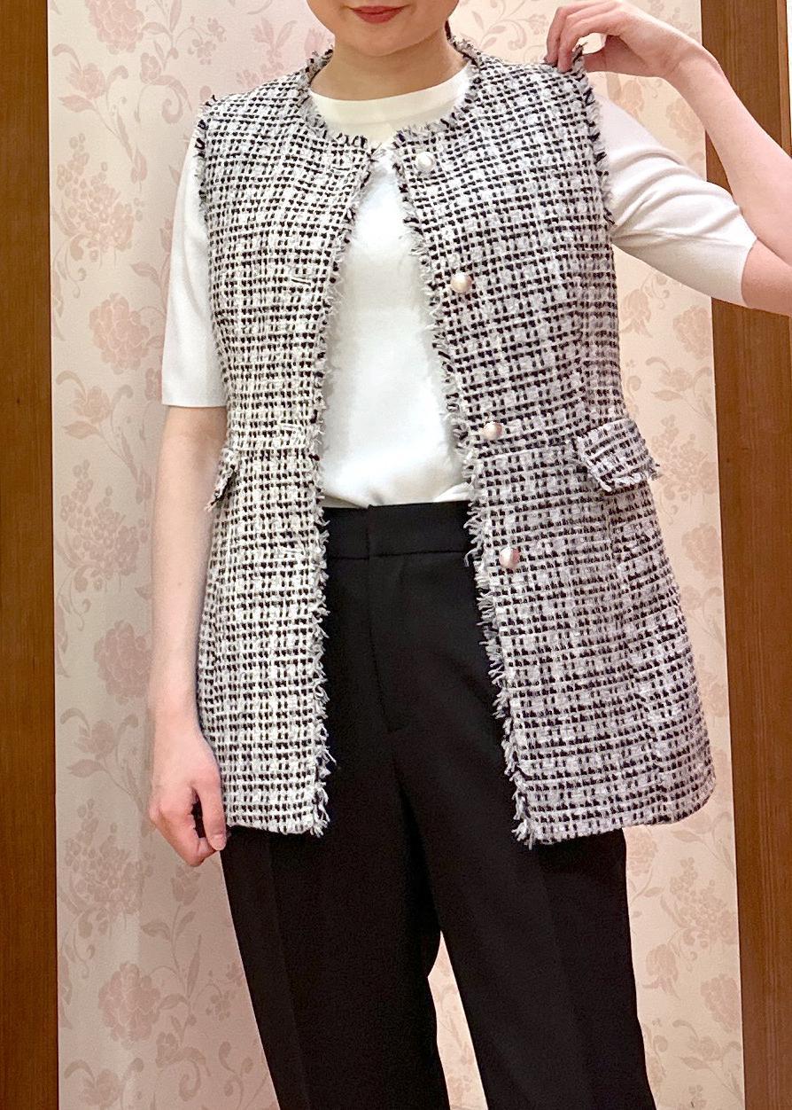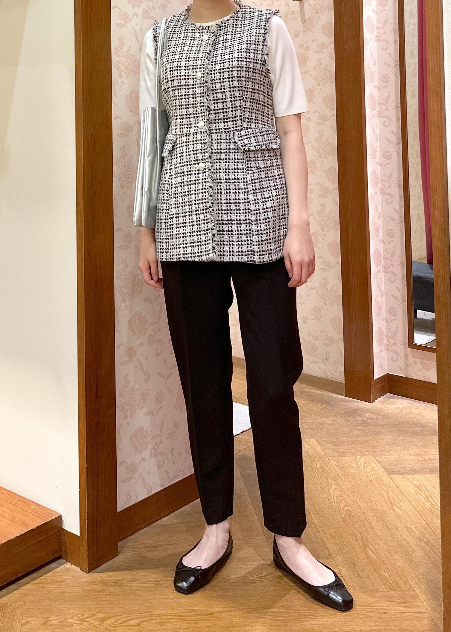 羽織るだけで一気に華やかになれるだけではなく、半袖にも着れます!今回はジレのラインを綺麗にだすためにタイトなプルオーバーと合わせてみました。