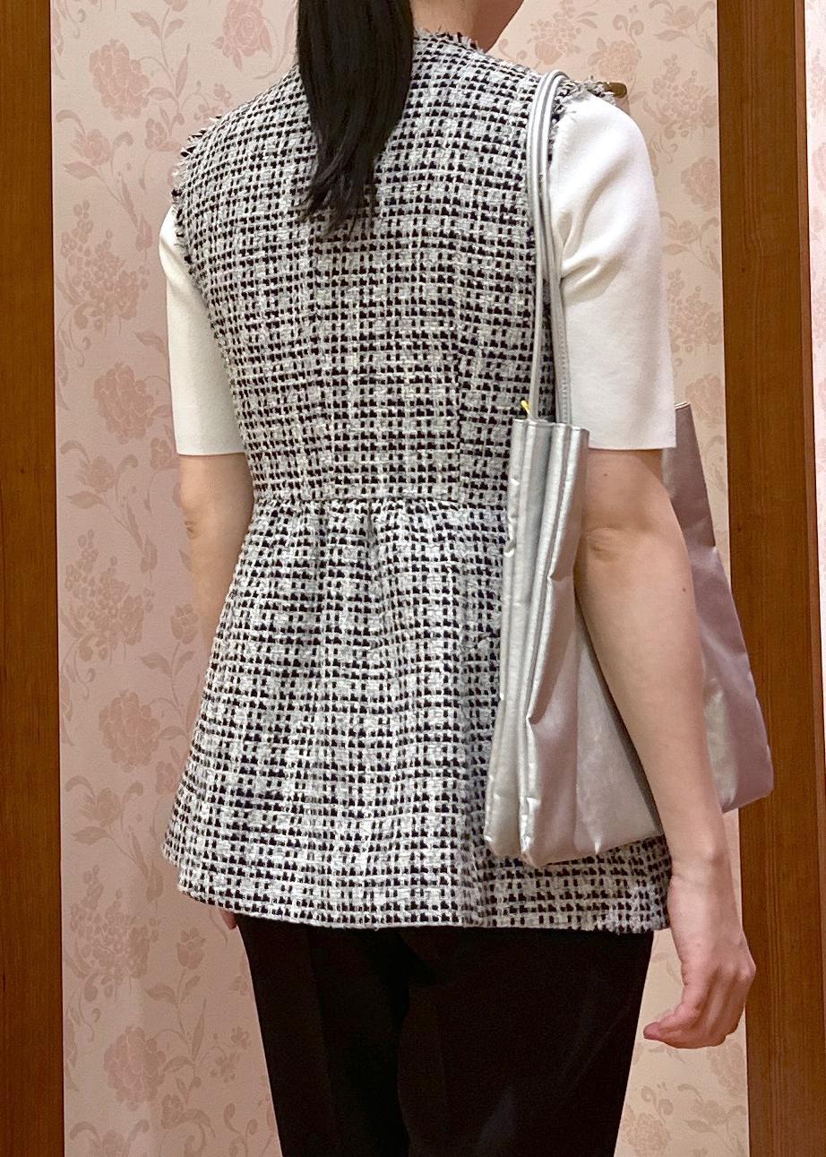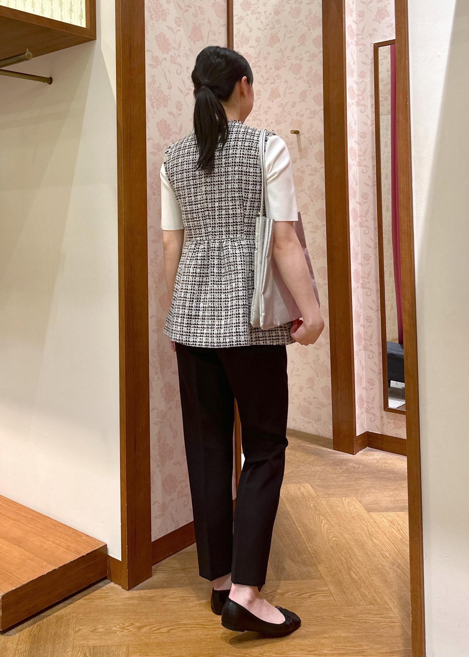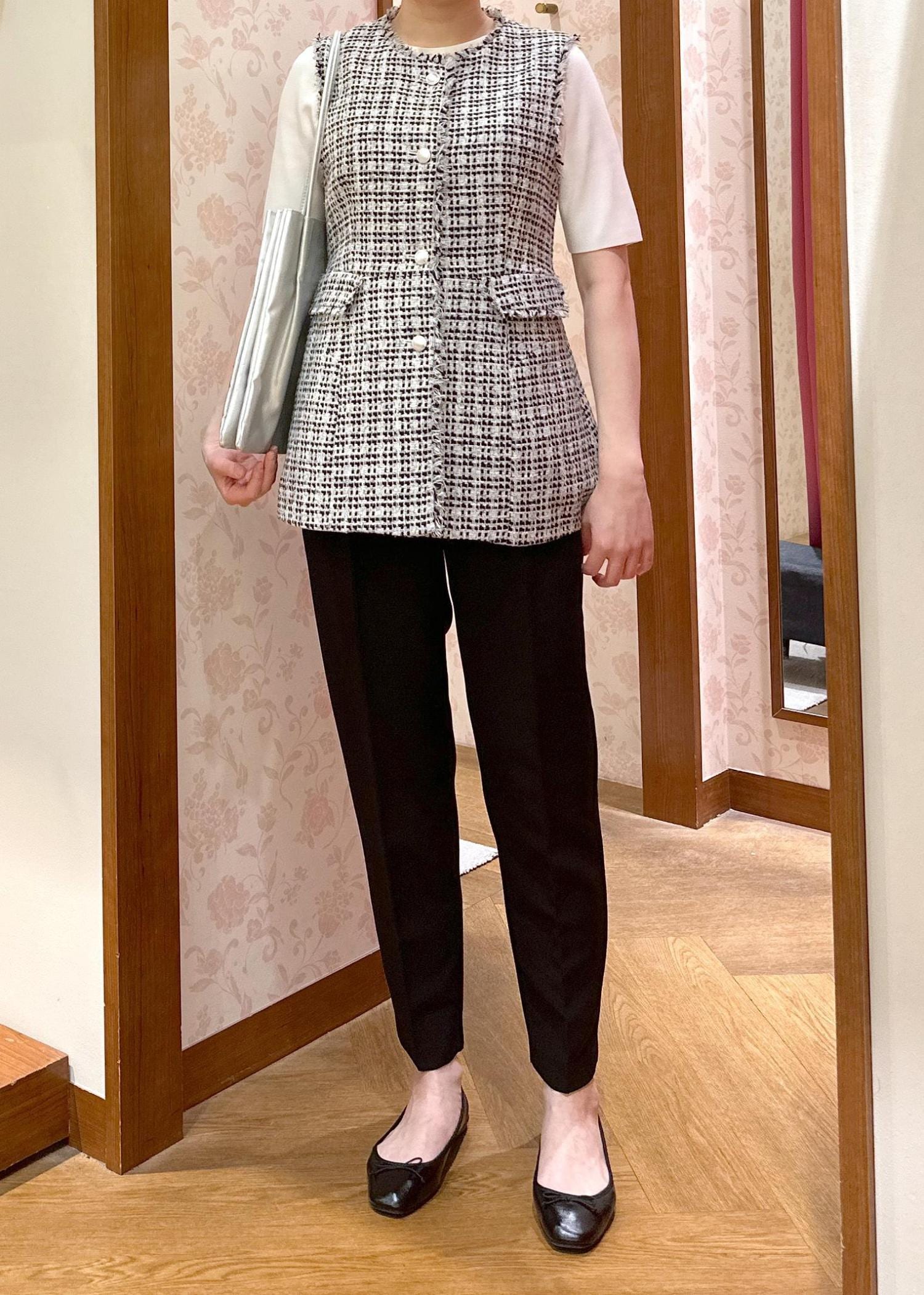 羽織るだけで一気に華やかになれるだけではなく、半袖にも着れます!今回はジレのラインを綺麗にだすためにタイトなプルオーバーと合わせてみました。