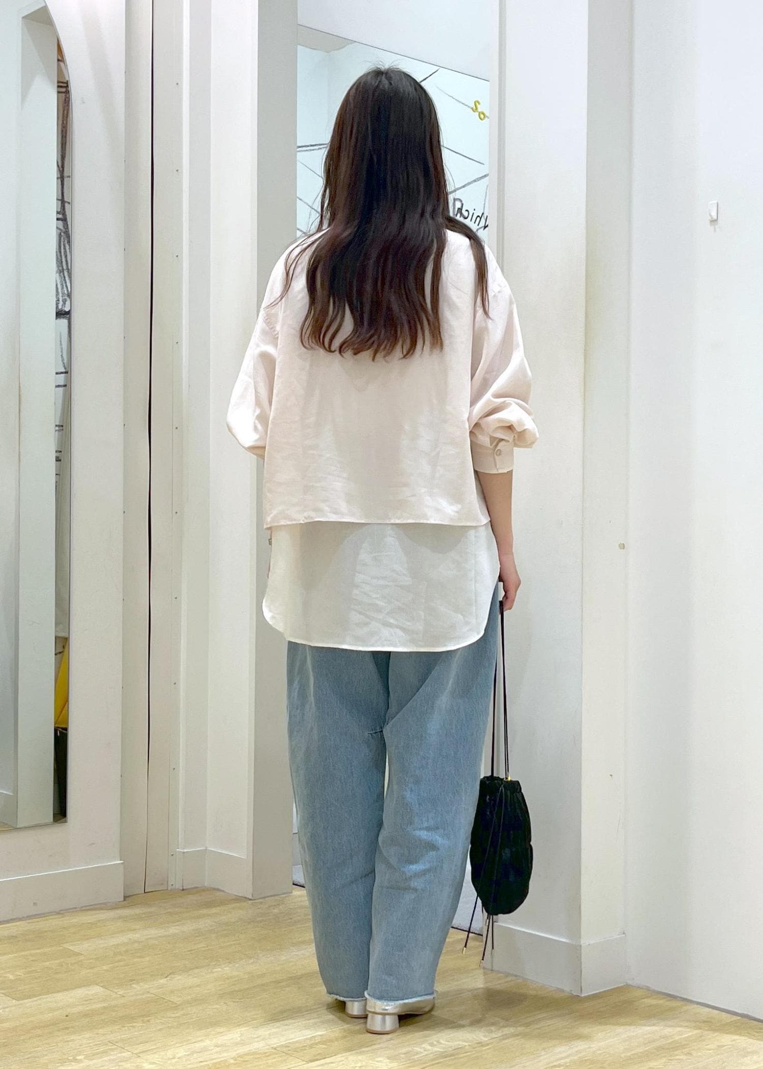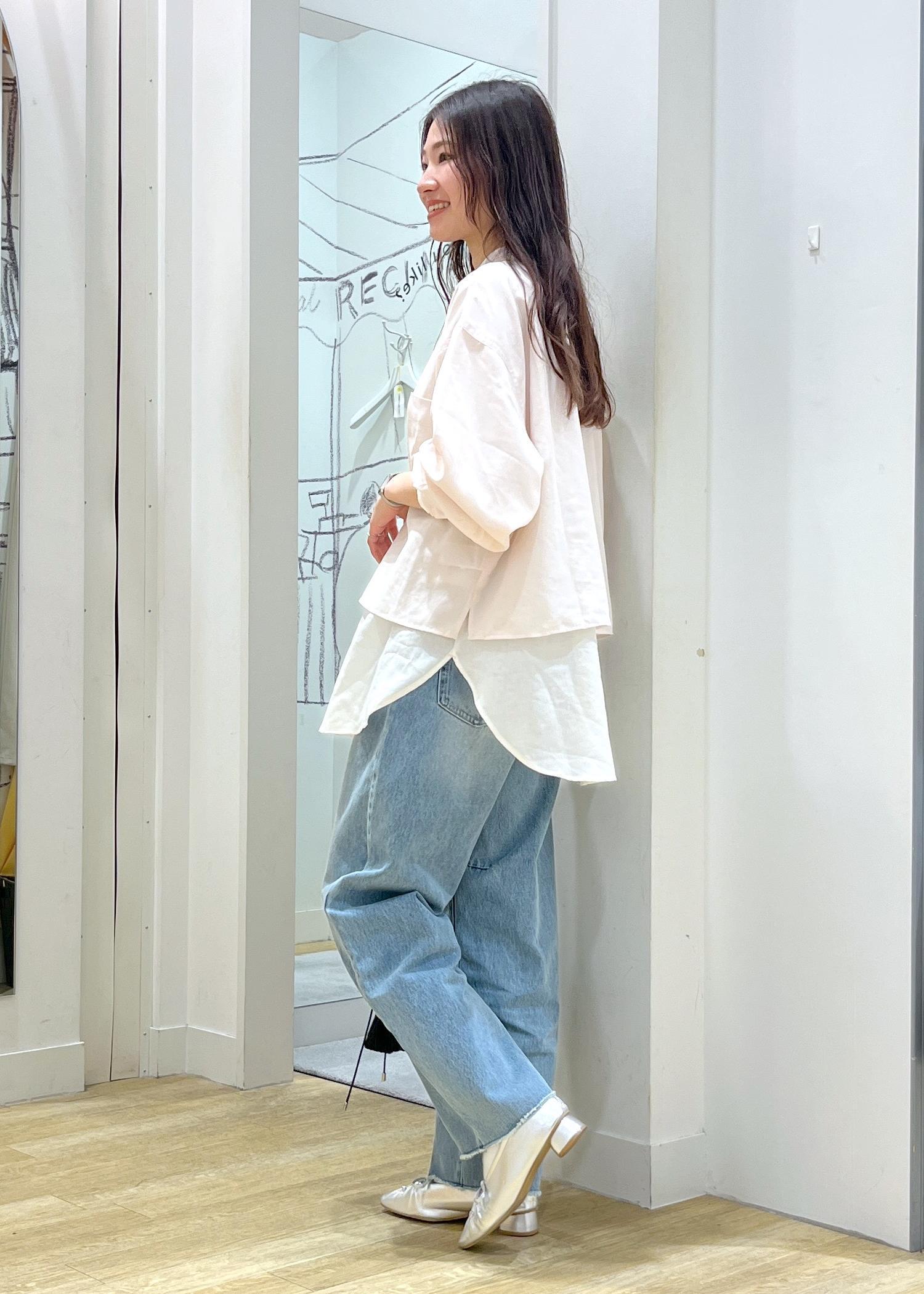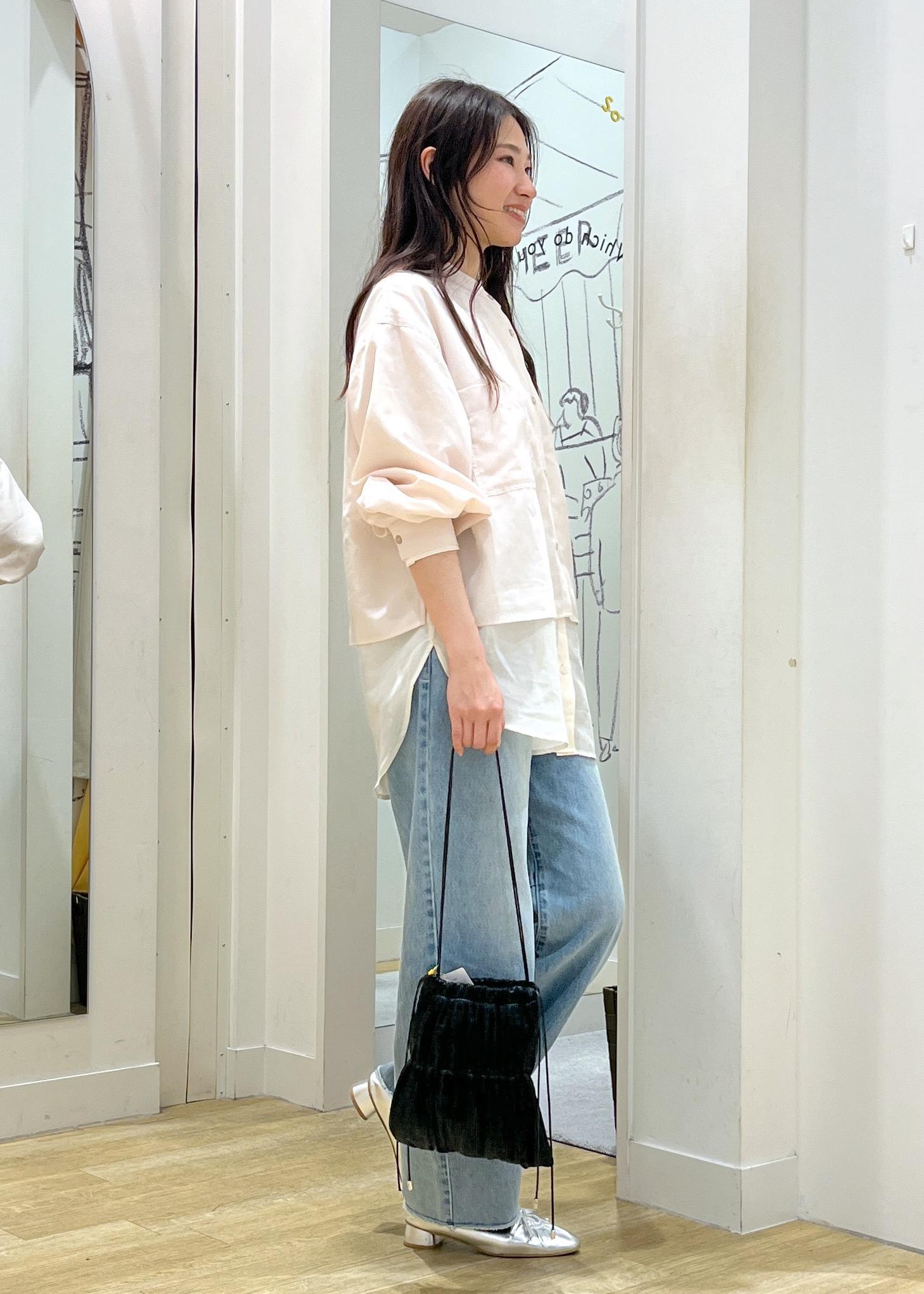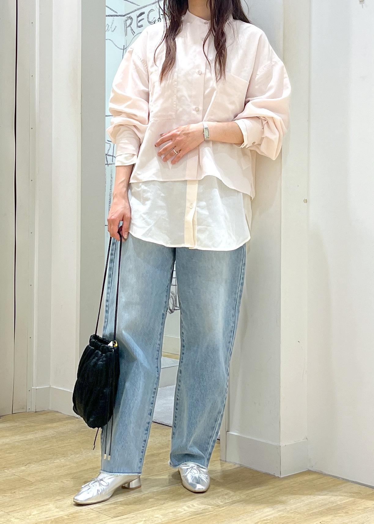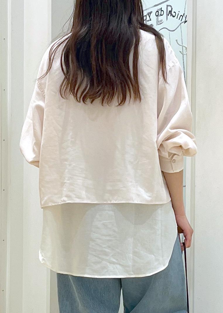 丈の違うシアーシャツを重ねたレイヤードコーデです。