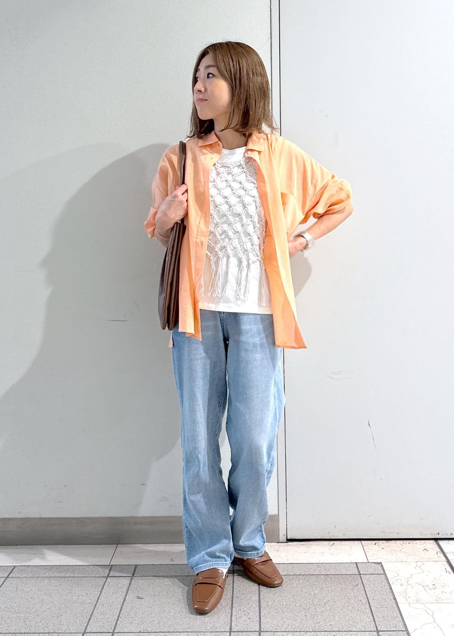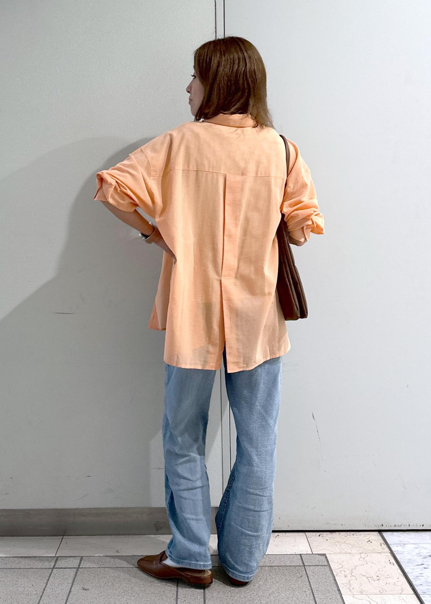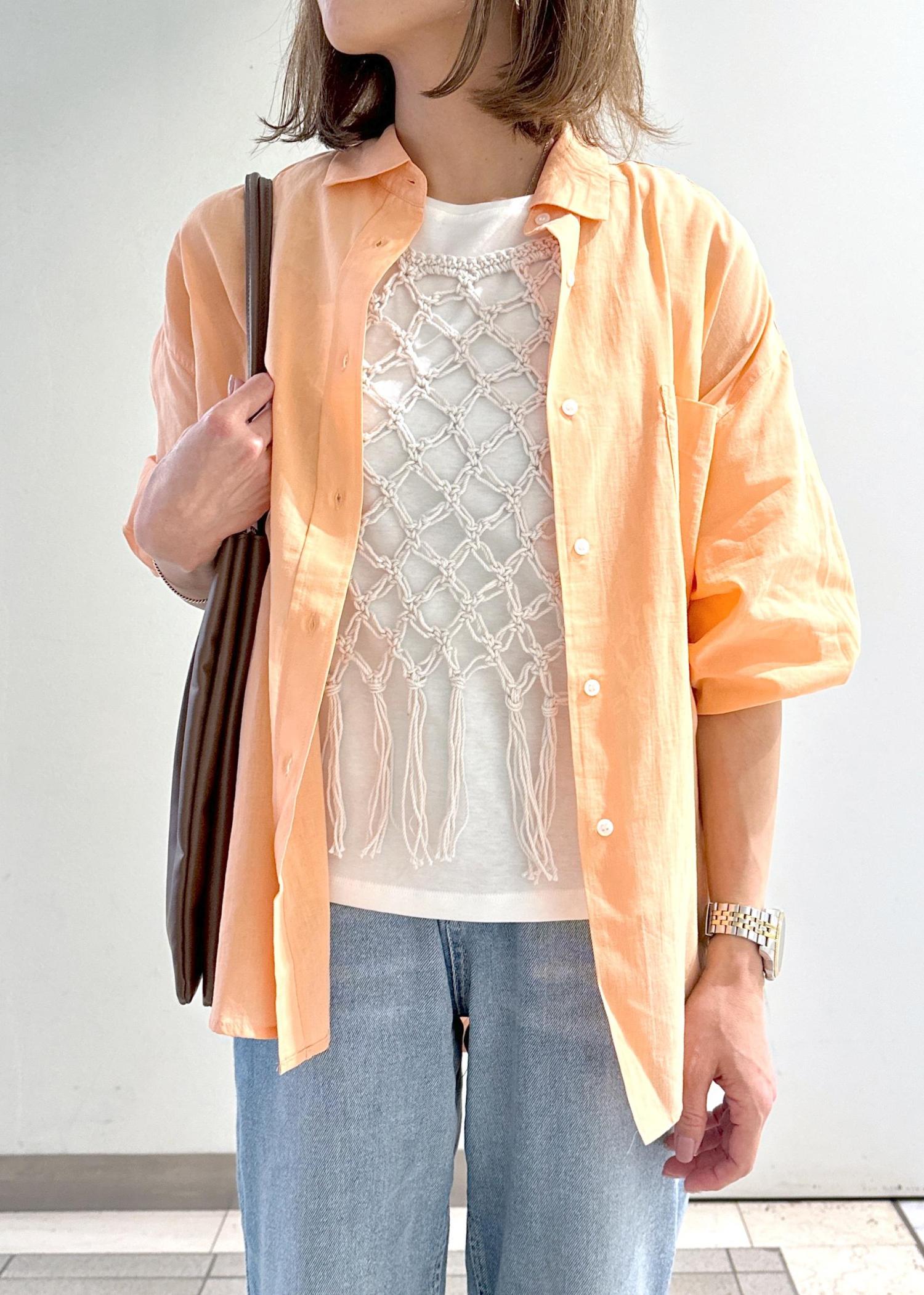 オーバーサイズでゆったりとしたサイズ感なので体のラインを拾いません。とても軽やかな着心地で、接触冷感機能もついていて夏まで使えるアイテムです。