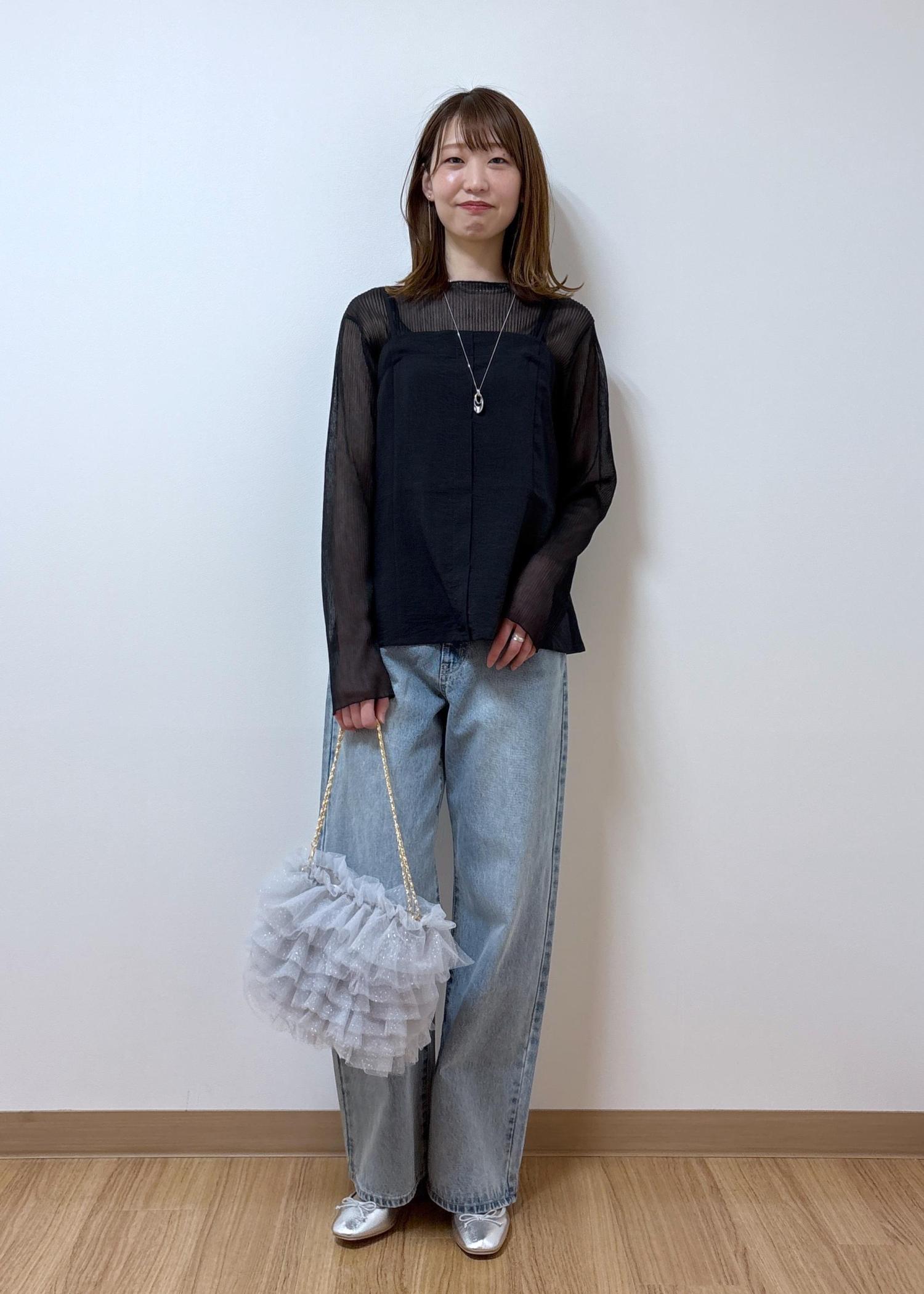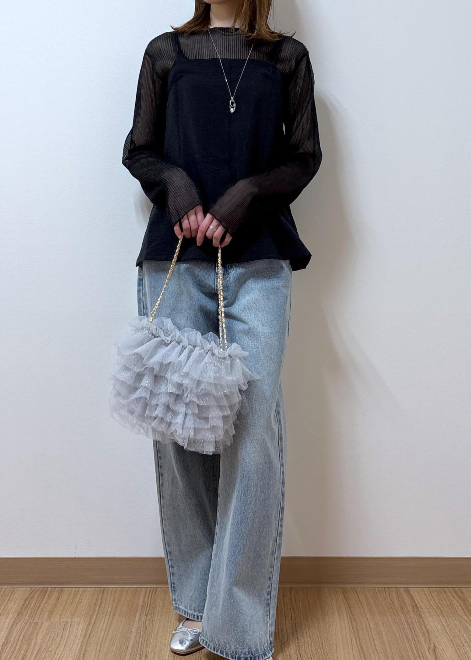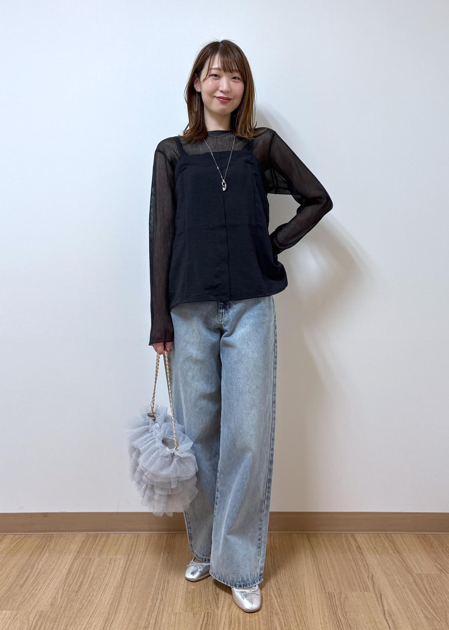 カジュアルですが、透け感のあるラメトップスで抜け感のある大人カジュアルなスタイリングです。