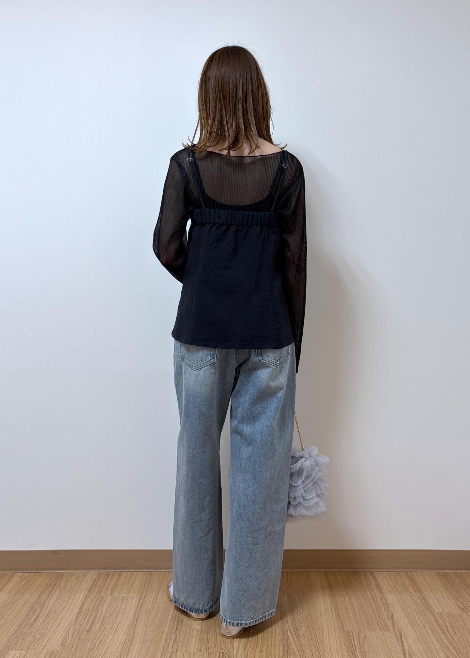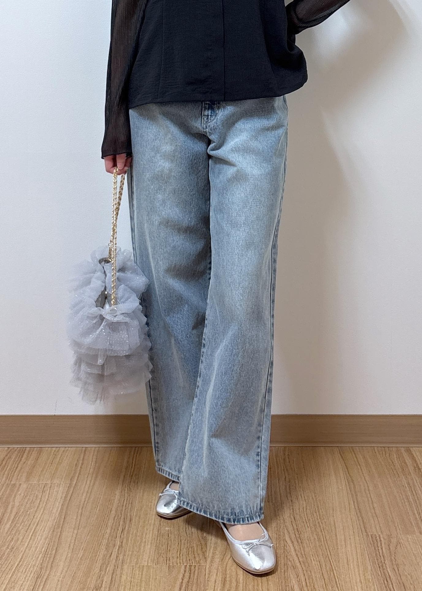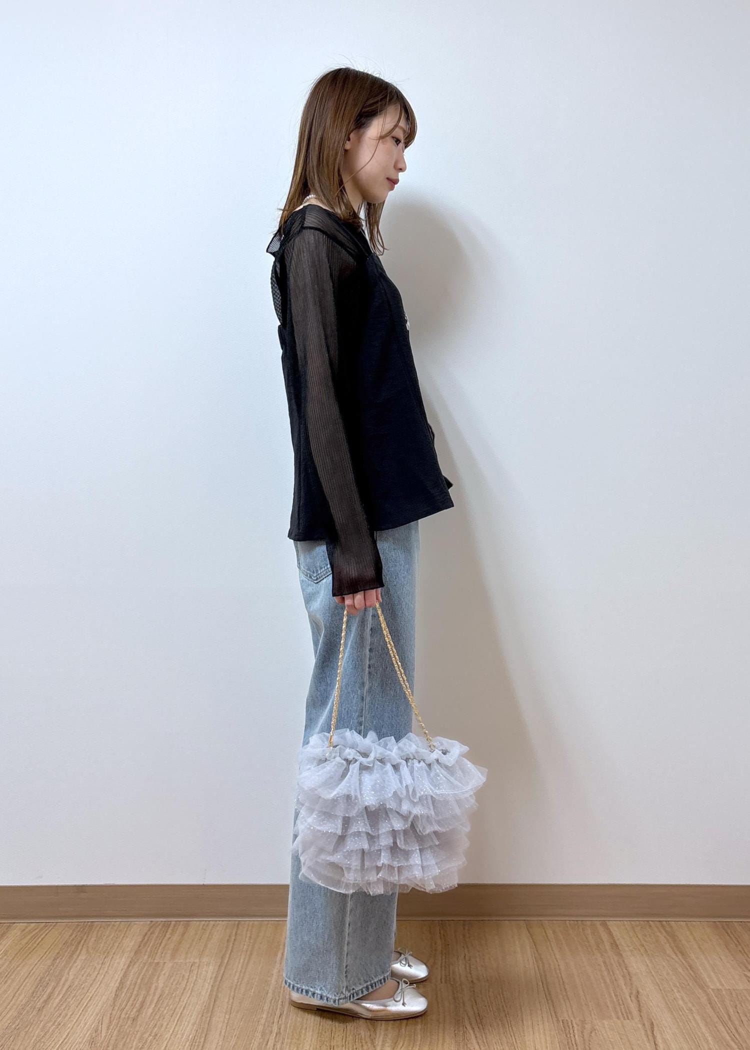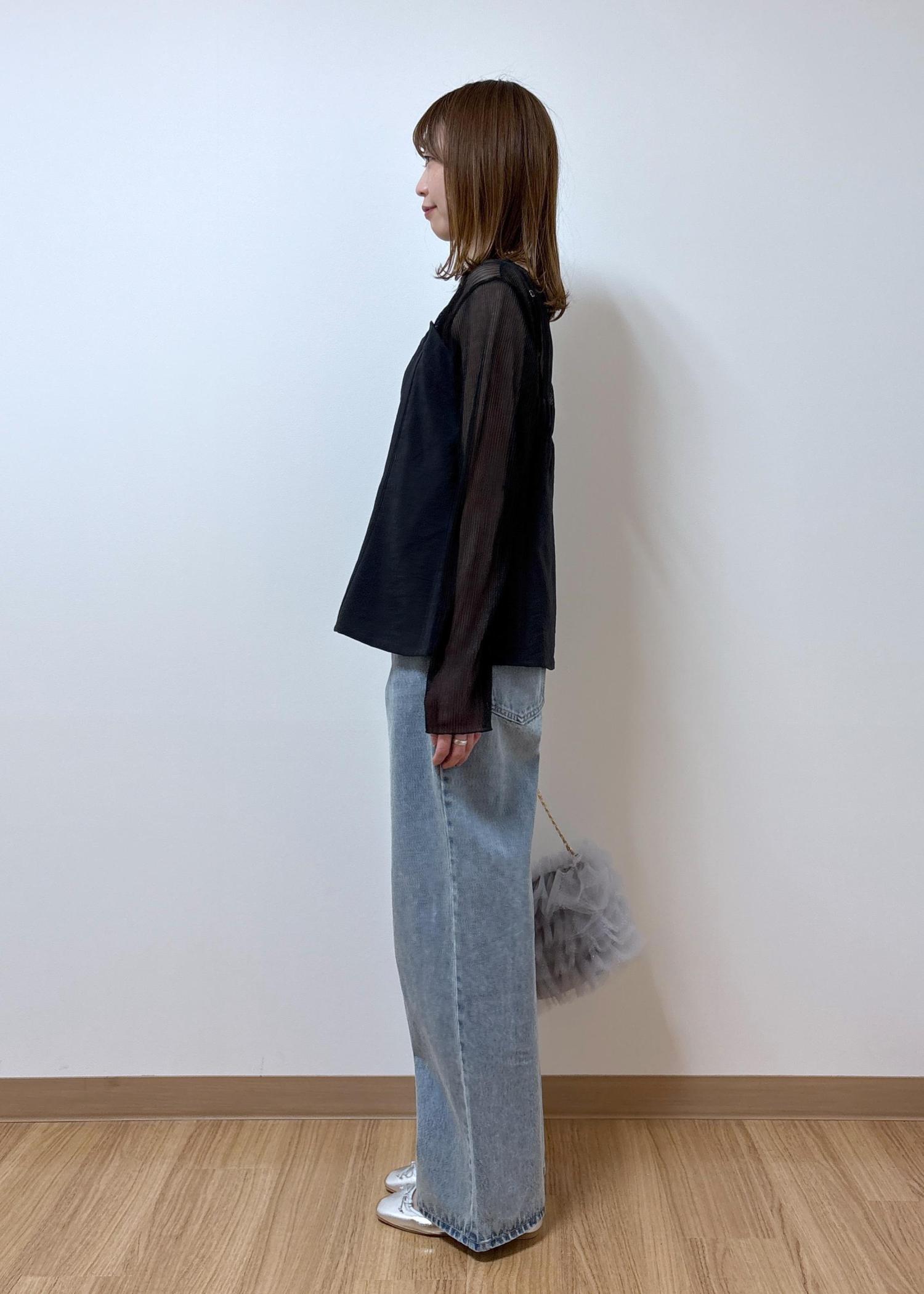 カジュアルですが、透け感のあるラメトップスで抜け感のある大人カジュアルなスタイリングです。