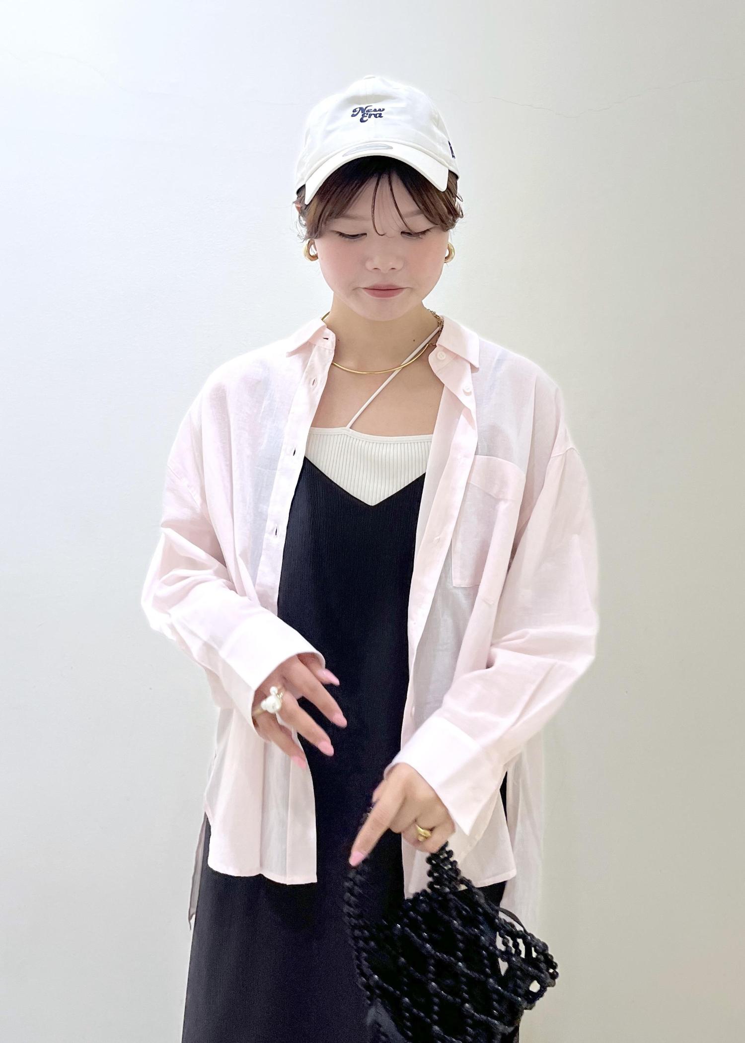 シアーシャツとキャミワンピを合わせた夏の定番コーデ。