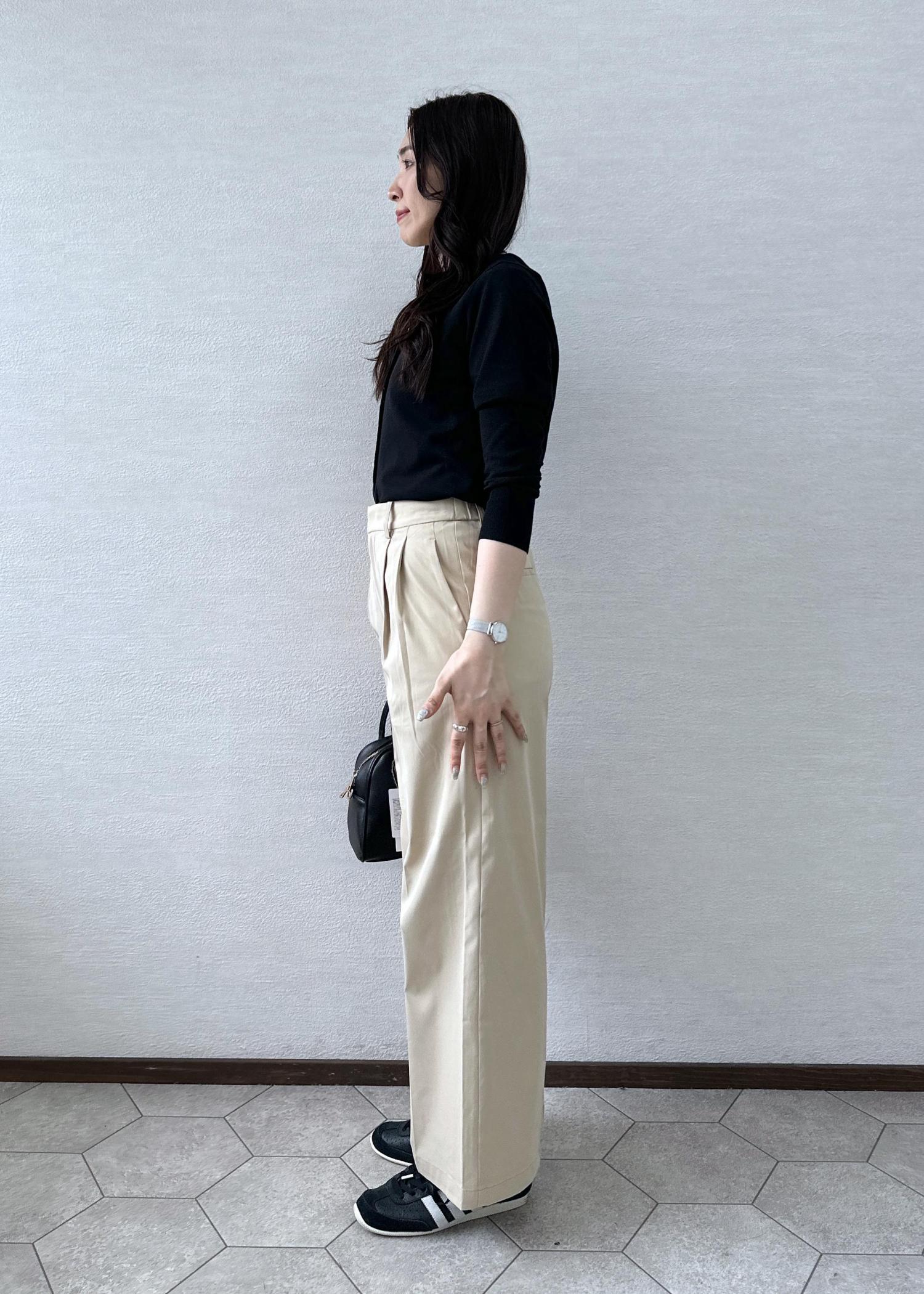 タックが2本入っていて腰回りもカバーが出来て、広すぎないワイドシルエットなのでスタイルアップも叶います。
