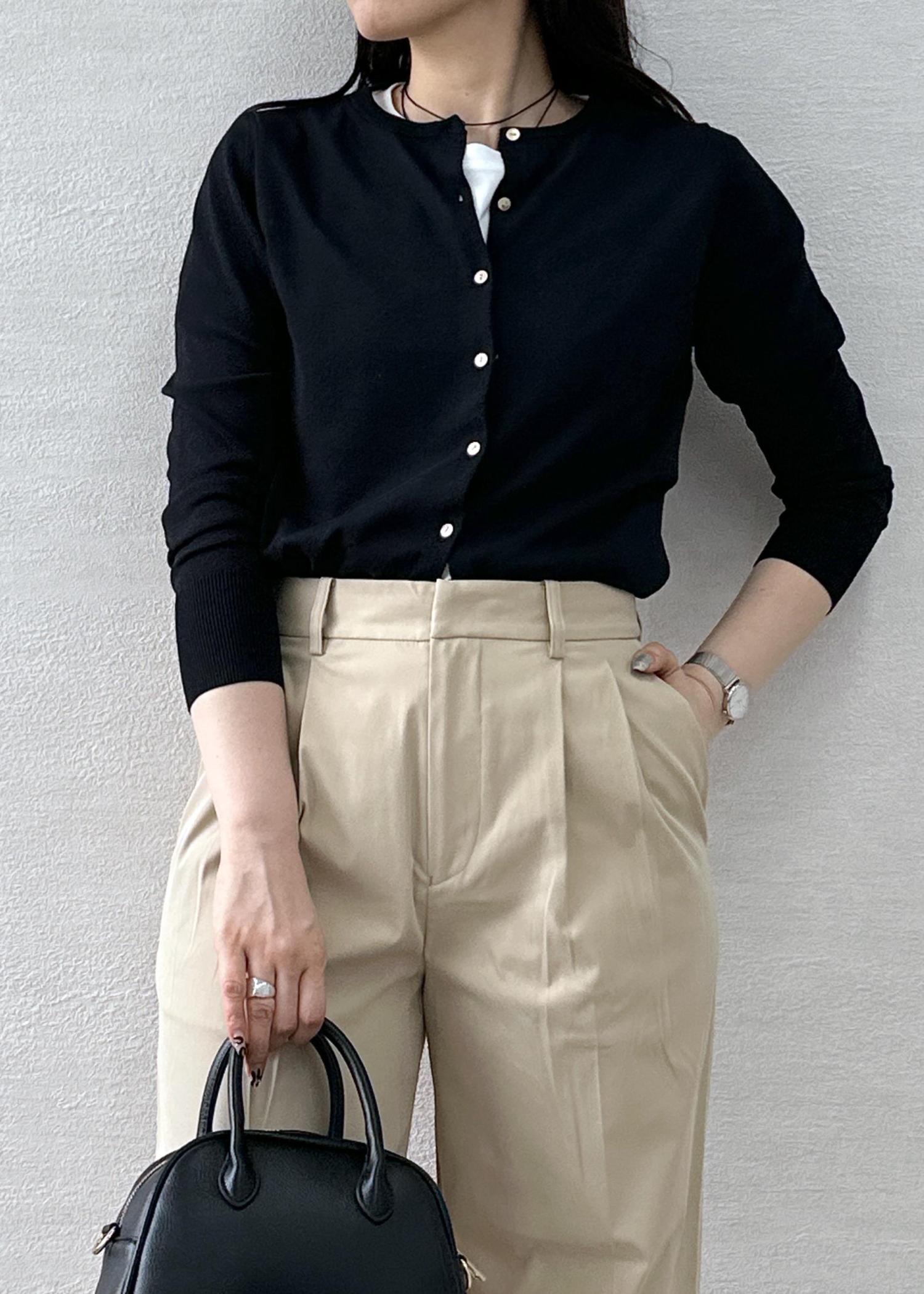 ベーシックなカーディガンでサイズ感はコンパクトなのできれいめな印象になります。