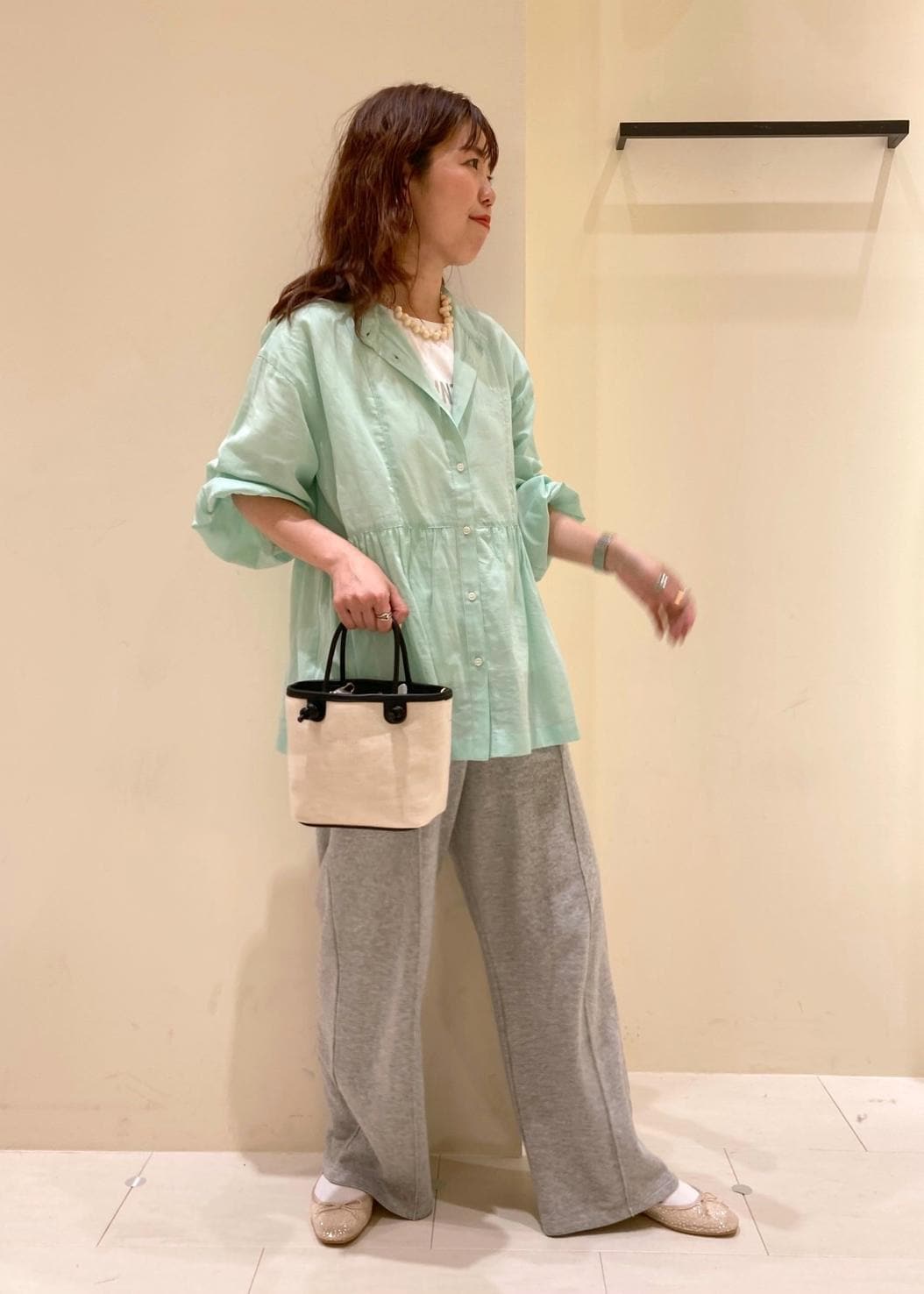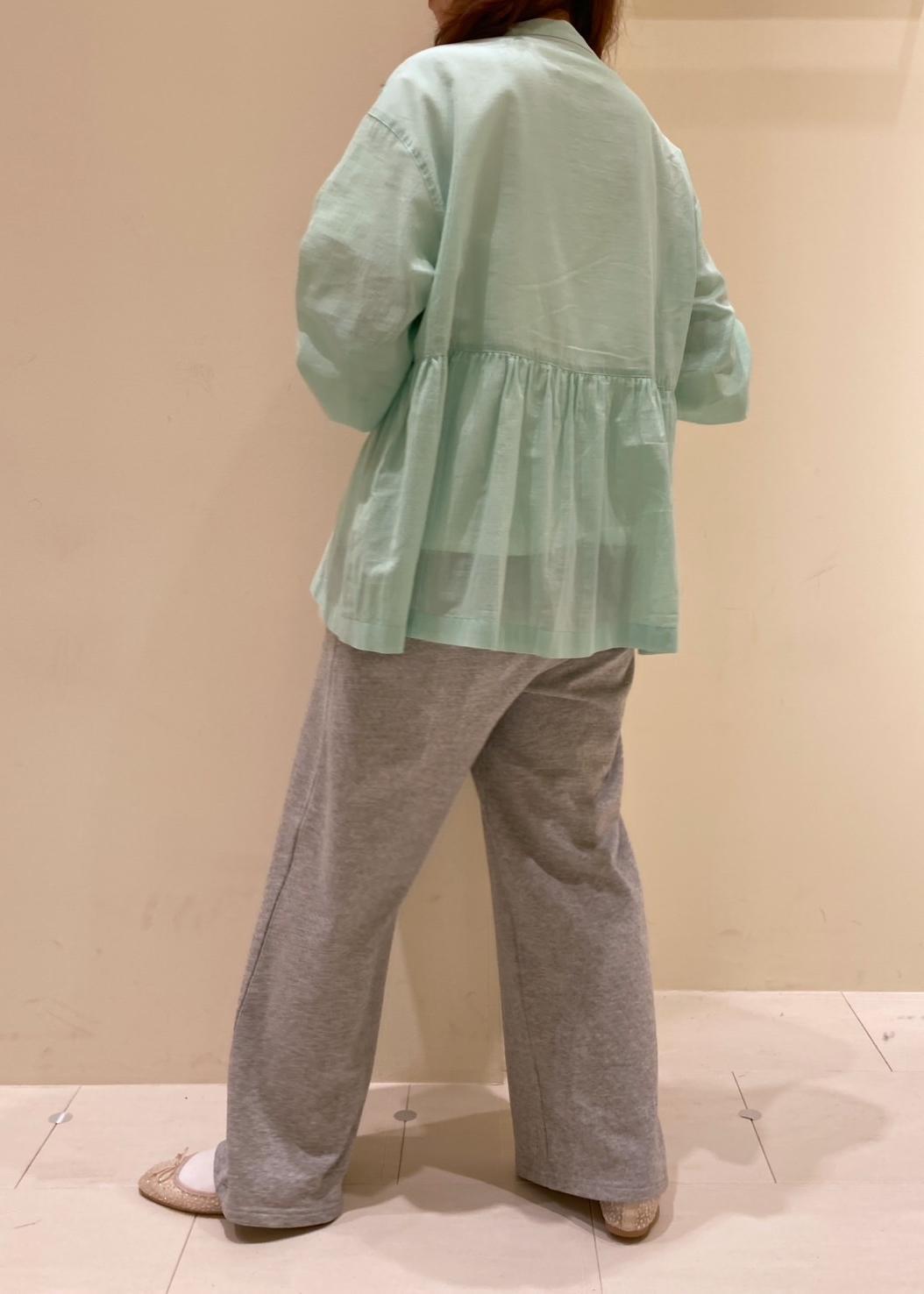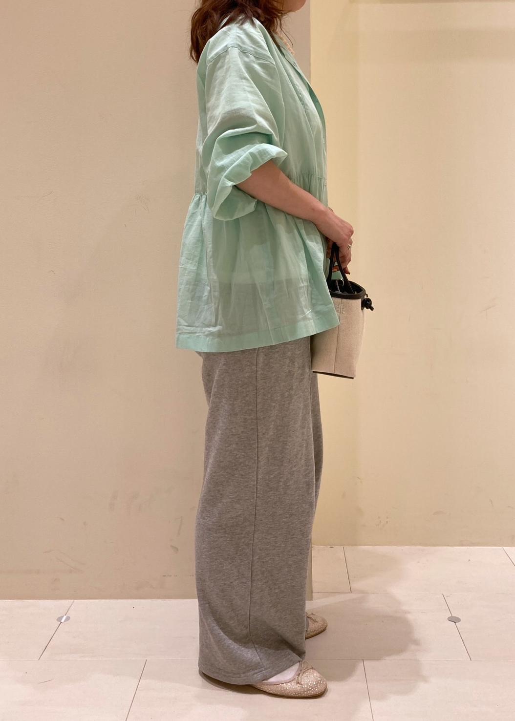 バンドカラーで首もとがつまっているので、ボタンを開けてインナーのTシャツの白を見せることで全体的に軽さを出しました。