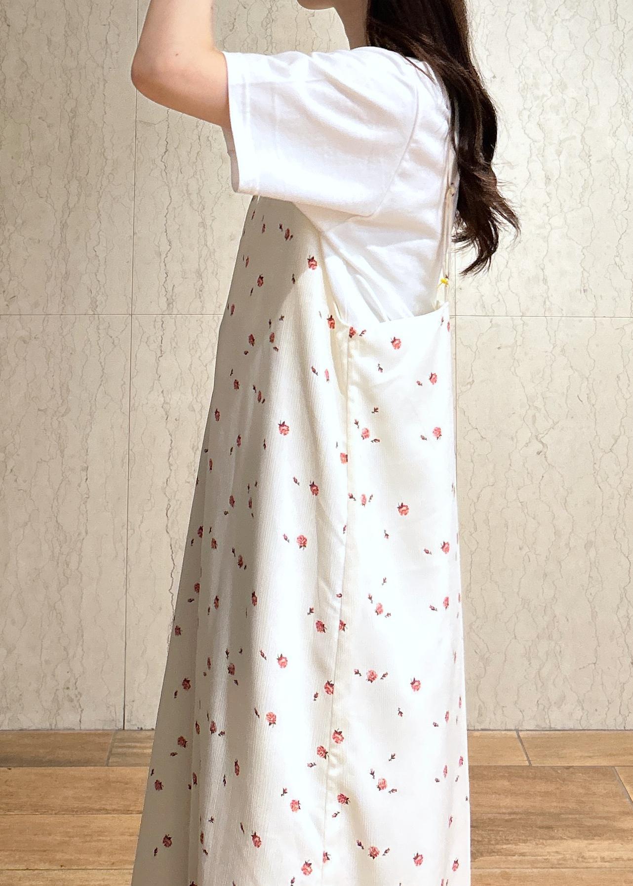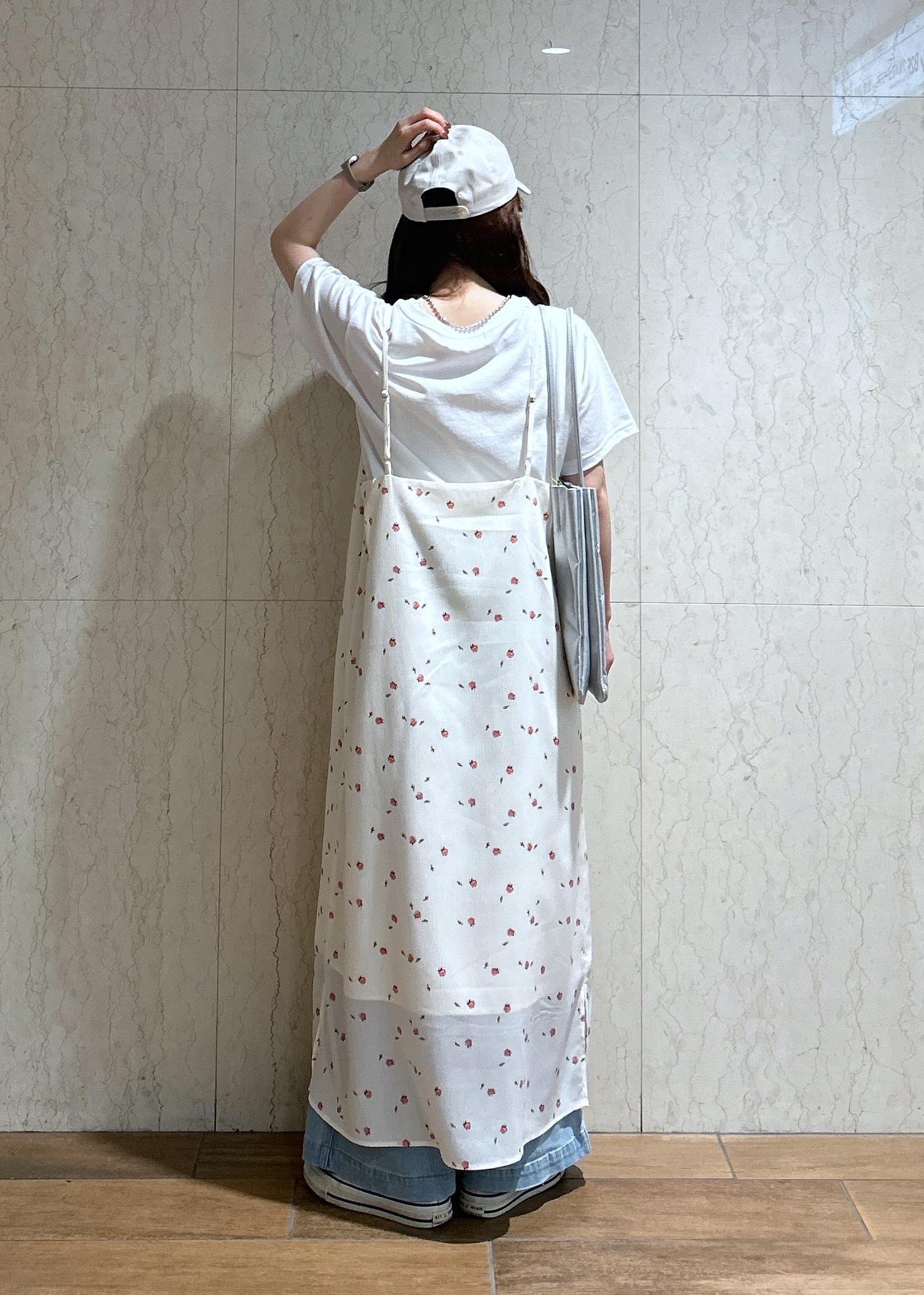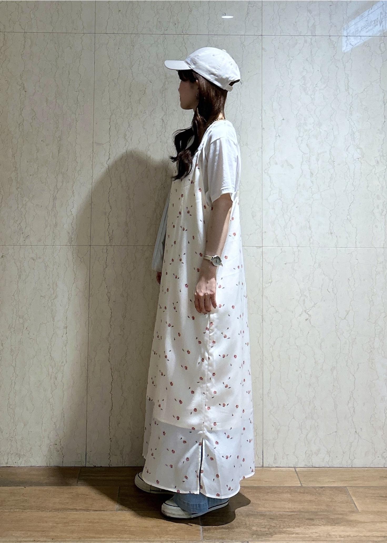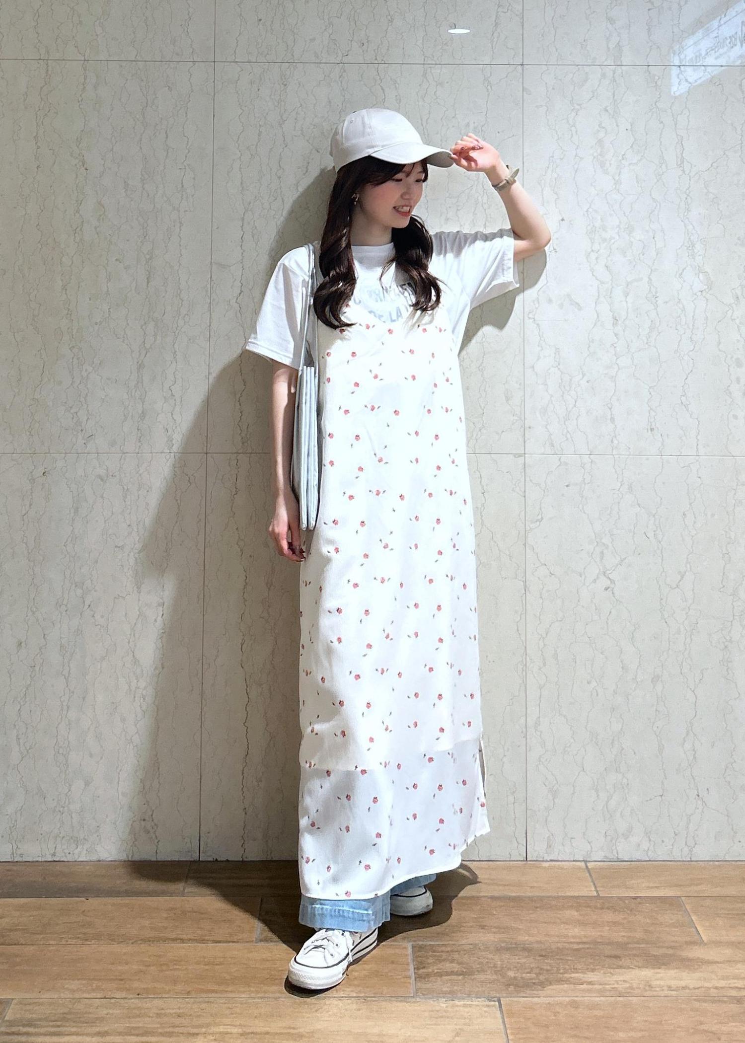 小花柄が可愛いらしいキャミワンピースにデニムパンツをレイヤードしたカジュアルコーデ。