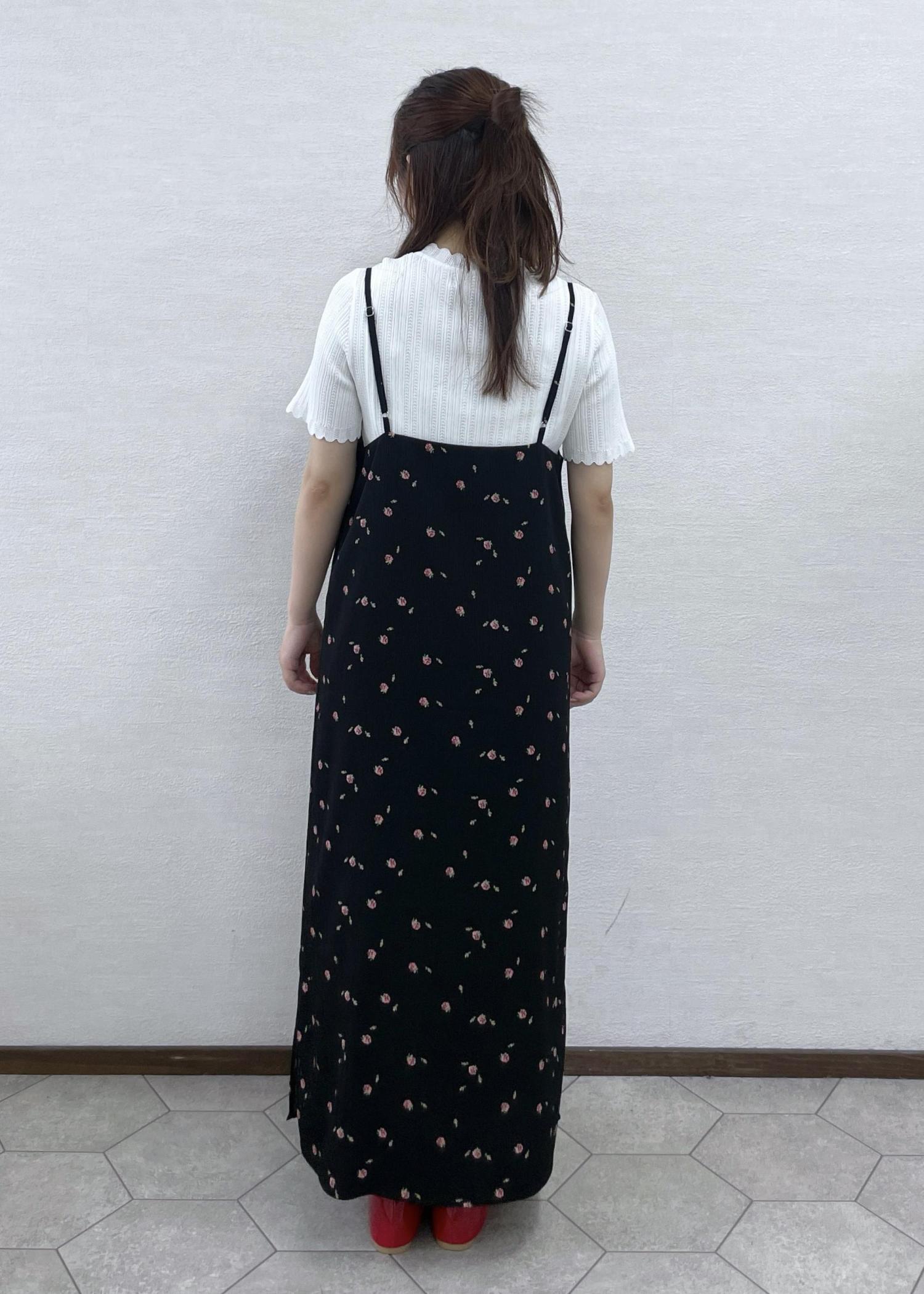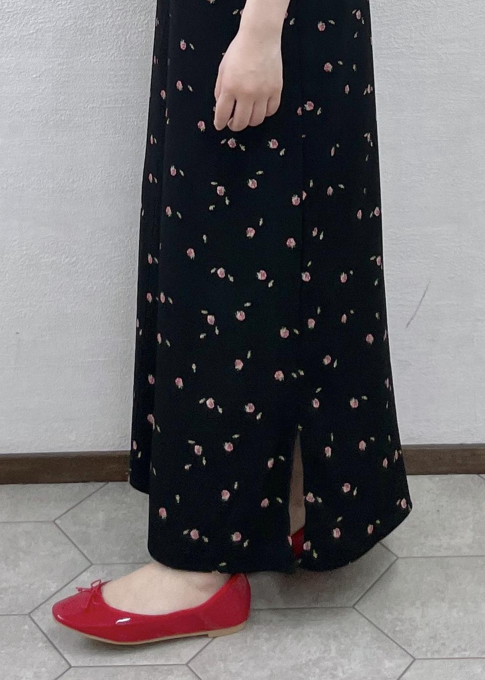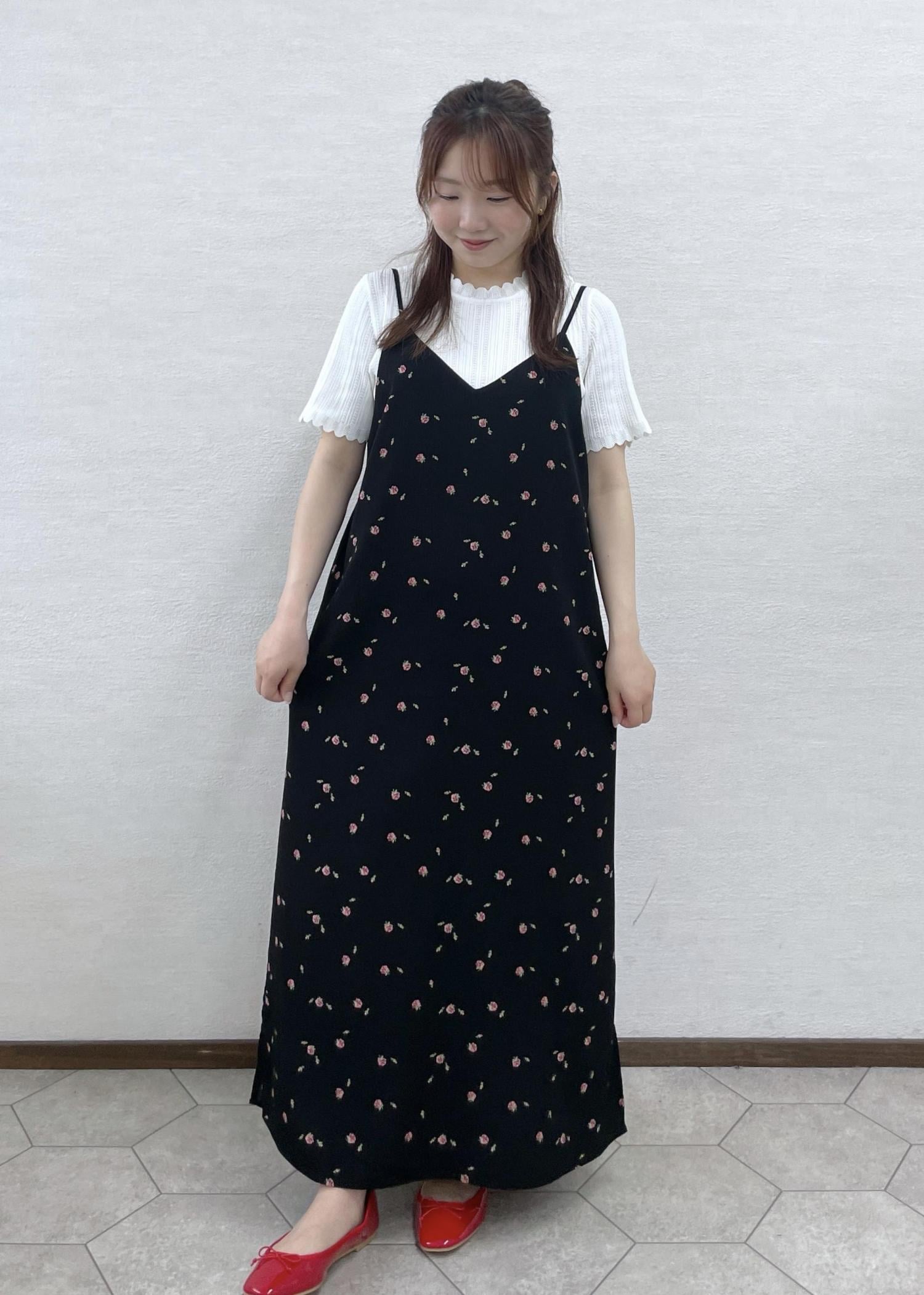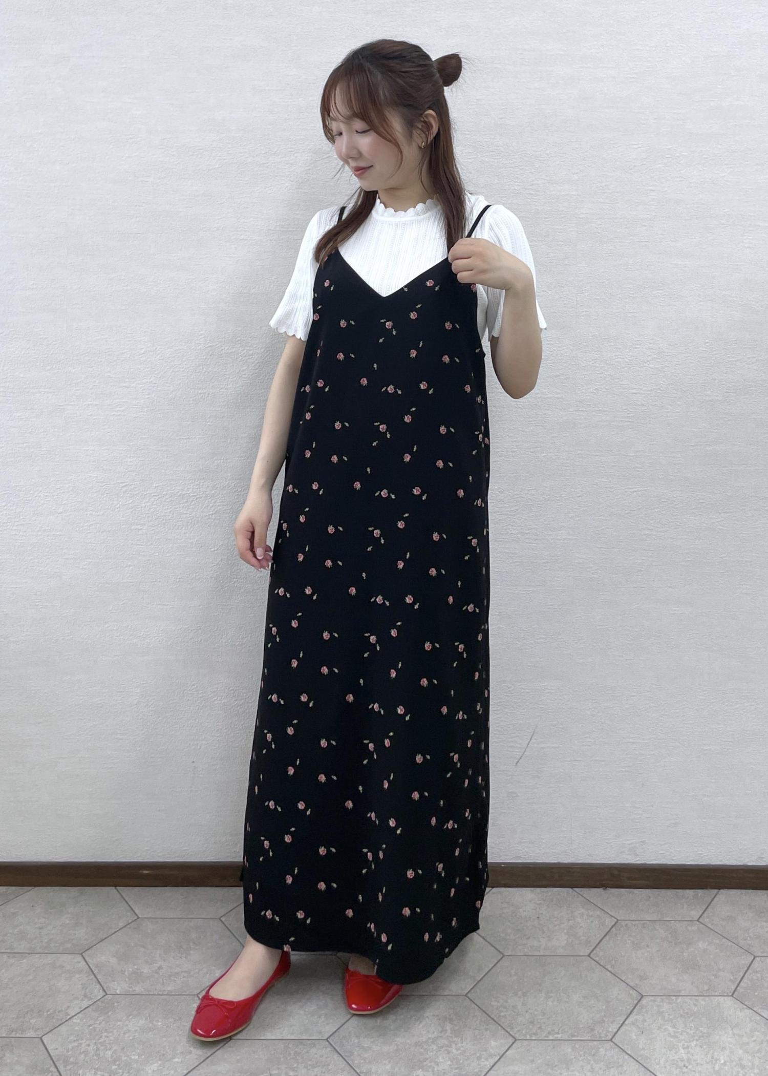 1枚で決まる楽なワンピース!小さいバラ柄が可愛いです♡バラの色と合わせて赤のパンプスにしました!