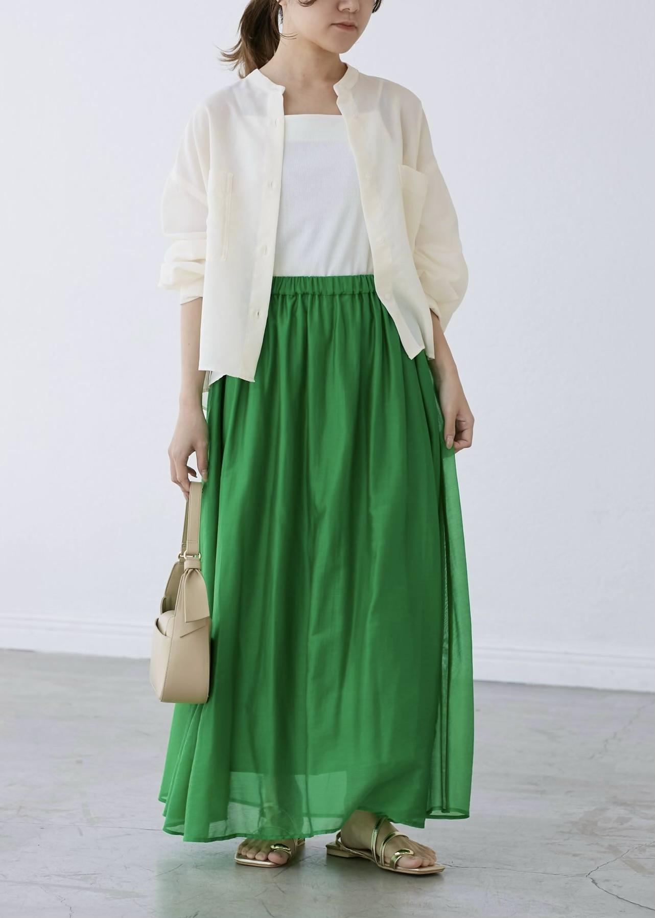 きれいなグリーンのスカートがポイントのリラックスコーデです。