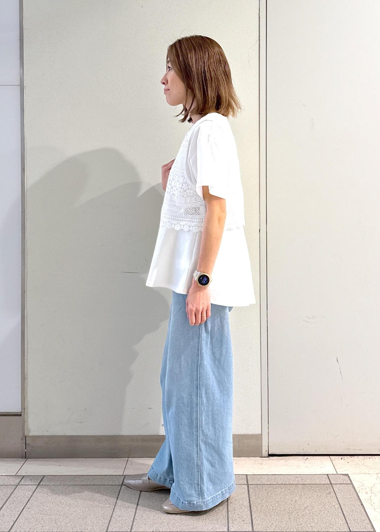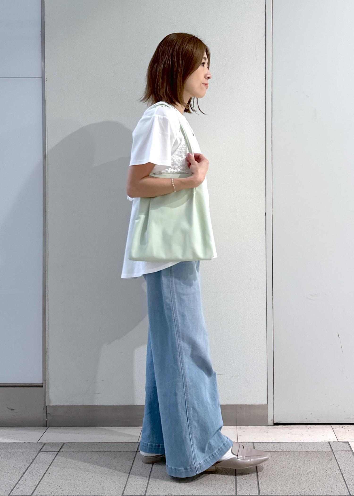 足のラインを拾いにくいワイドシルエットです。 -
