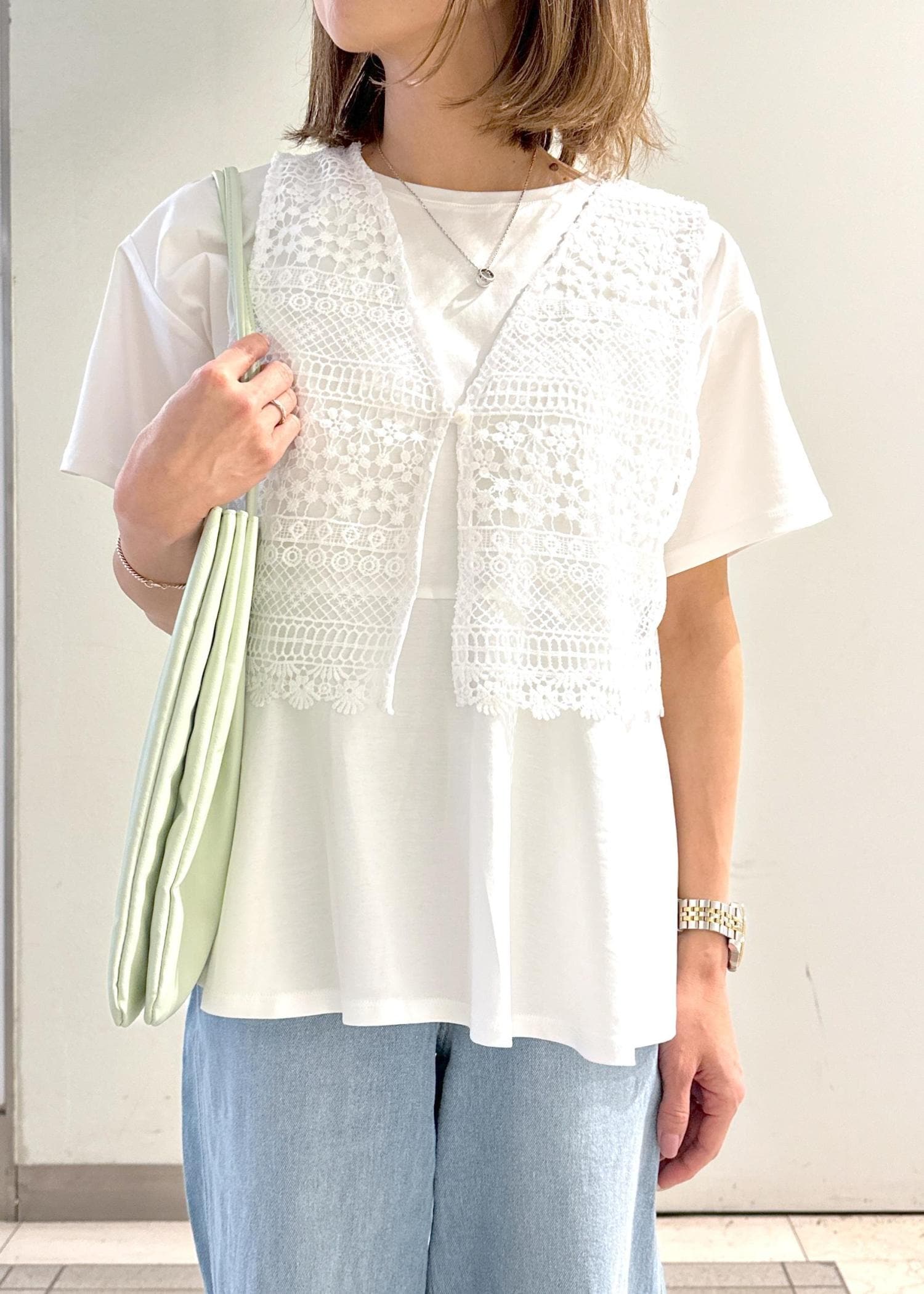 ROPÉ PICNICフロントボタンレースジレベスト/リンクコーデホワイト / F¥3,498レビュー着丈はウエスト周りにかかる位ですっきりとした長さです。