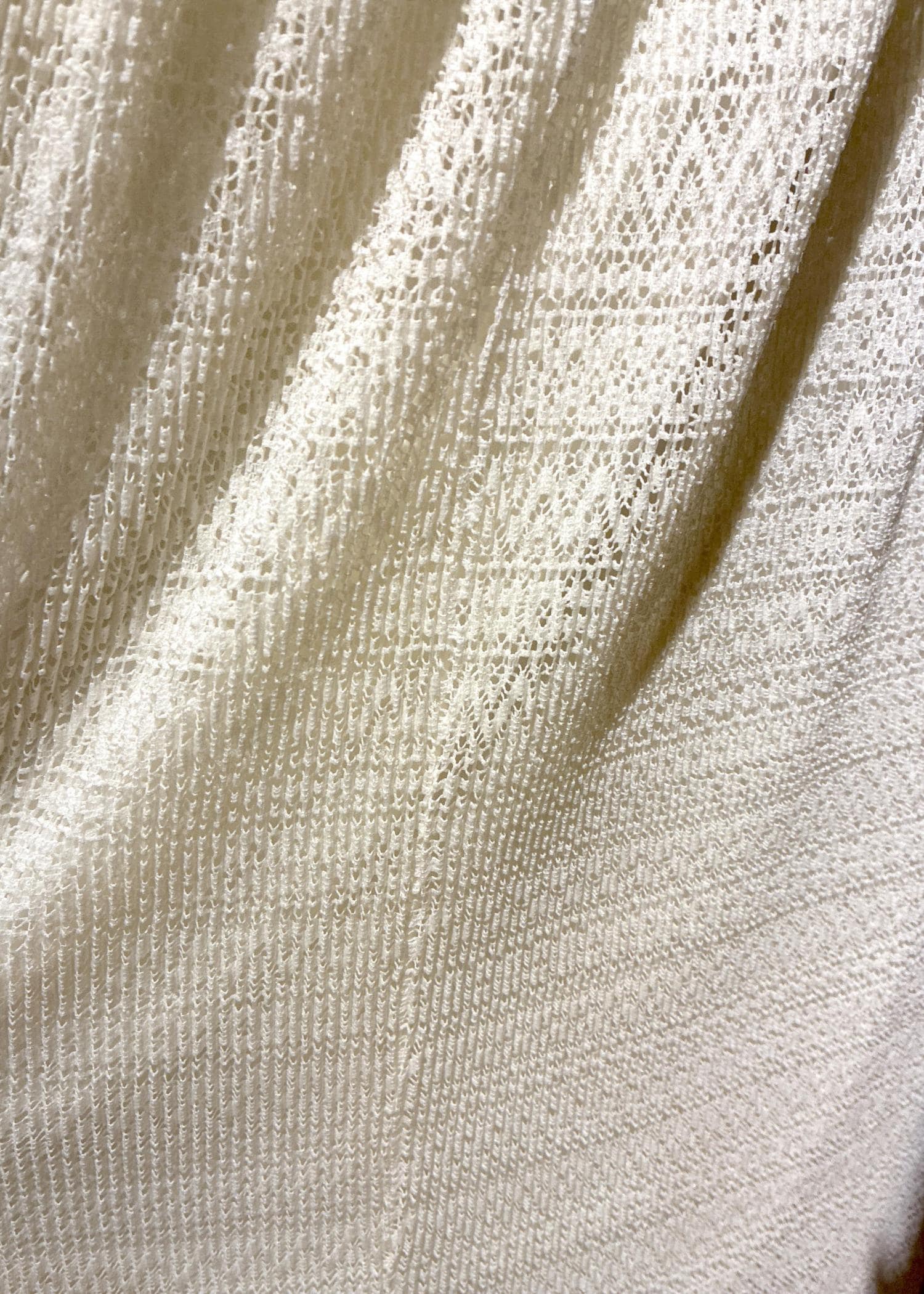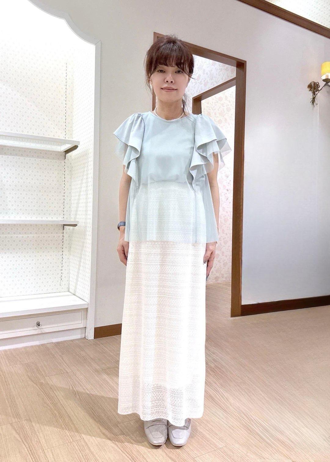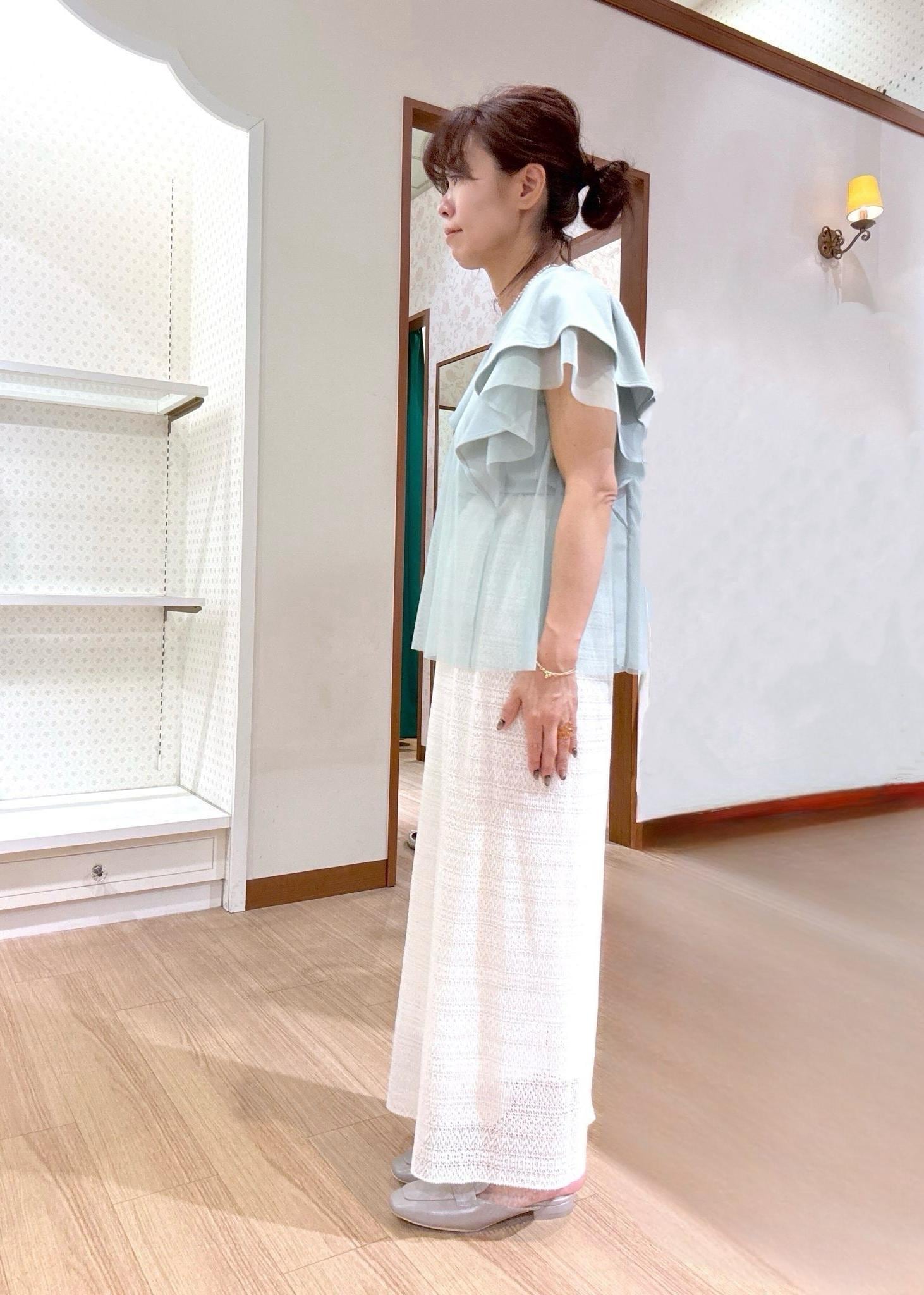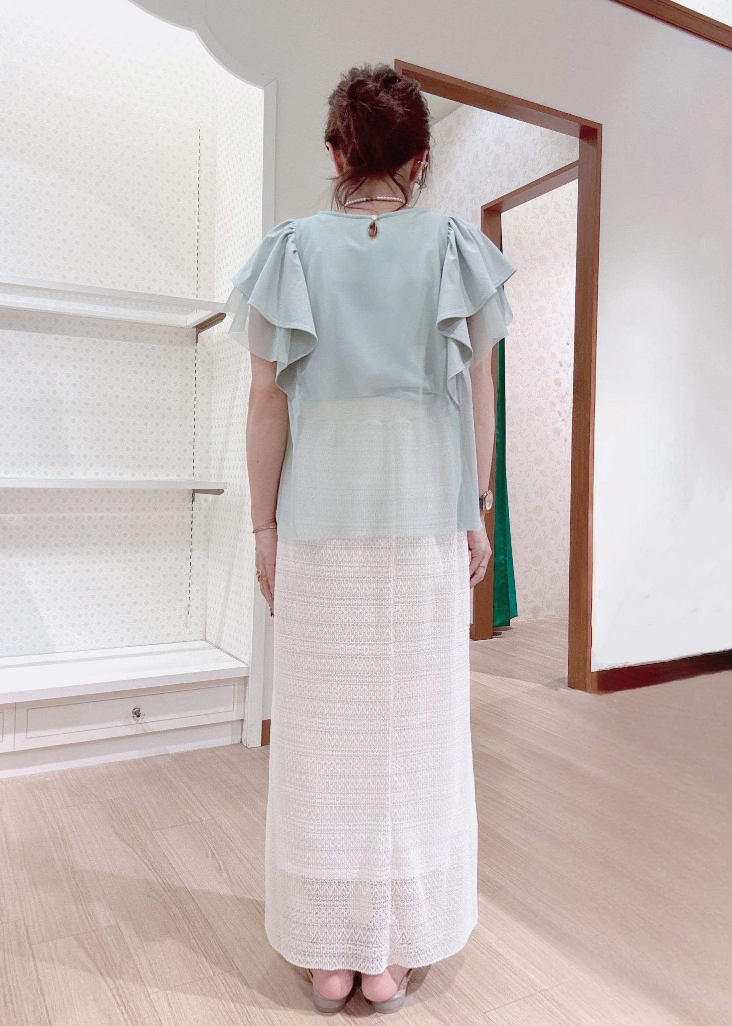 2枚重ねになっているので今回のようにボトムスとの透け感を楽しめ、脚長効果も見込めます!裾は出してパンツ合わせでリラックススタイルにも◎ -