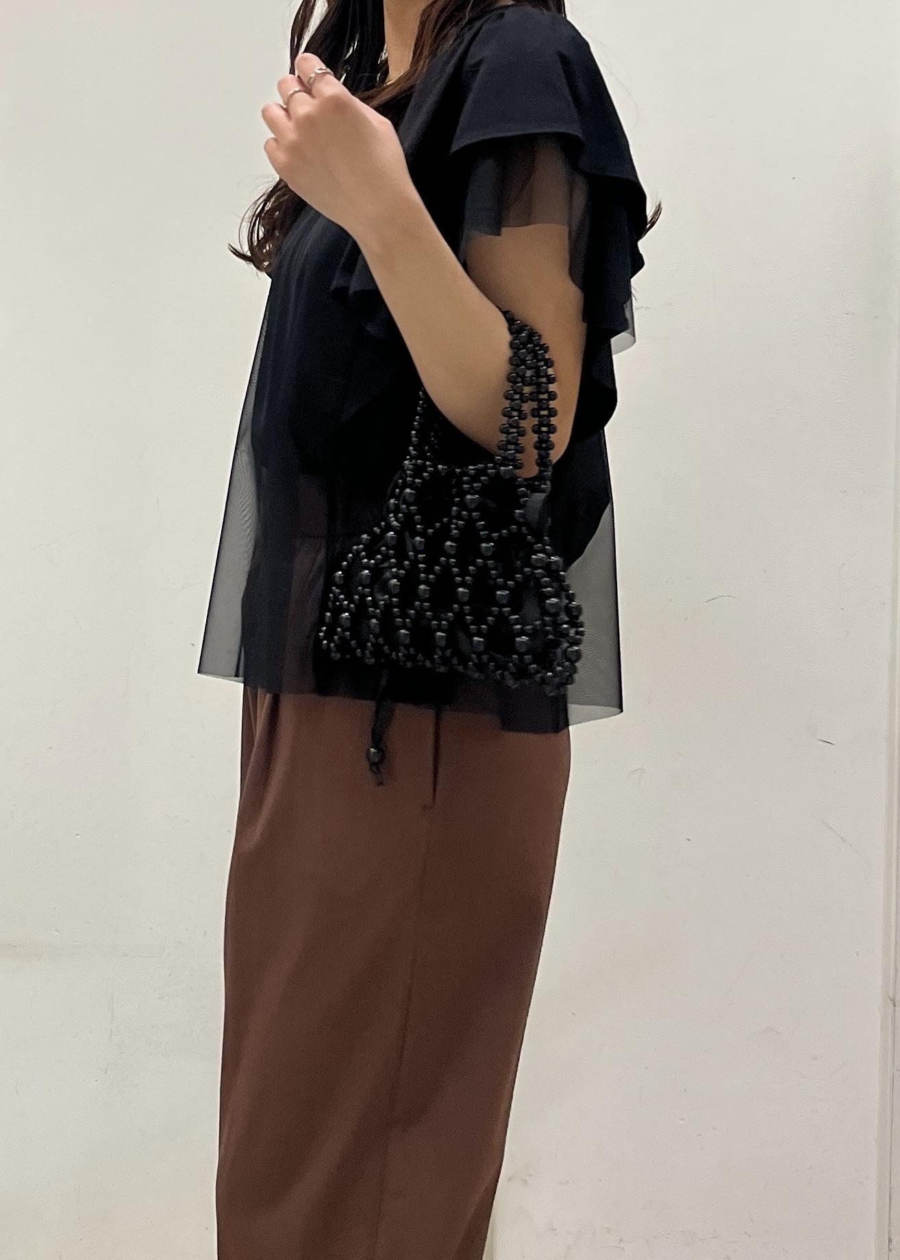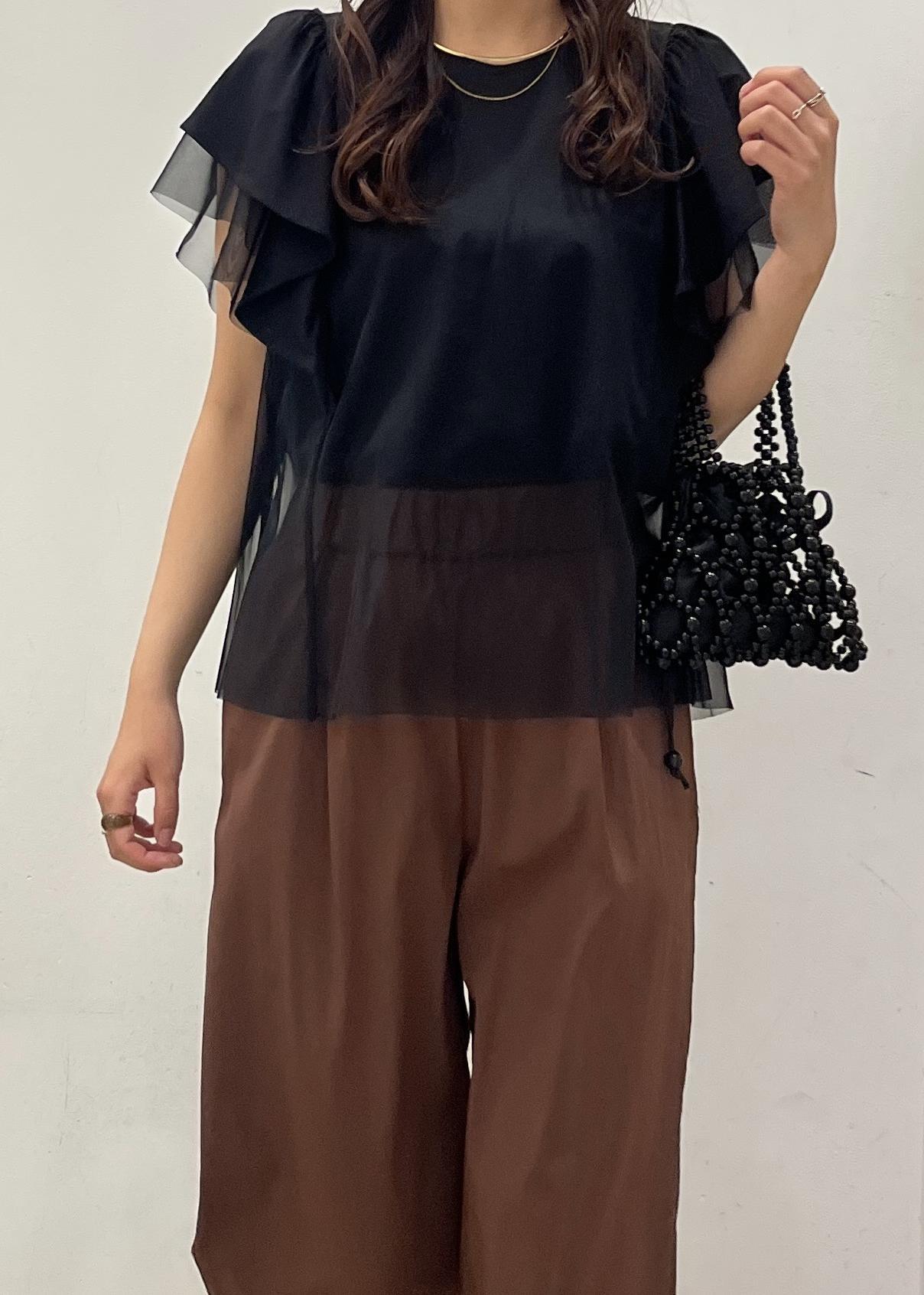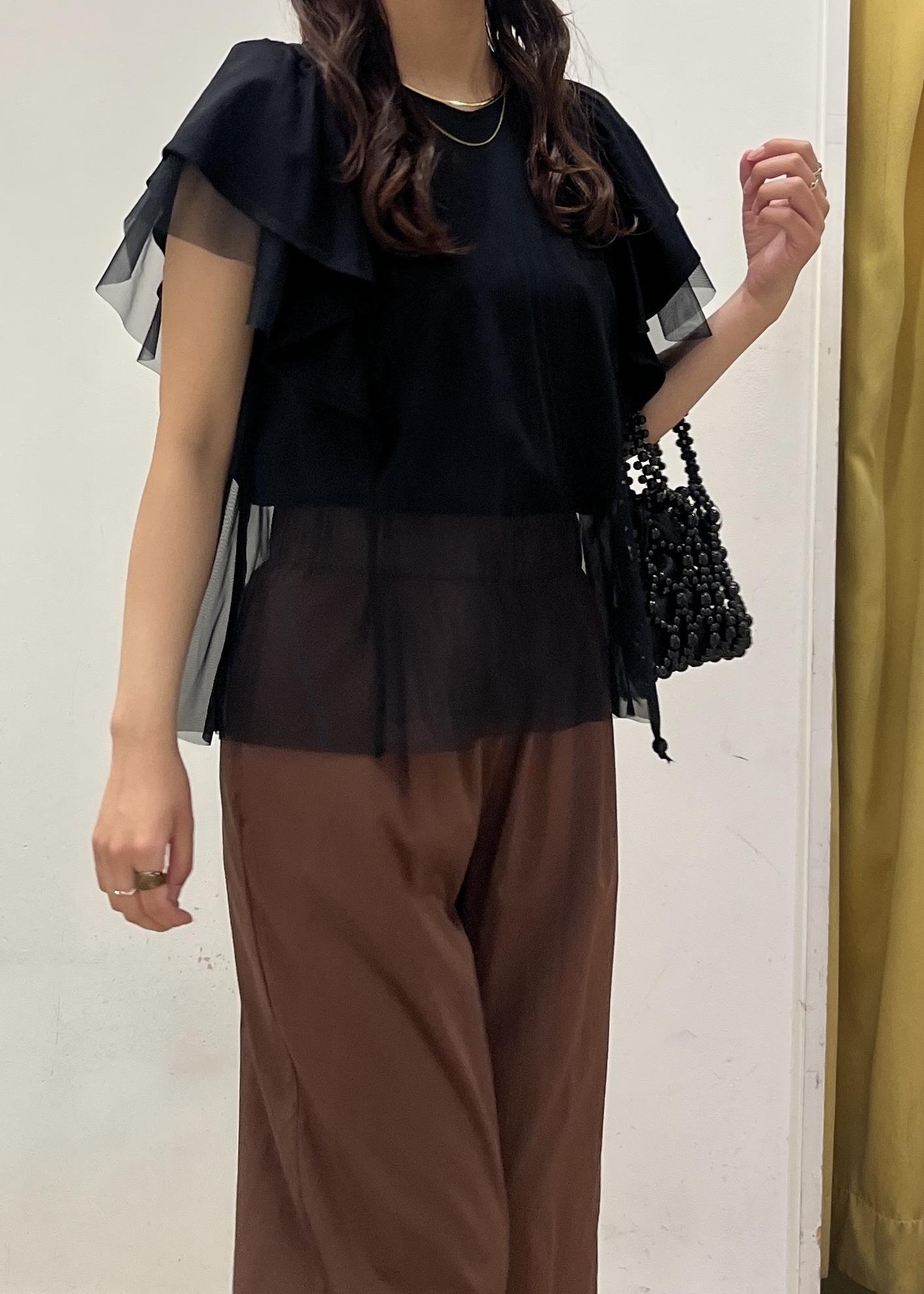 ブラックカラーのフリルトップスにパンツを合わせたキレイめカジュアルコーデ♪フリルトップスが甘めな印象ですが、ボトムをブラウンで合わせて落ち着いた印象に♩