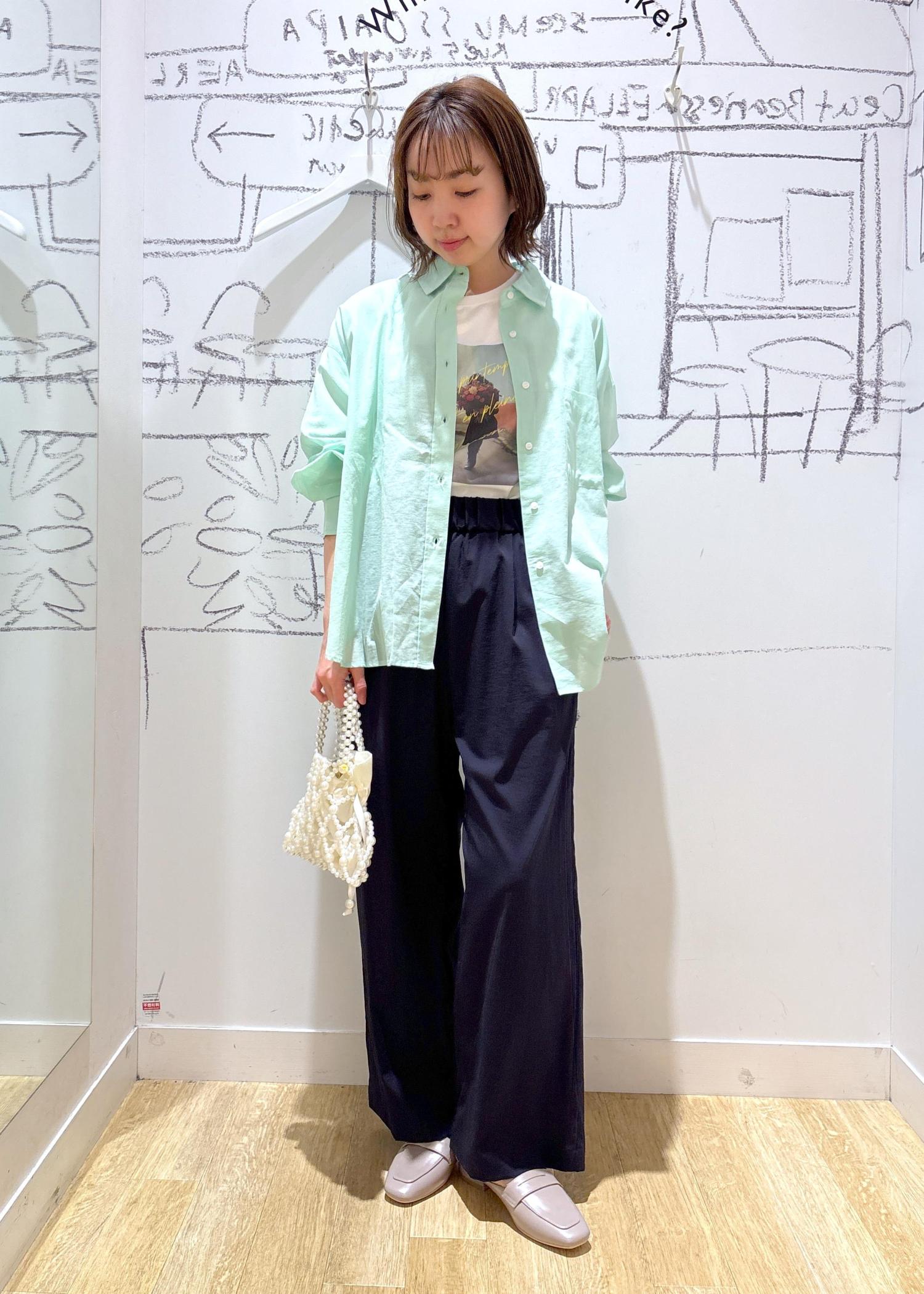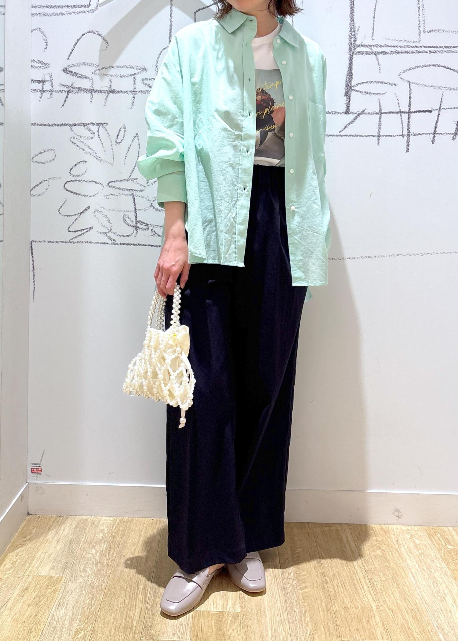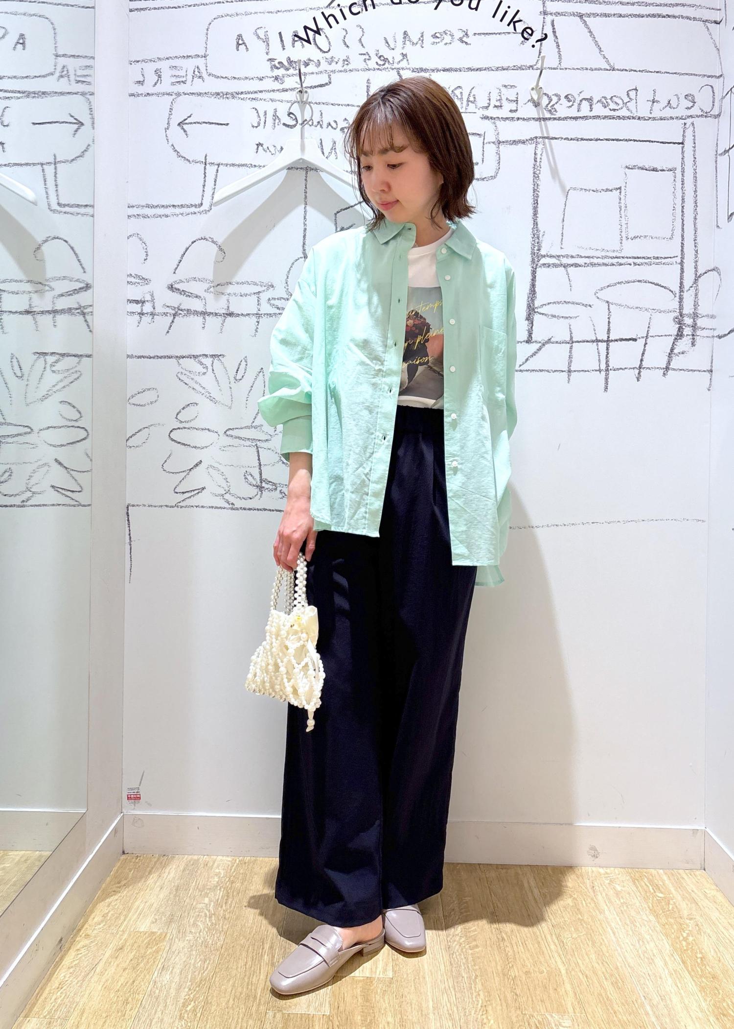 爽やかなグリーンカラーが夏らしい印象のシャツコーデ。