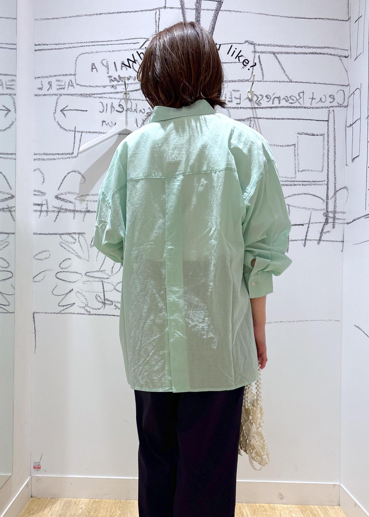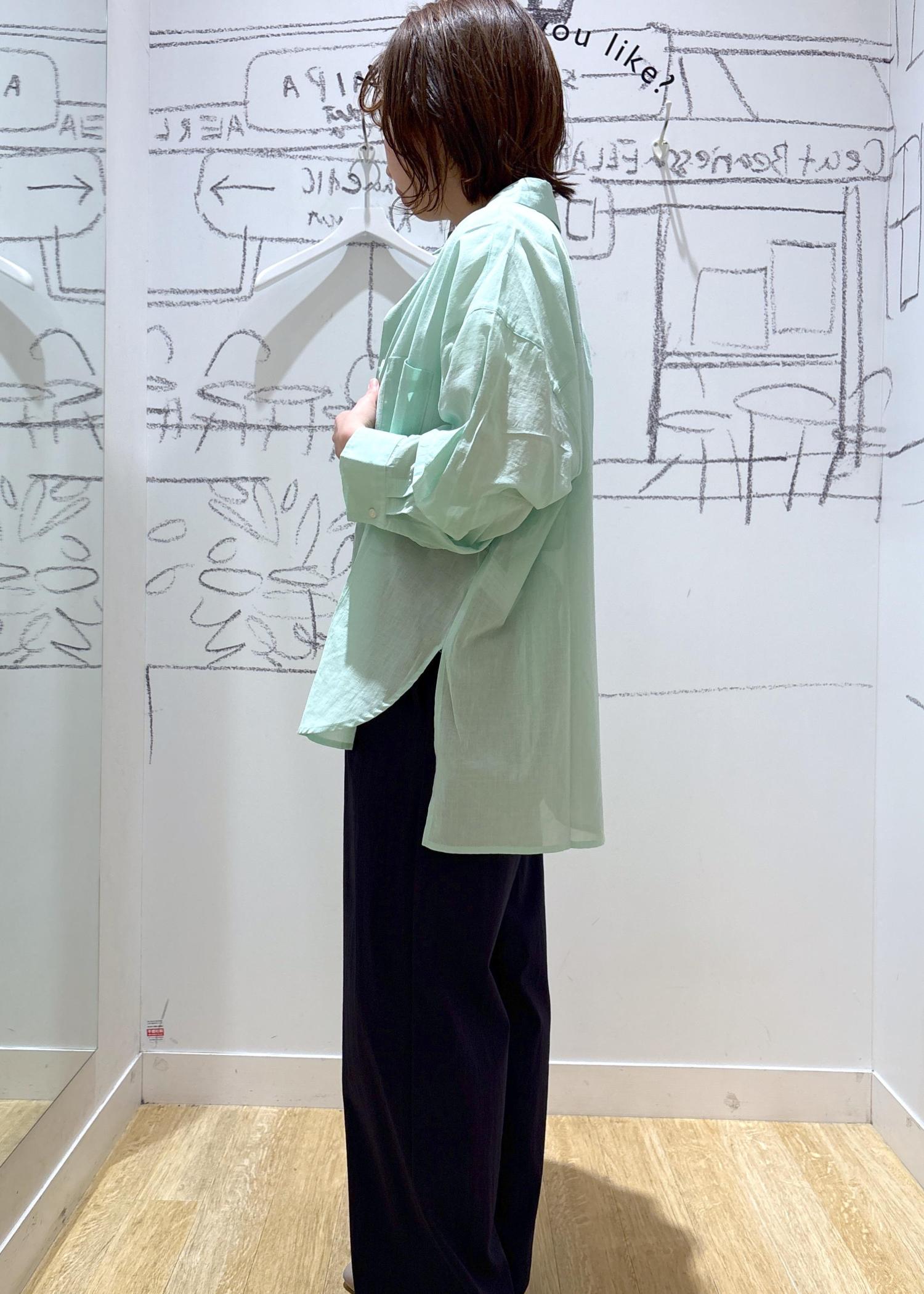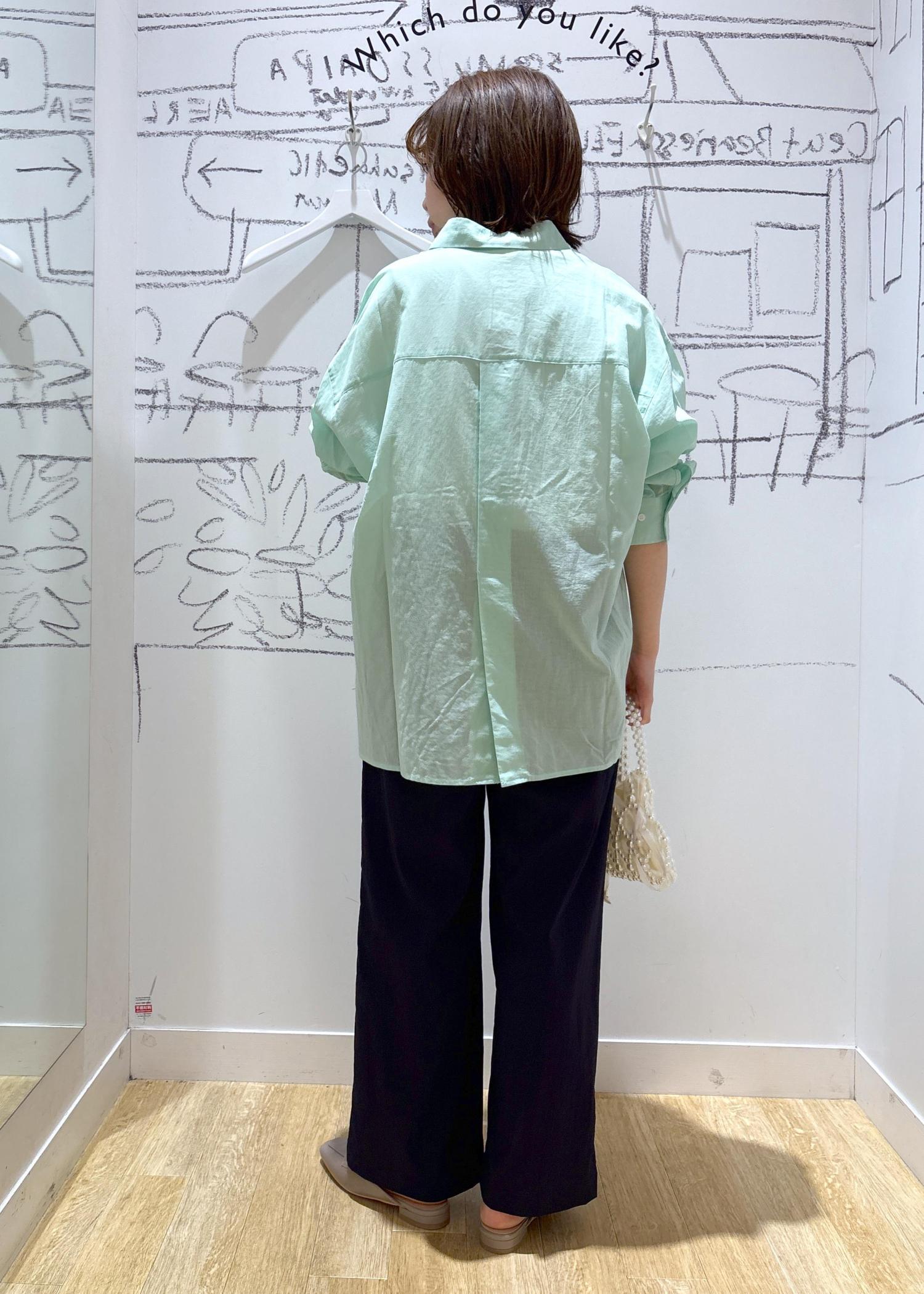 爽やかなグリーンカラーが夏らしい印象のシャツコーデ。