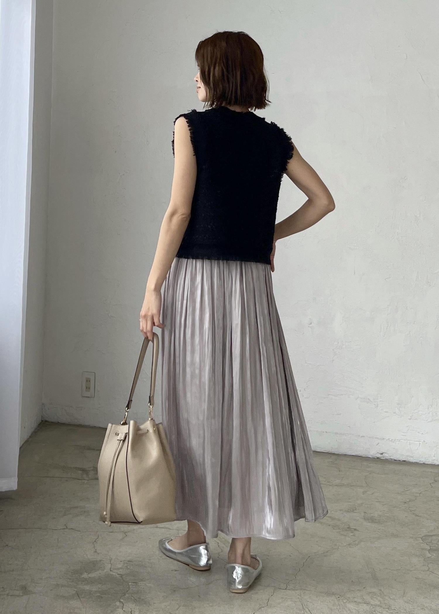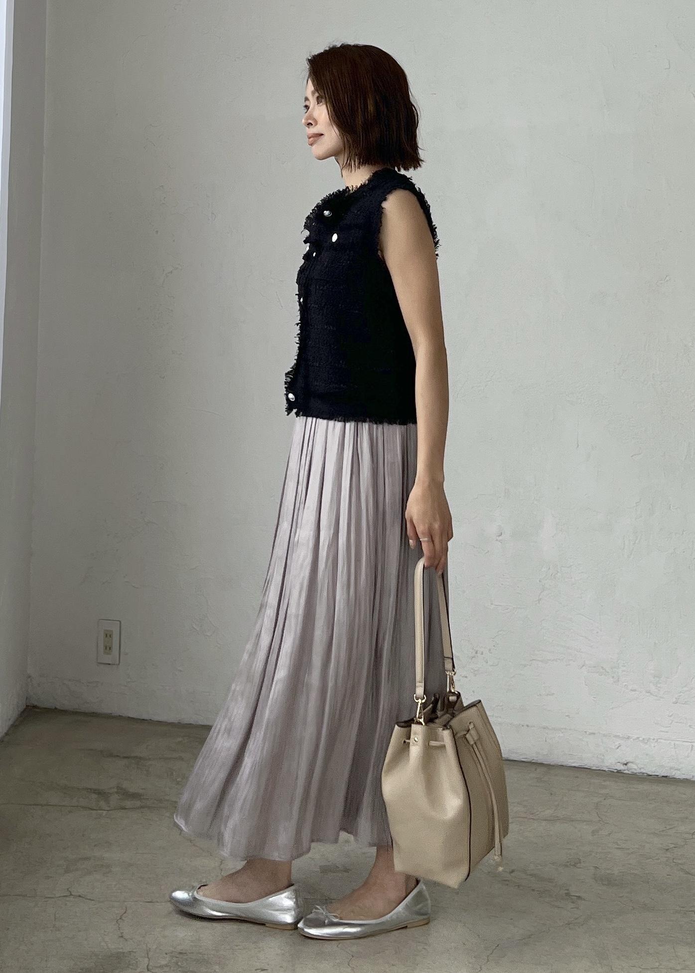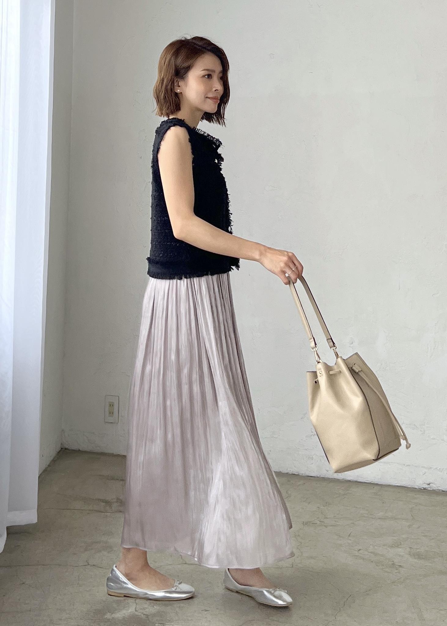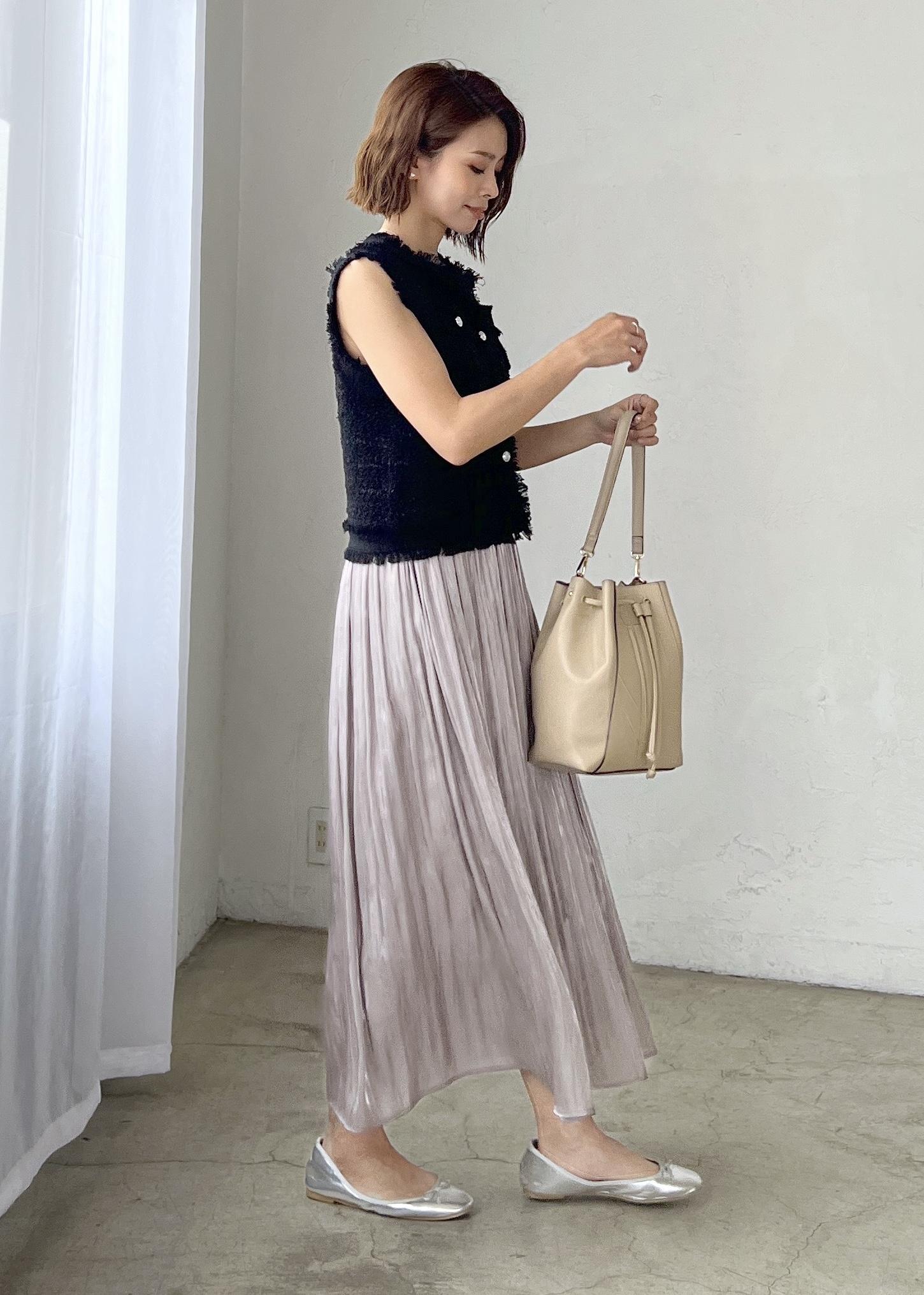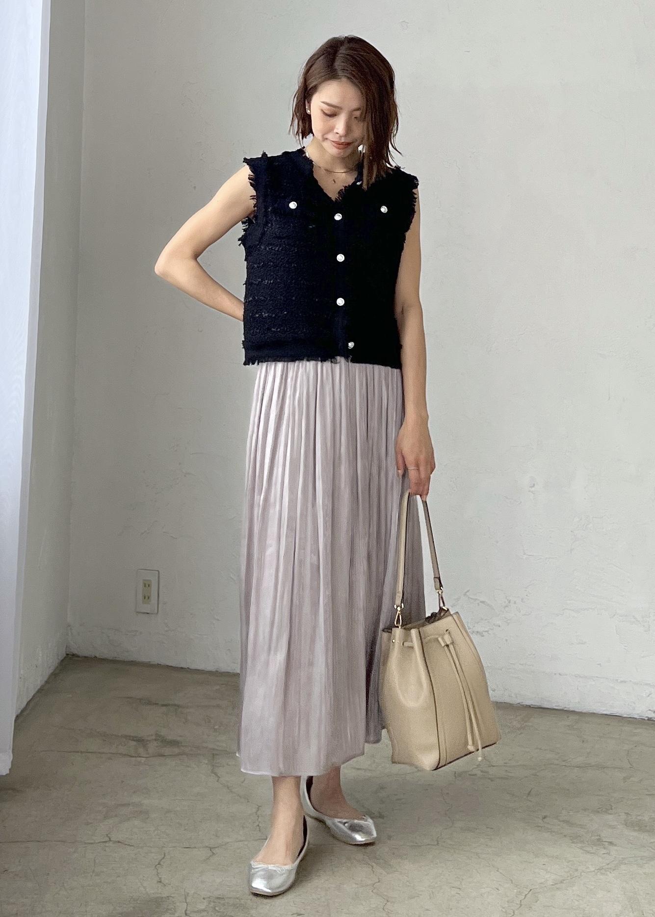 上品な印象のブラックには、光沢感のあるプリーツスカートを合わせてきれいめカジュアルなスタイリングにしました。