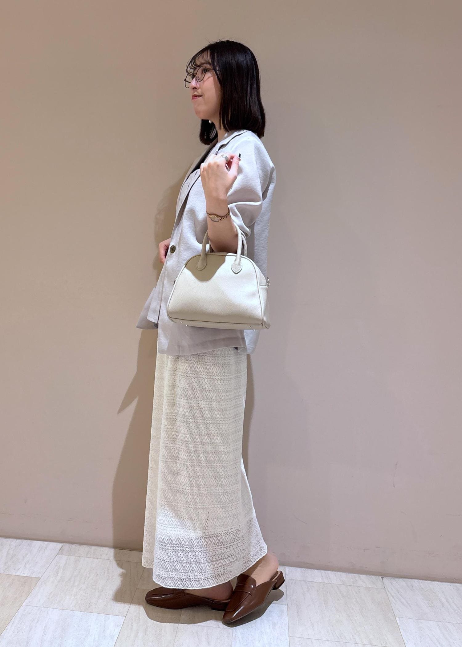 春夏らしく涼しげなスカートにブラウンのバブーシュでオシャレに。
