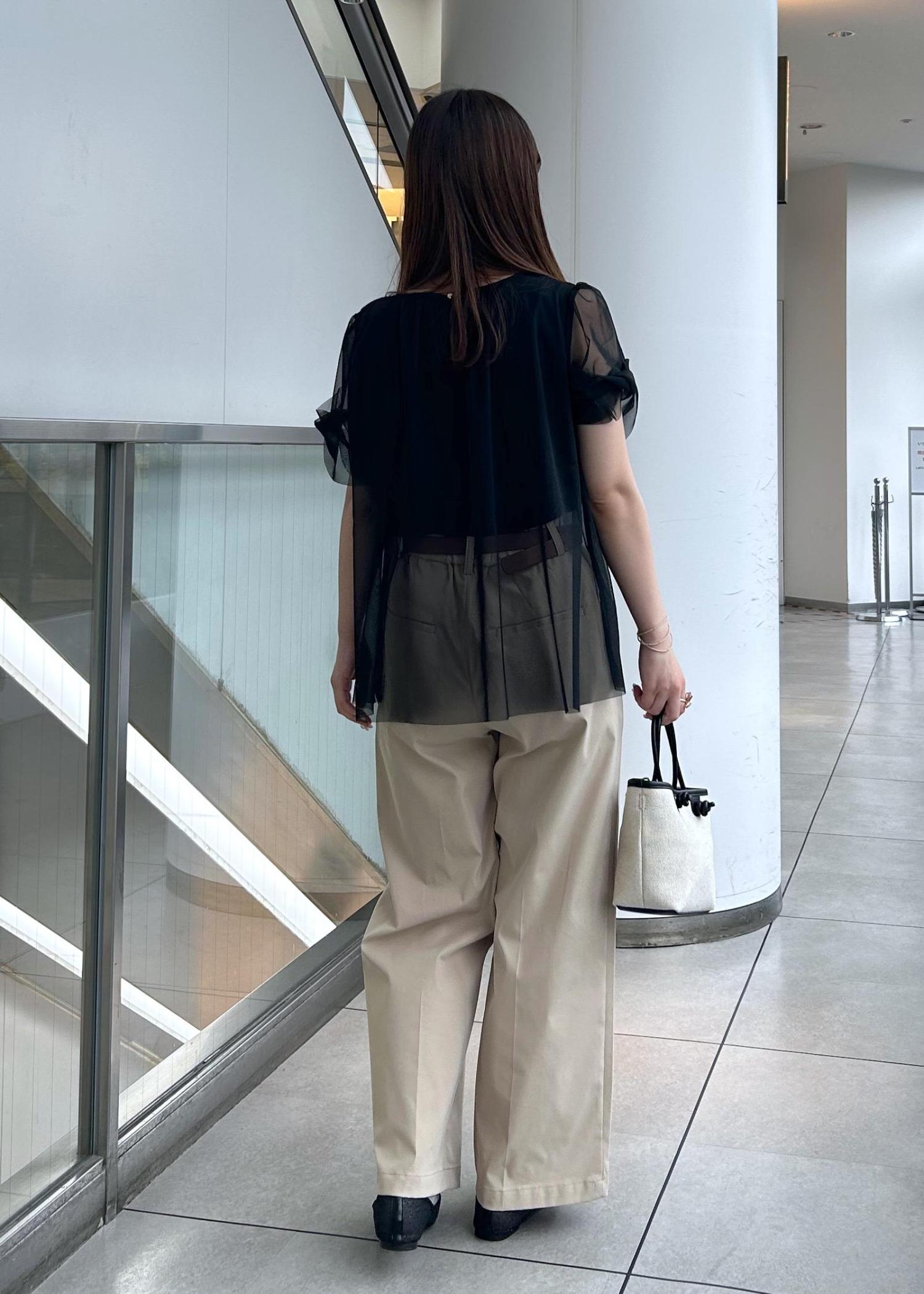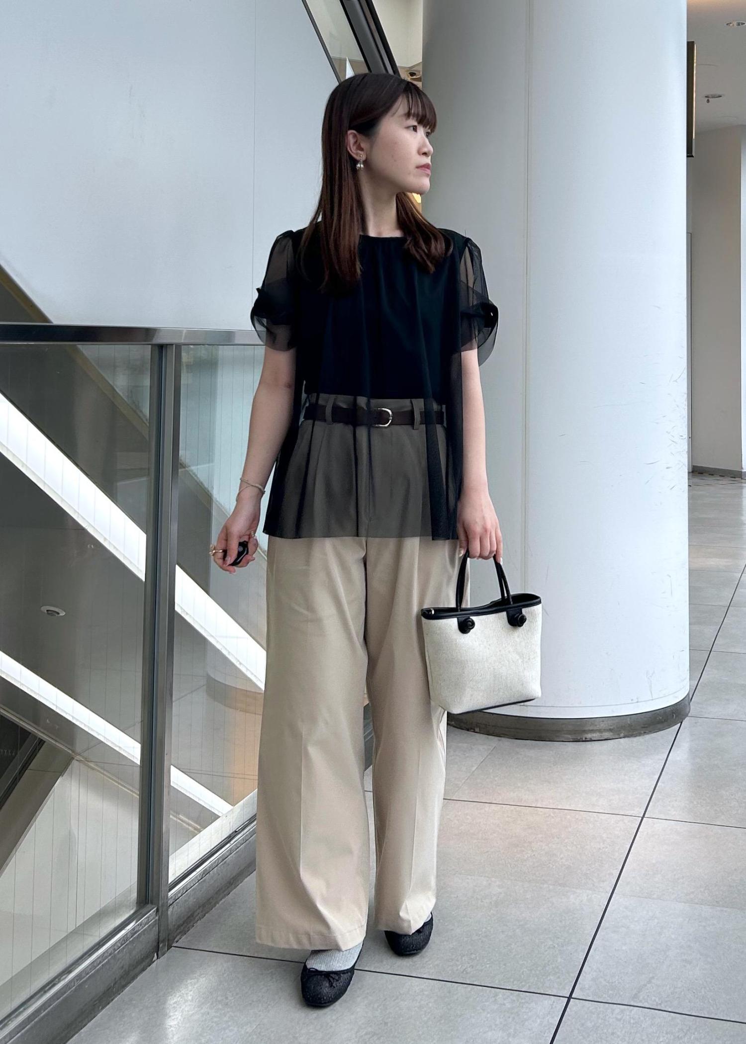 チュールの上品なキレイめトップスと、カジュアルパンツを合わせた抜け感のあるカジュアルコーデにしました。