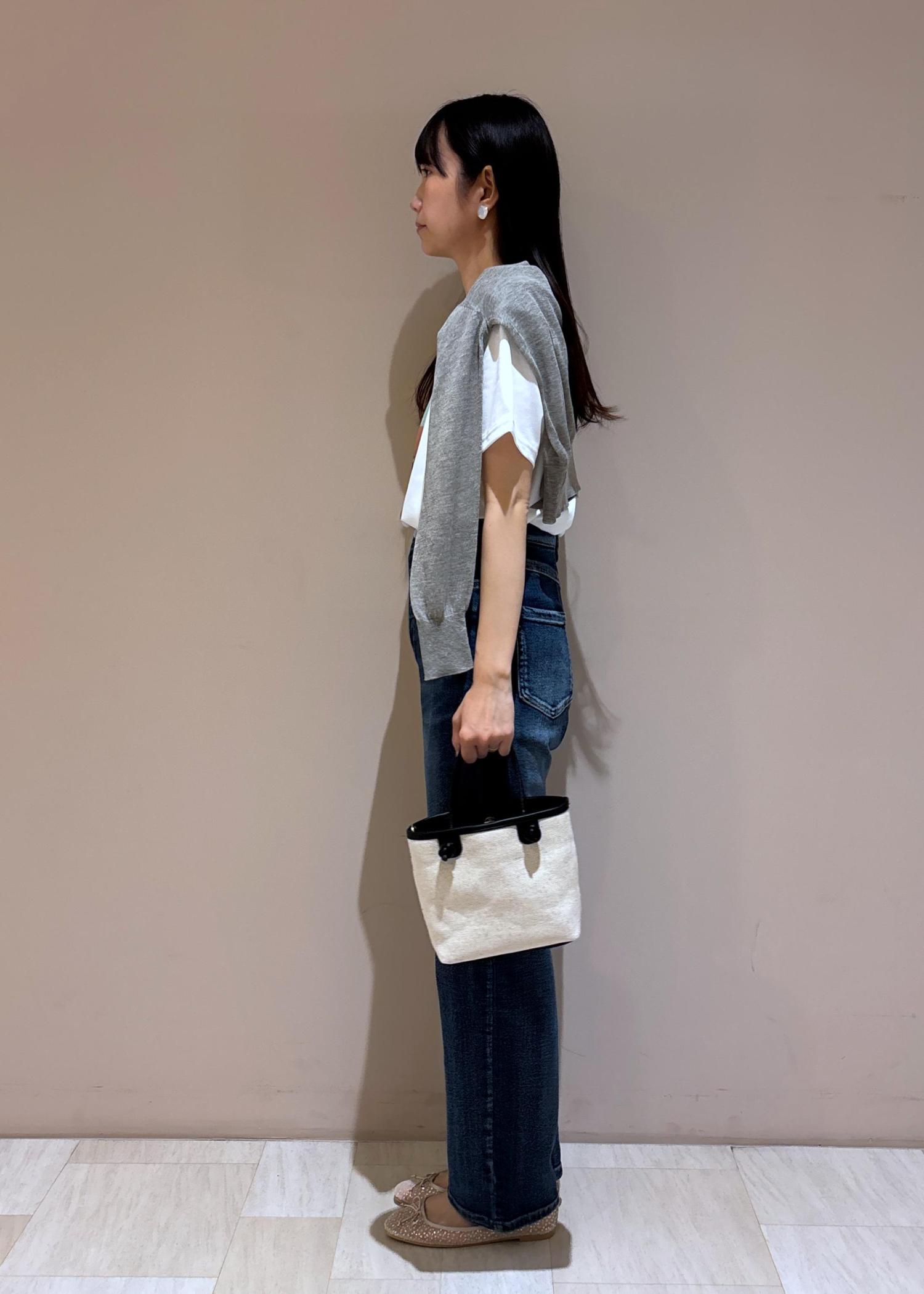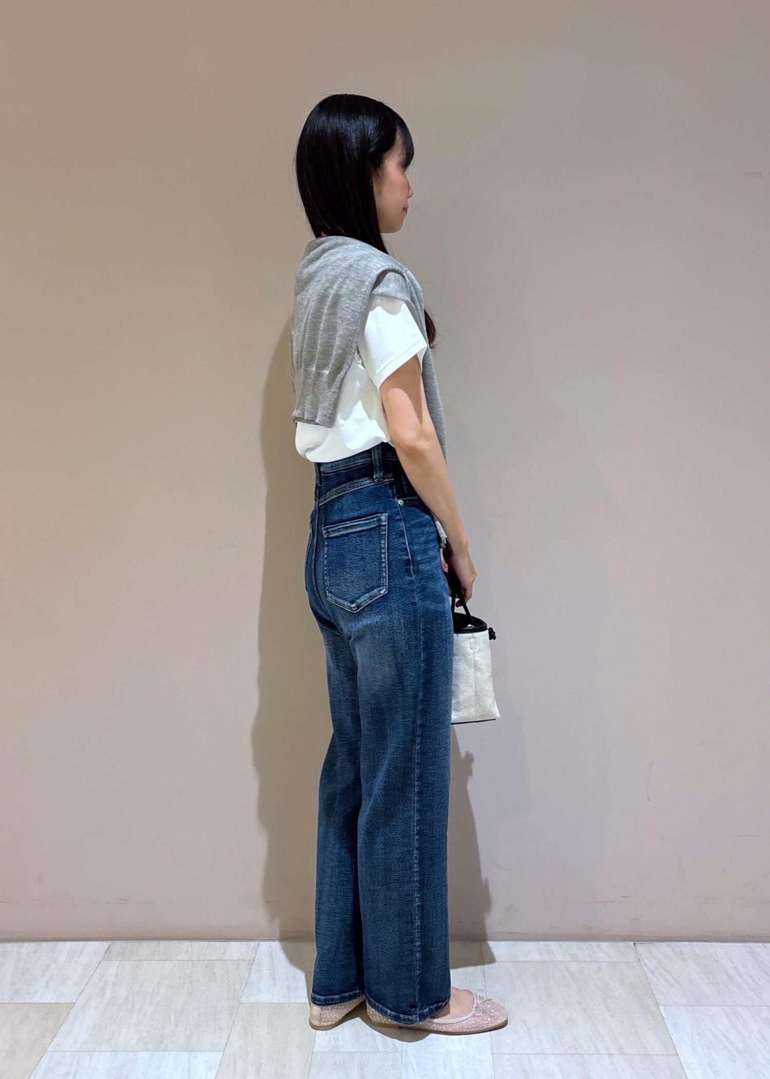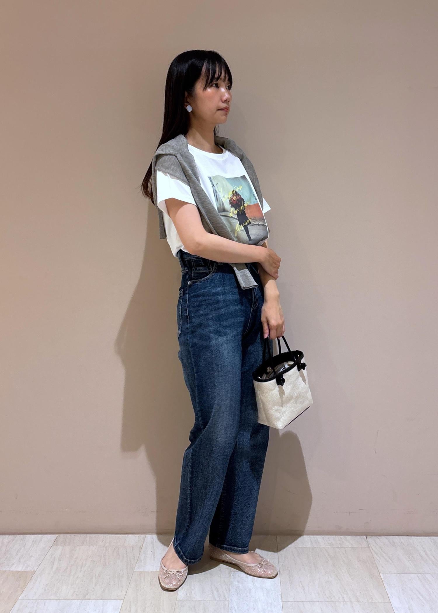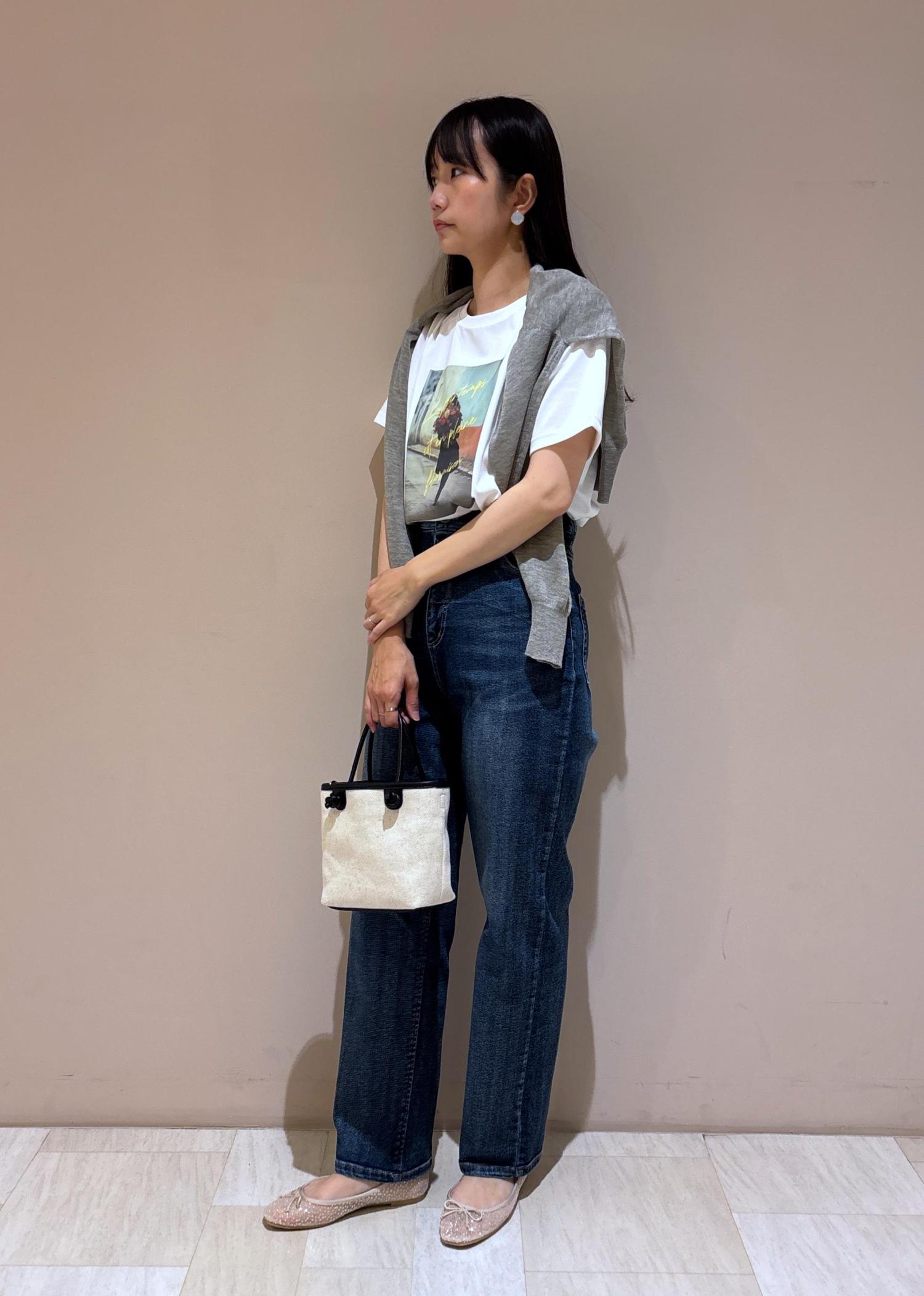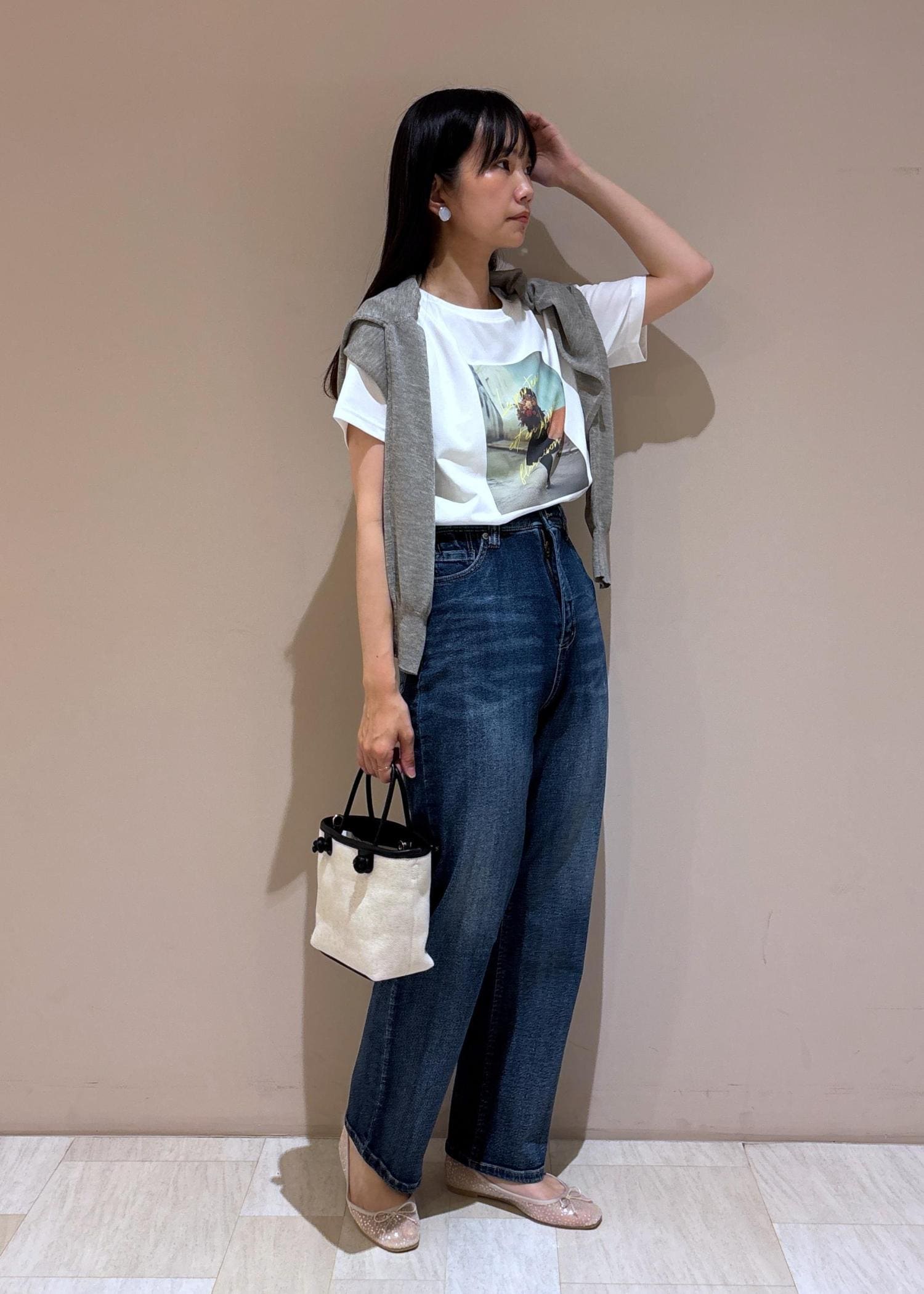 カジュアルになりがちなTシャツとデニムの組み合わせに繊細なラメが入ったカーディガンを肩掛けして、少しきれいめなコーディネートにしてみました。