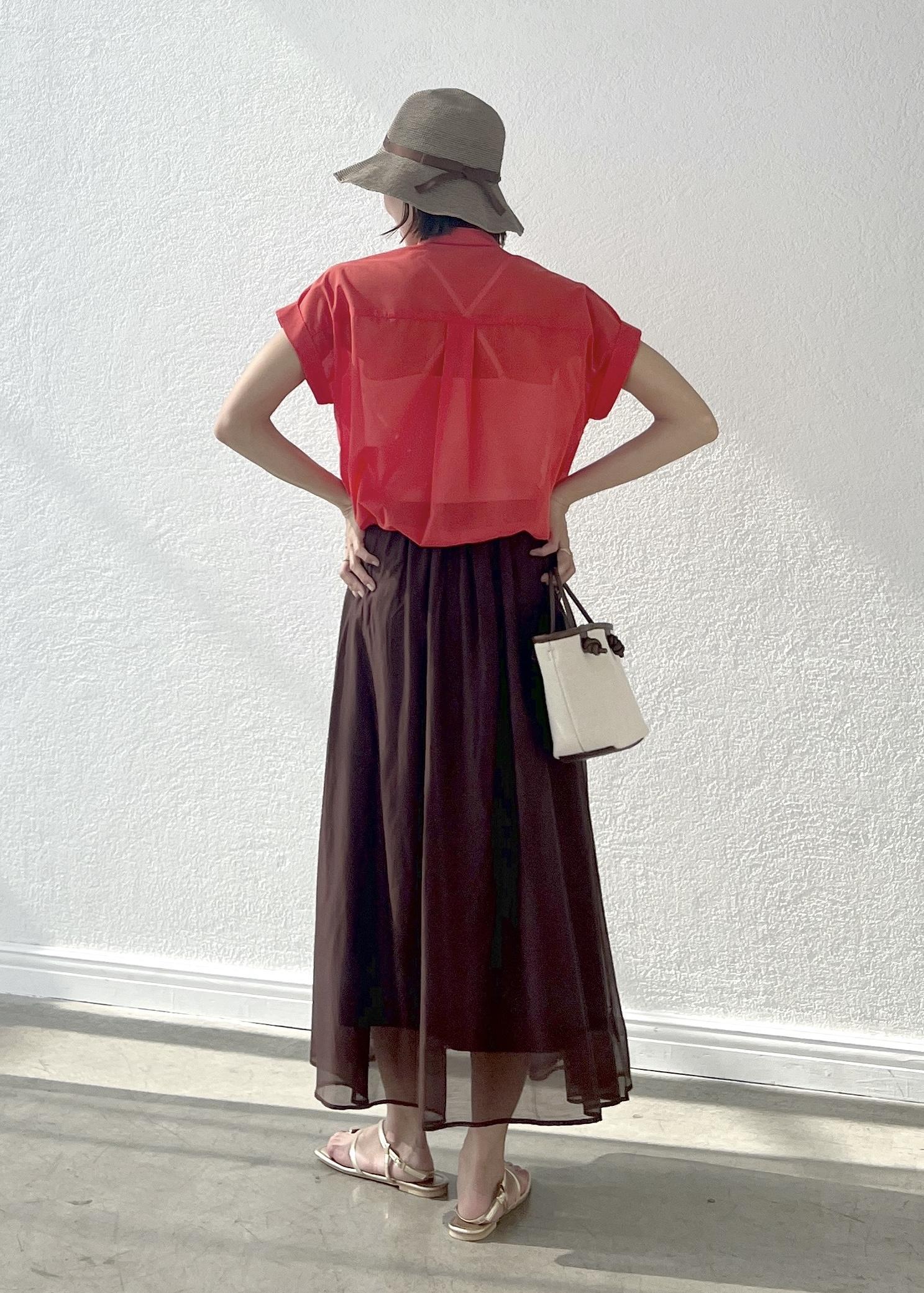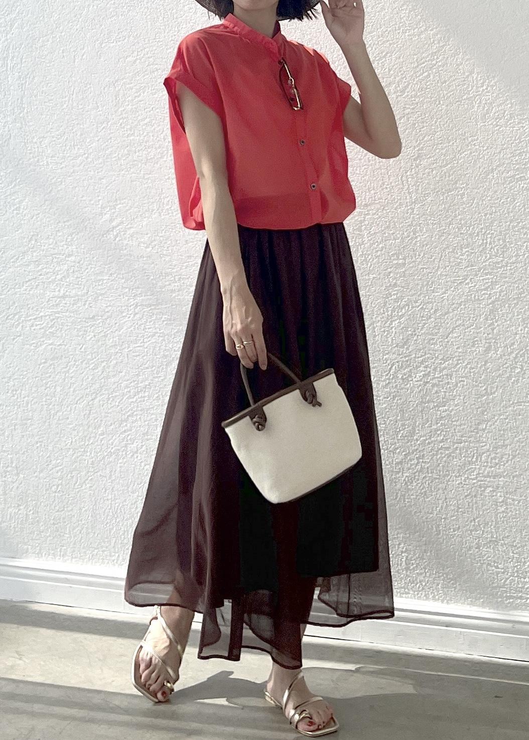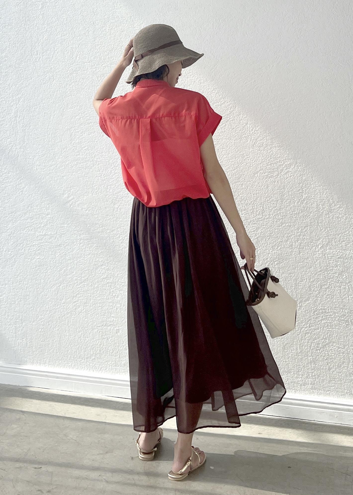 着るだけで華やかなオレンジのシアーシャツは、短丈なのでフレアスカートにも◎。