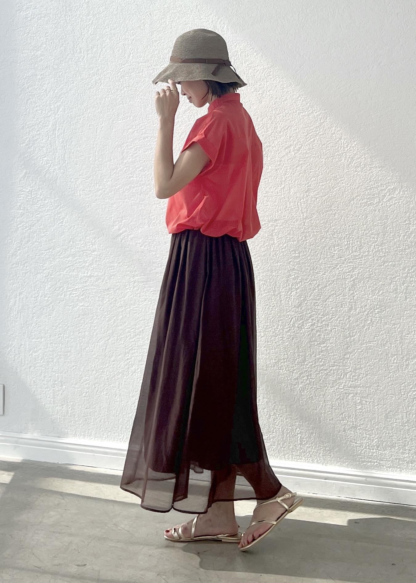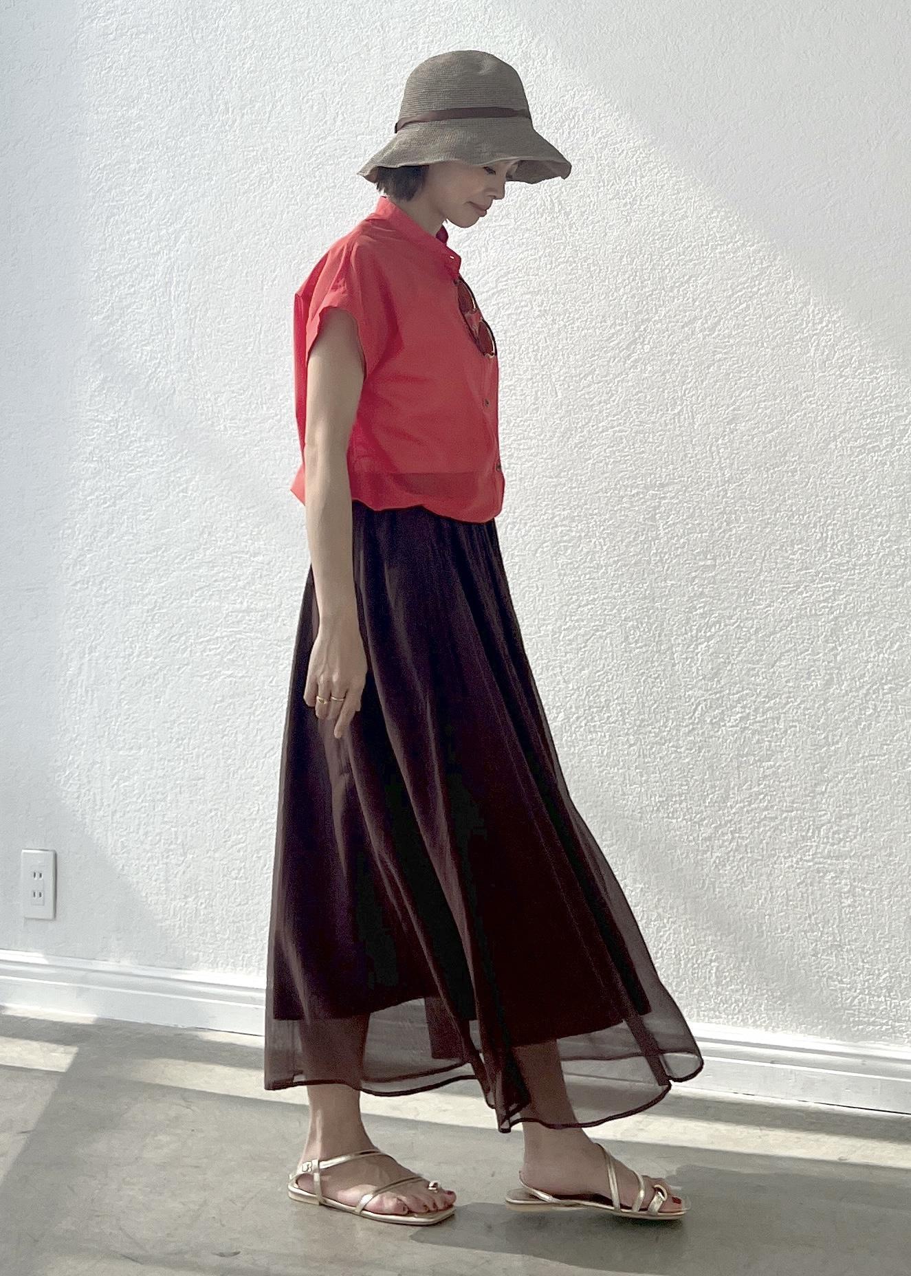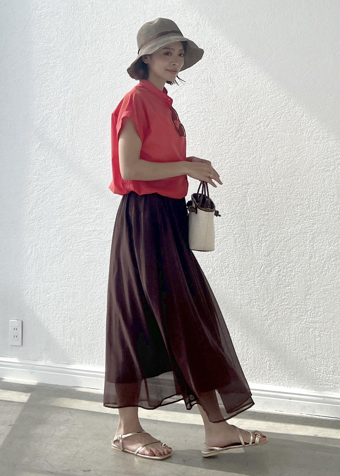 着るだけで華やかなオレンジのシアーシャツは、短丈なのでフレアスカートにも◎。