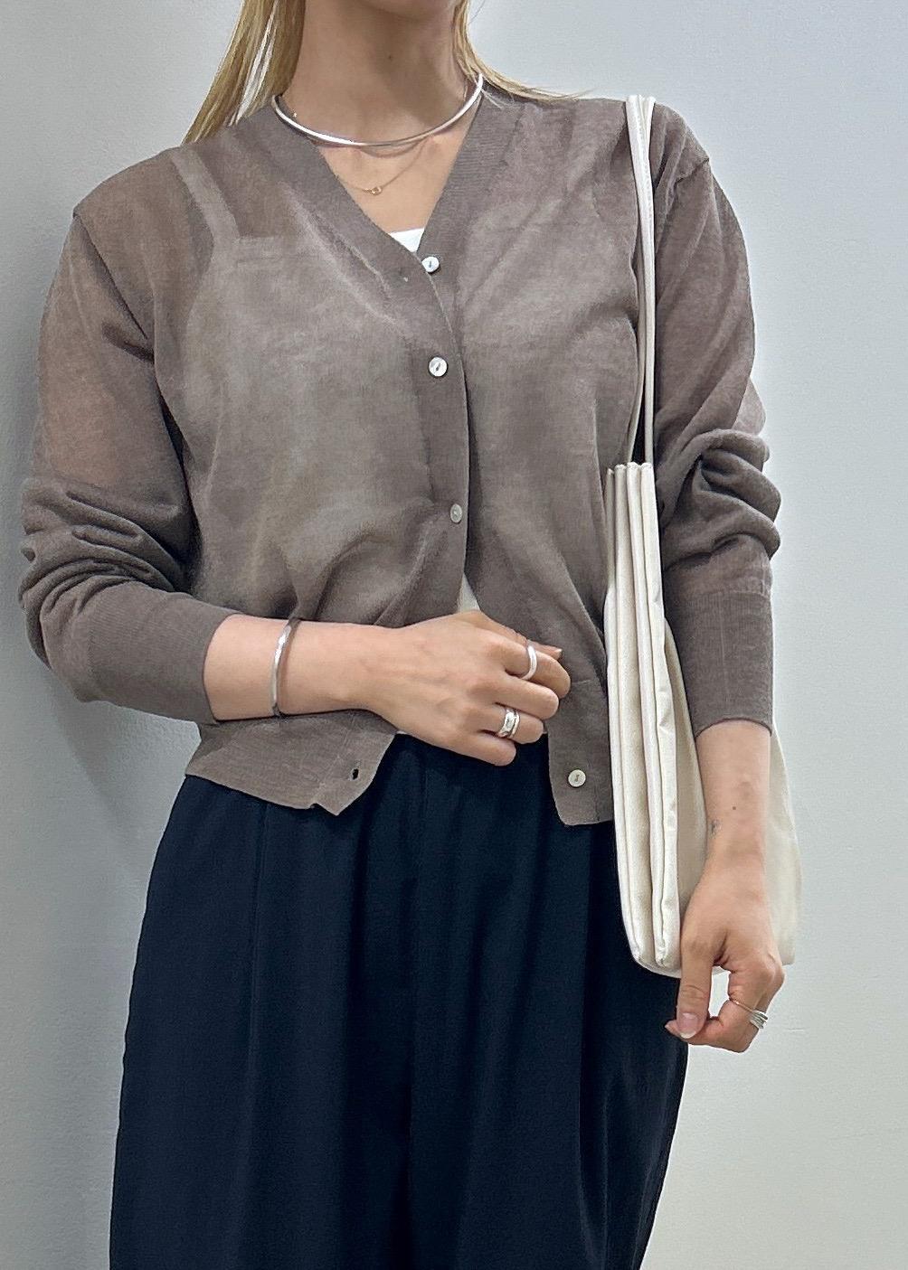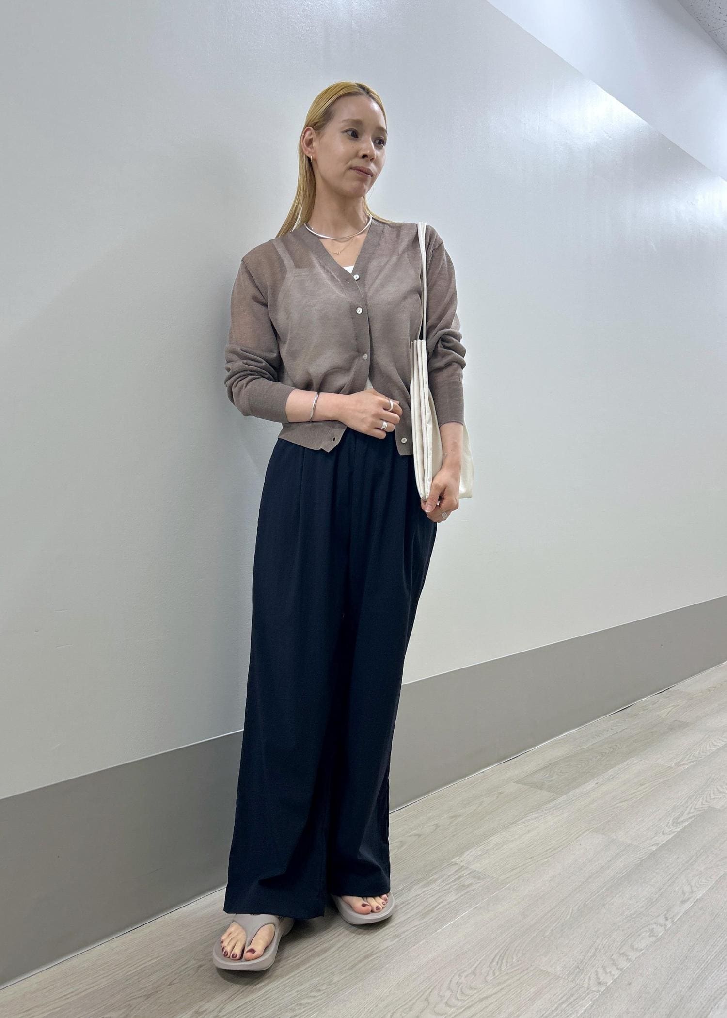 カジュアルになりがちなパンツですが、シアー感のあるトップスと合わせて上品な印象に。