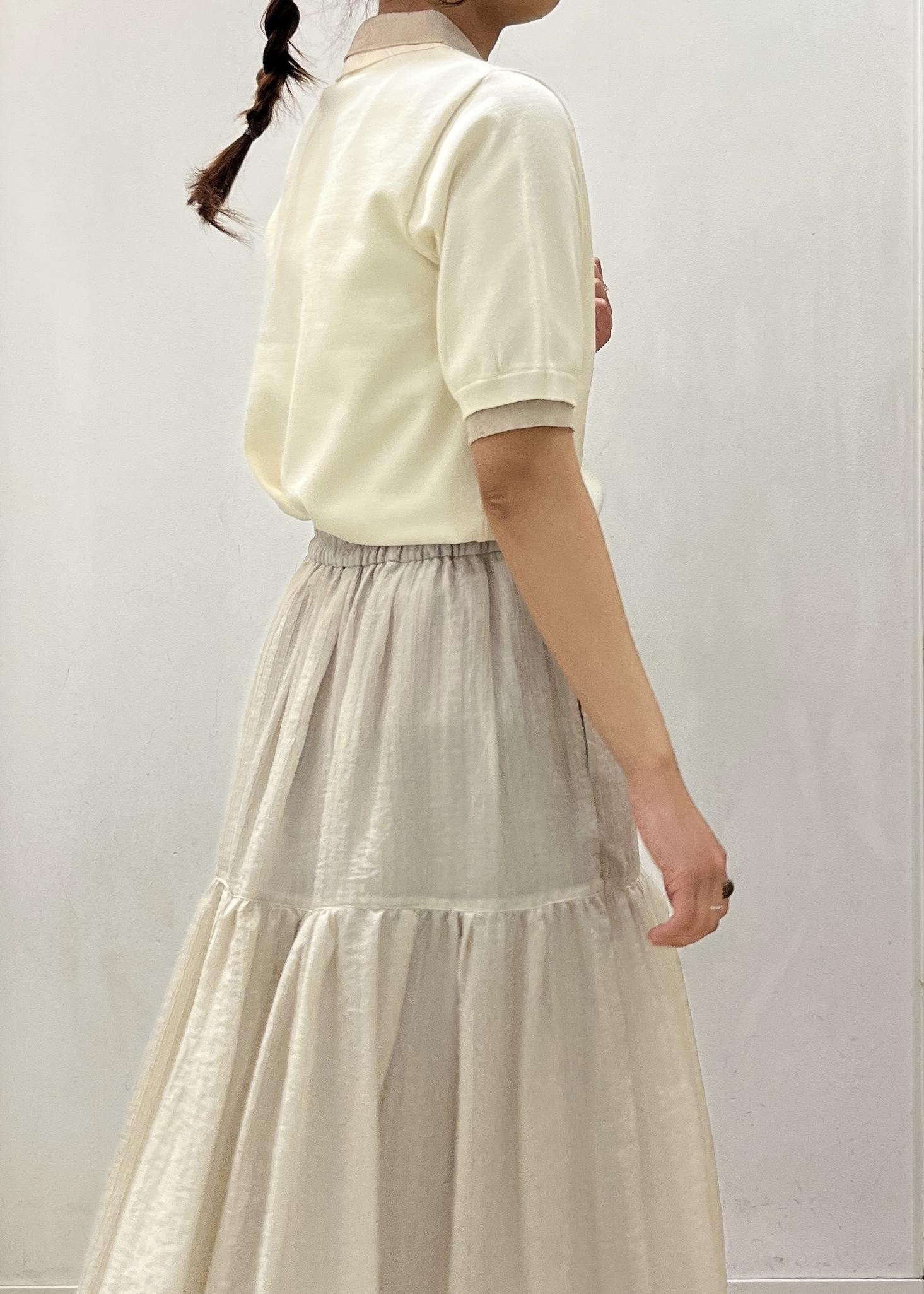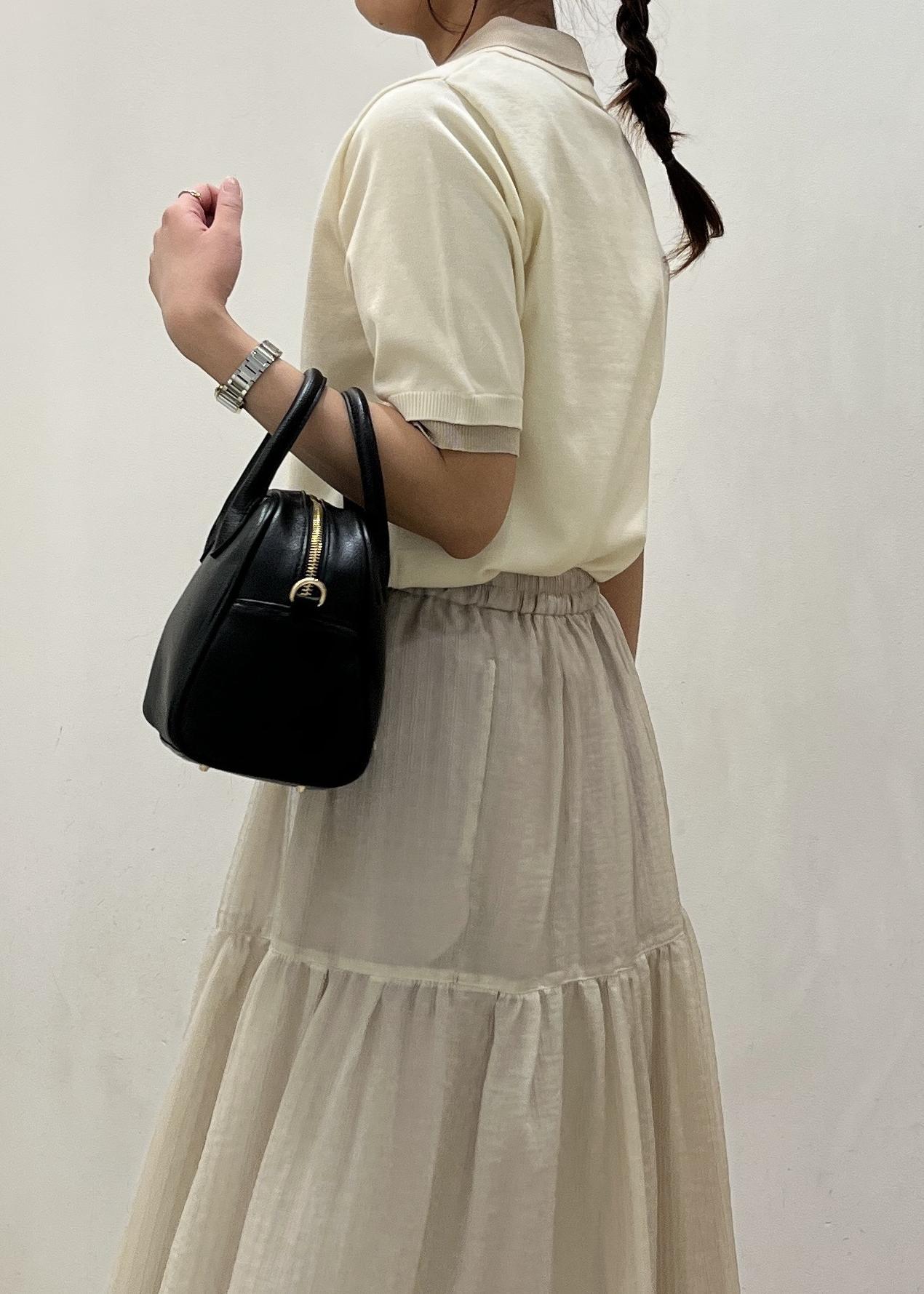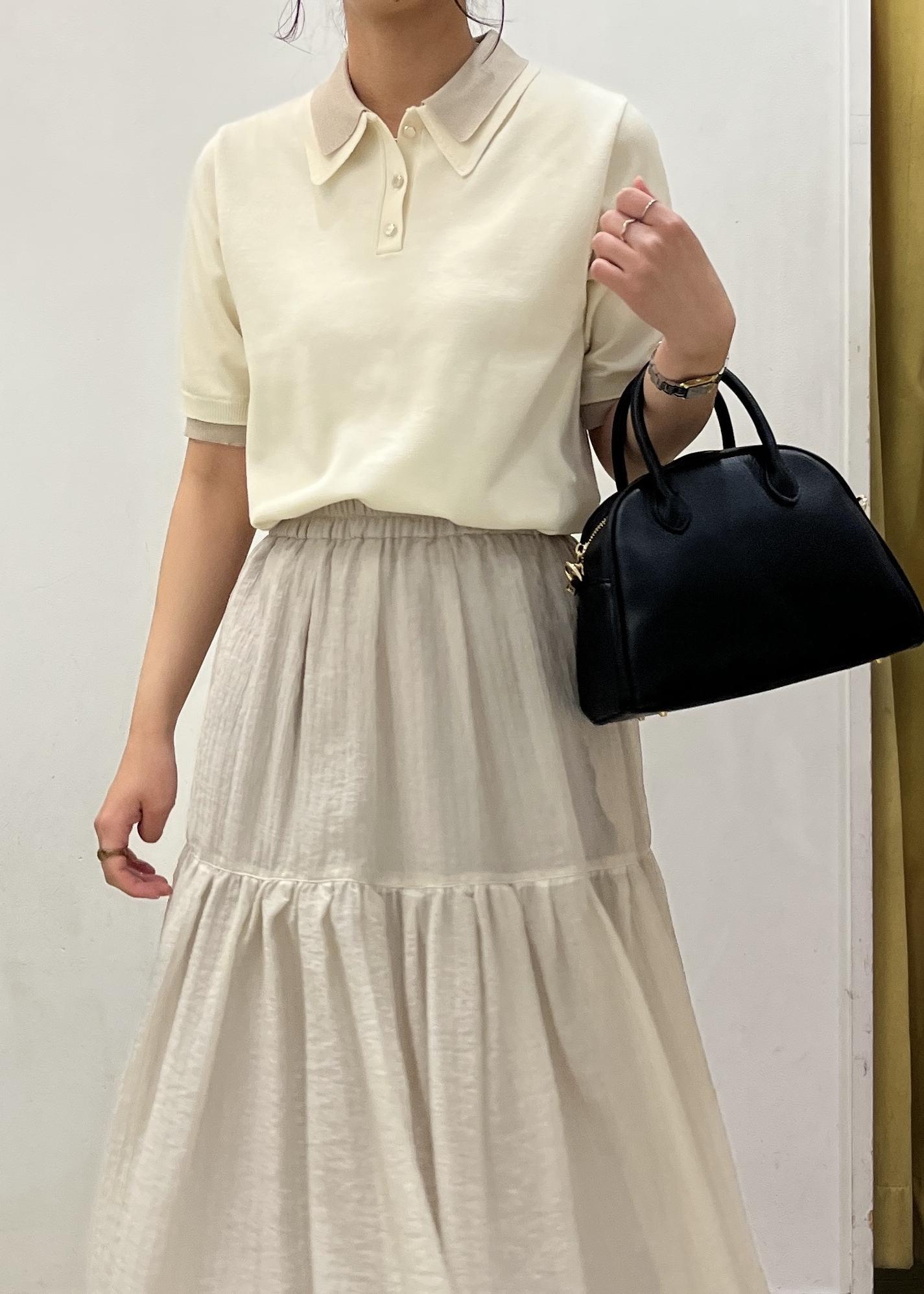 トップスをデザインが珍しいレイヤード風ニットポロシャツで合わせて、ボトムをスカートで合わせ女性らしい印象になるコーディネートにしました♪