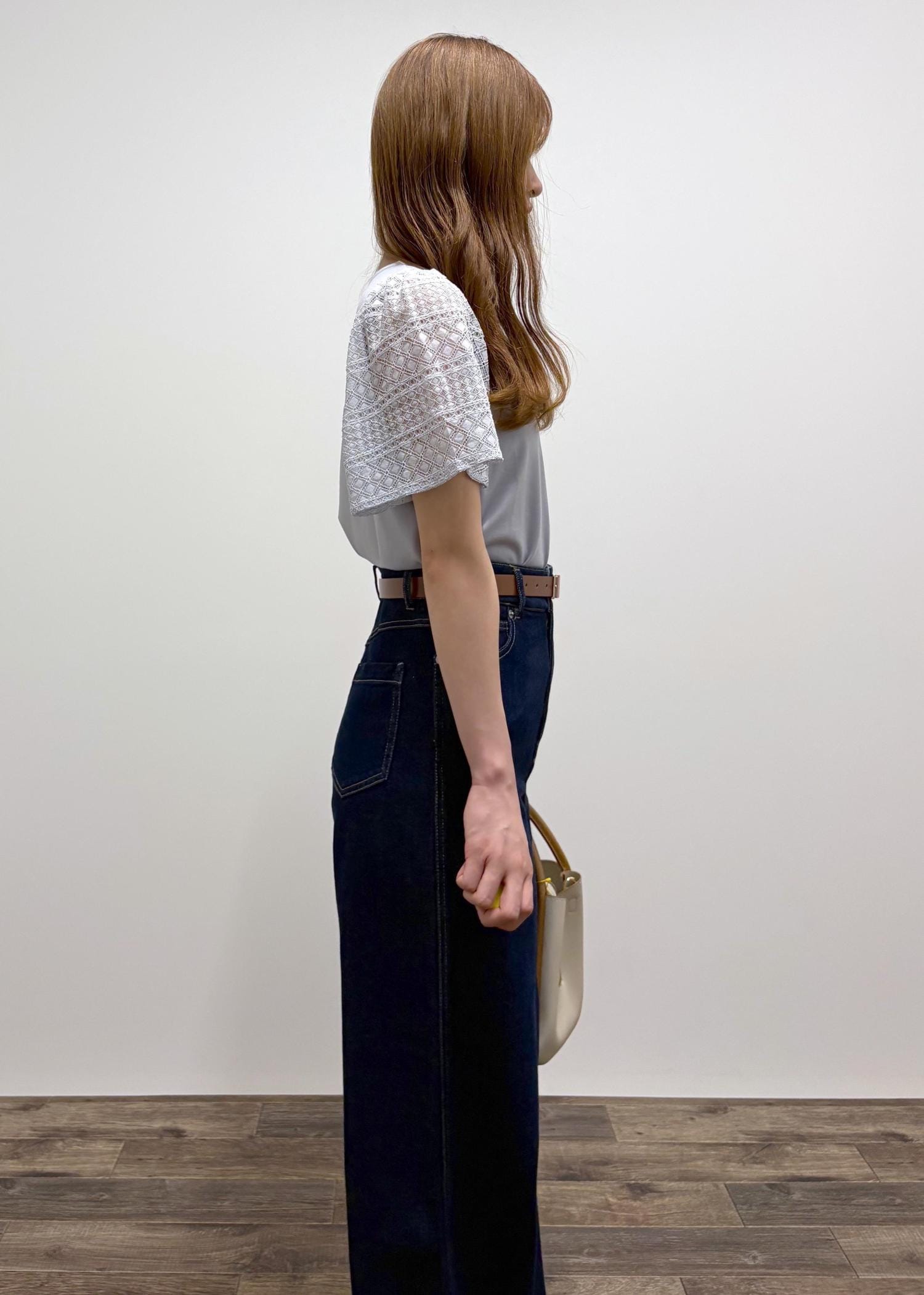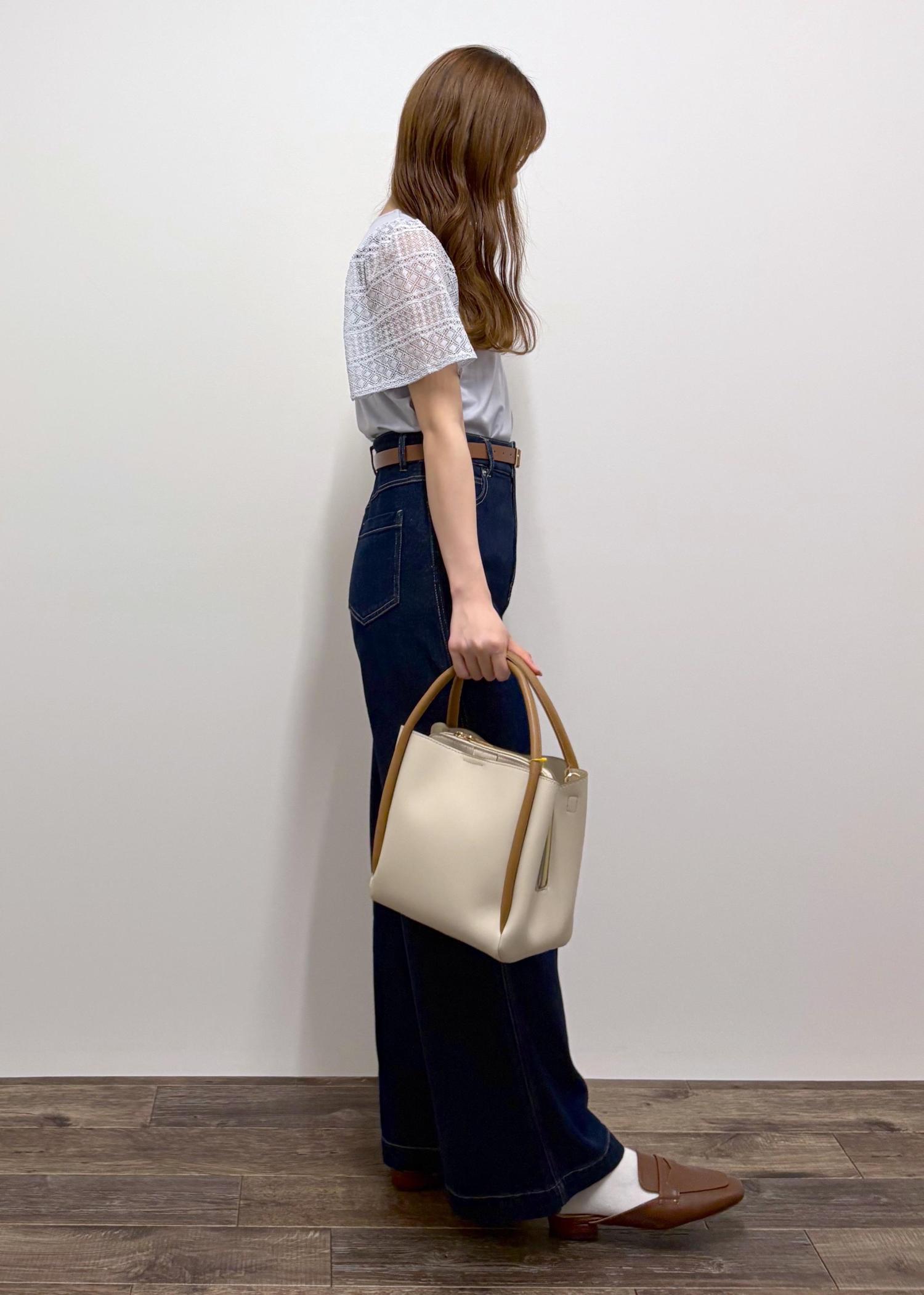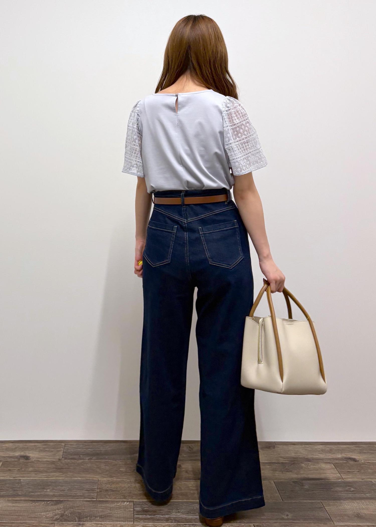 袖がレースになっている可愛らしいトップスにカジュアルなワイドデニムパンツを合わせた「カジュアルガーリーコーデ」に仕上げました!