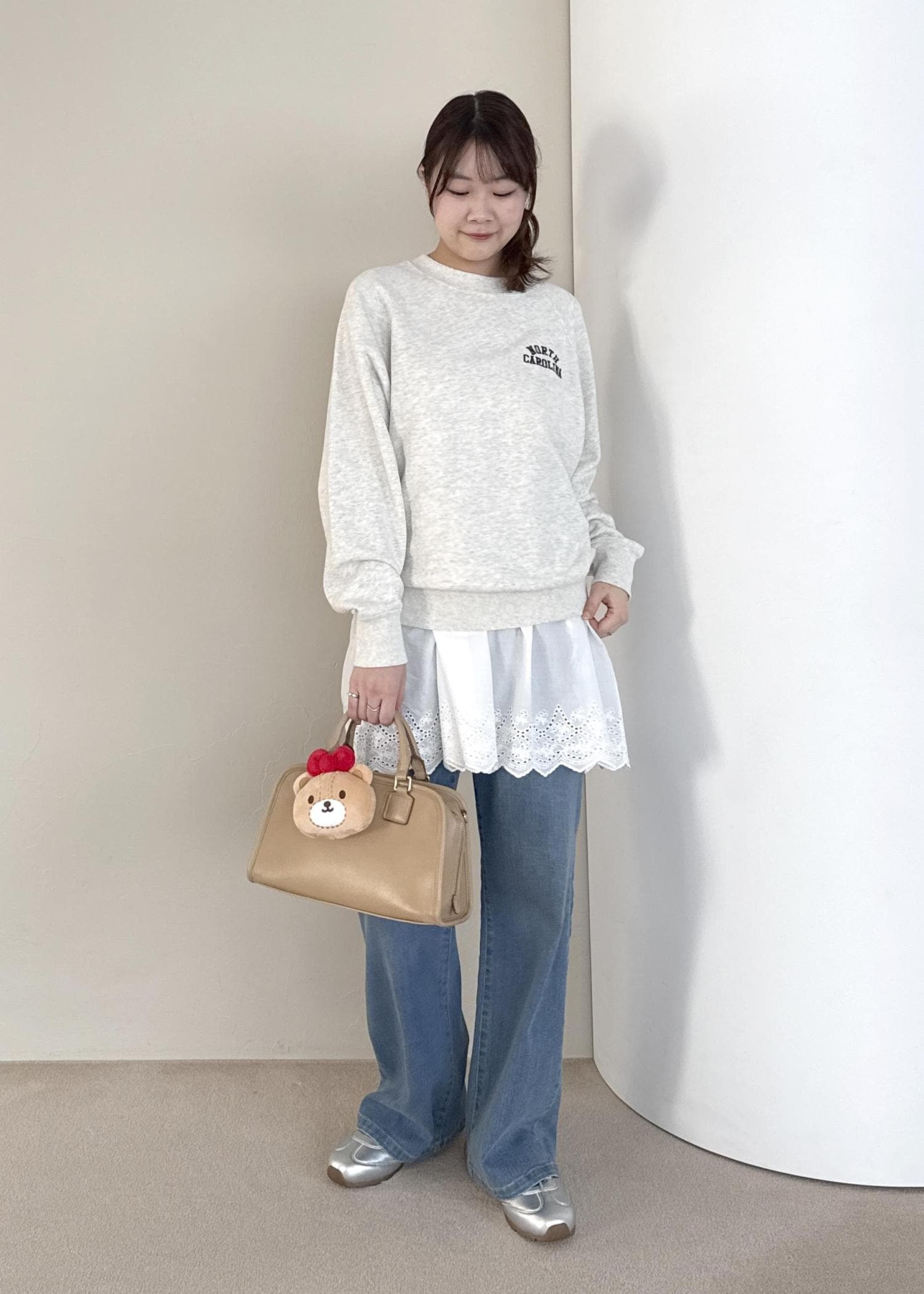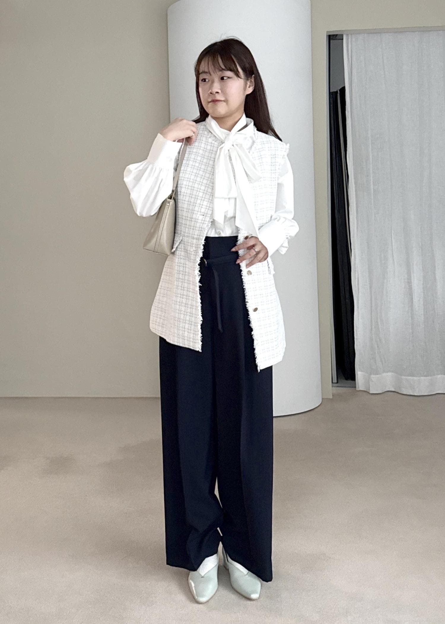 色味をホワイト、ブラウン、ベージュの3色でまとめ、大人らしい印象で着用しました。