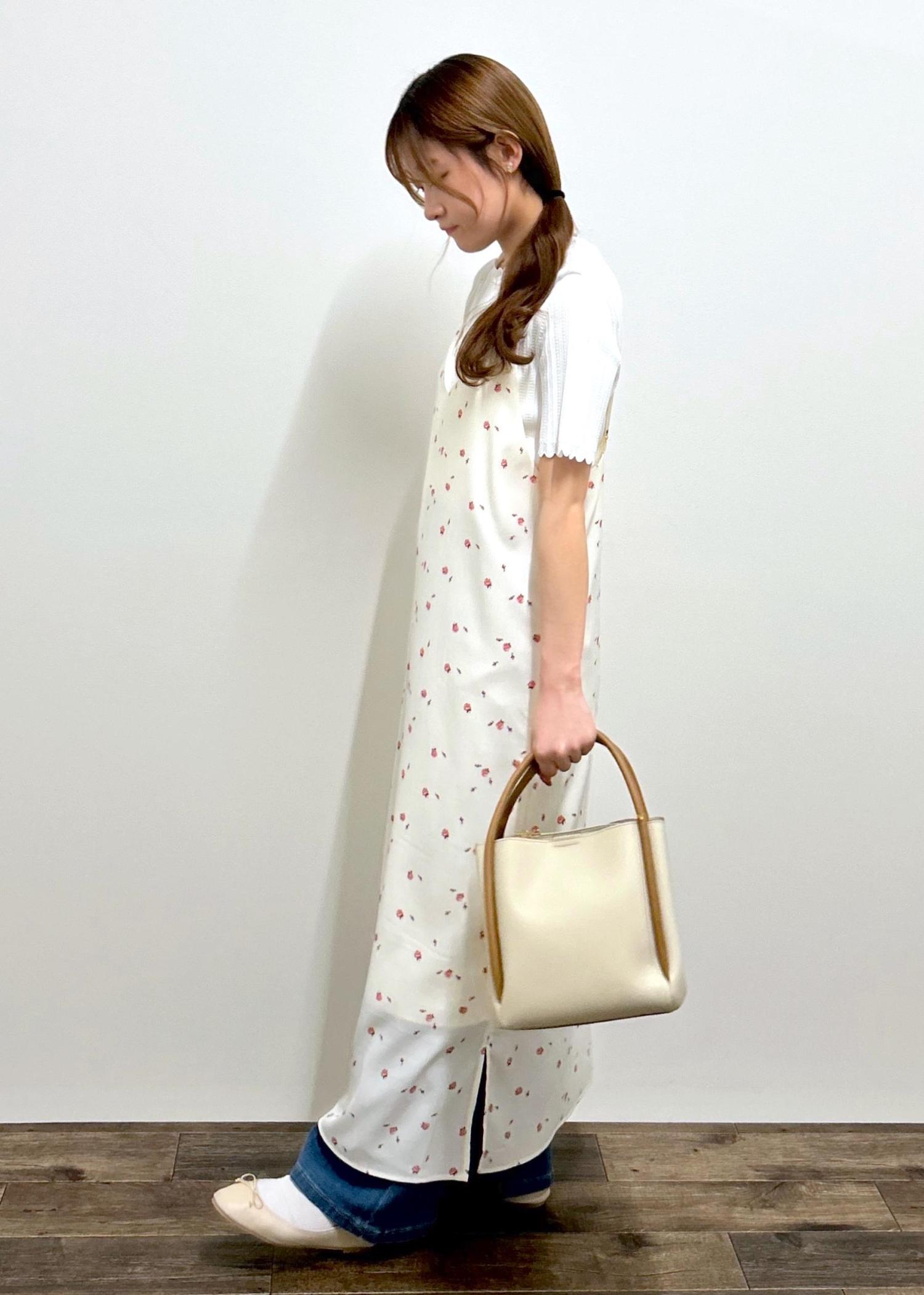 花柄のキャミワンピースにフレアデニムパンツを合わせることで、可愛くなりすぎない「カジュアルガーリーコーデ」に仕上げました!