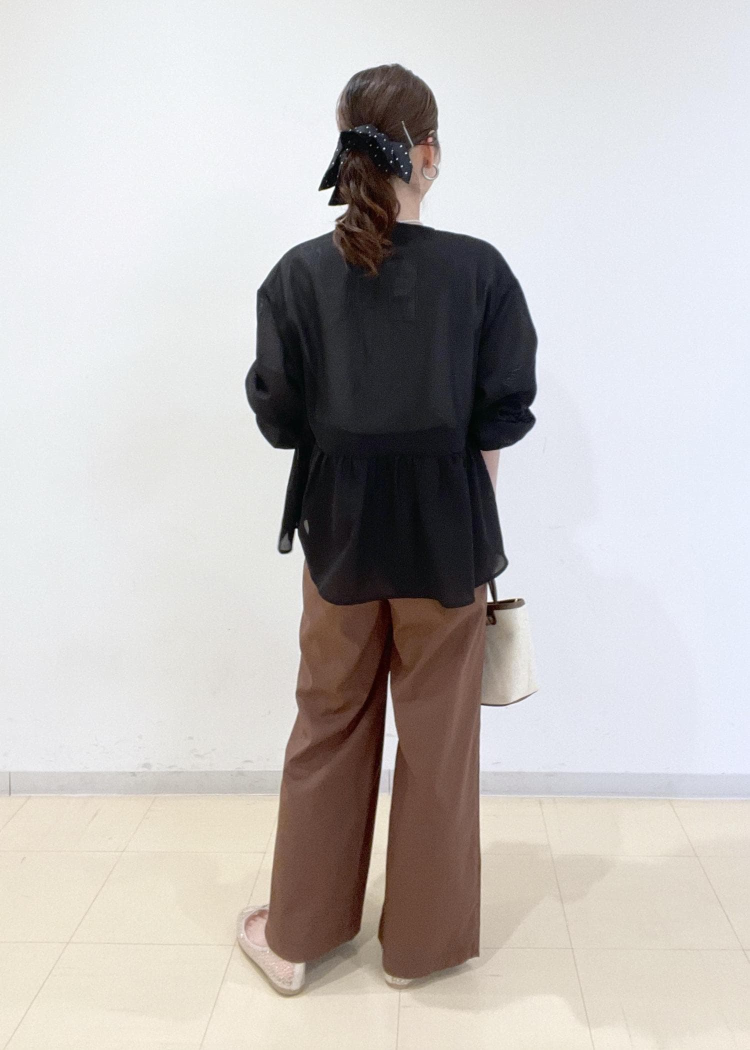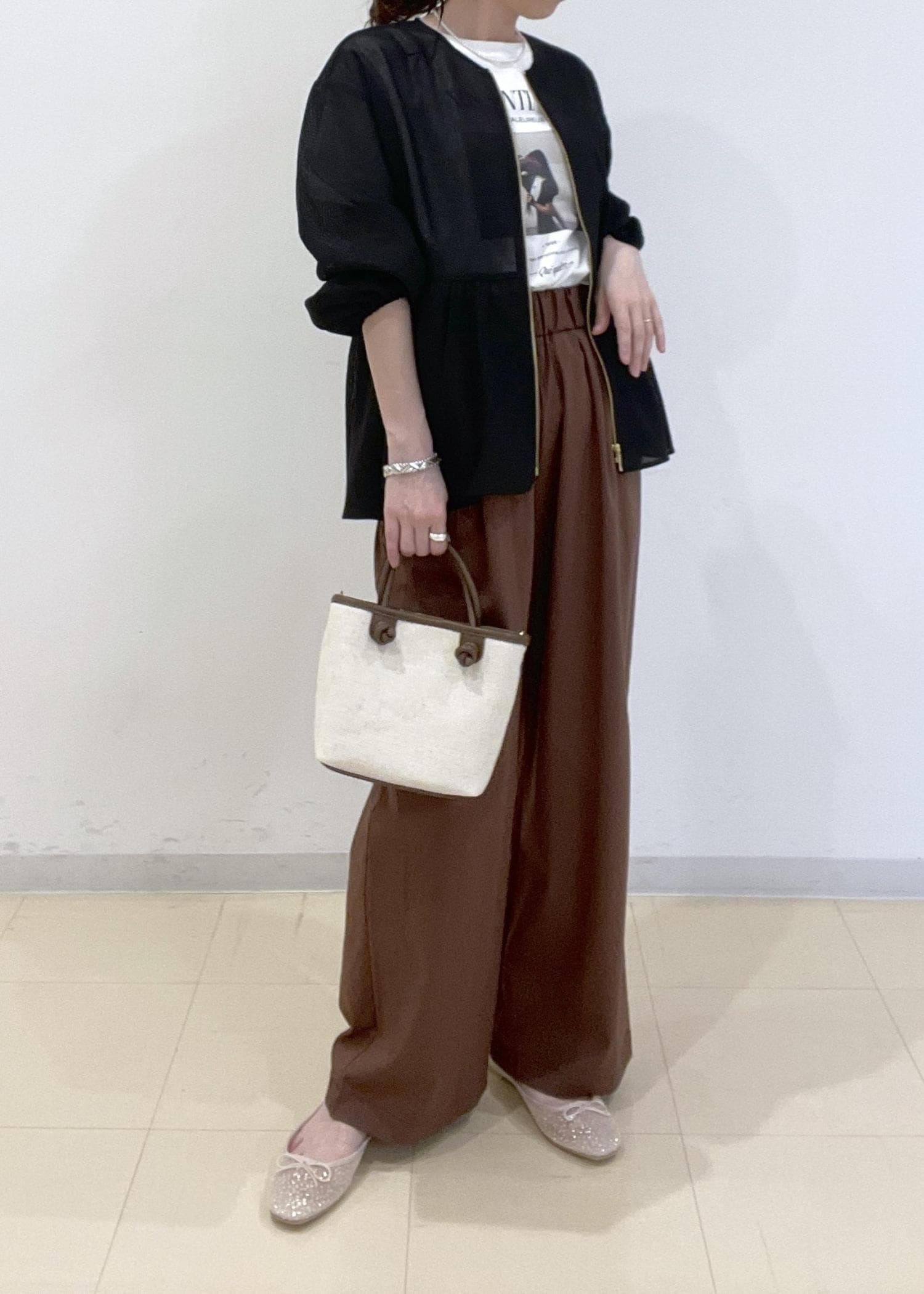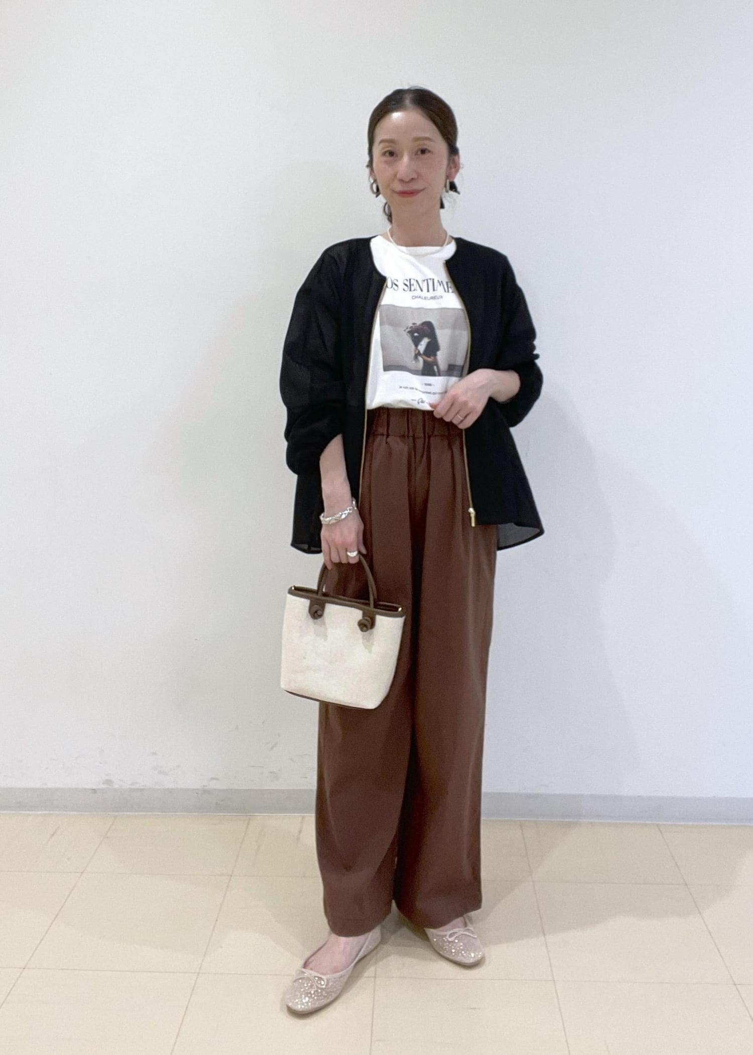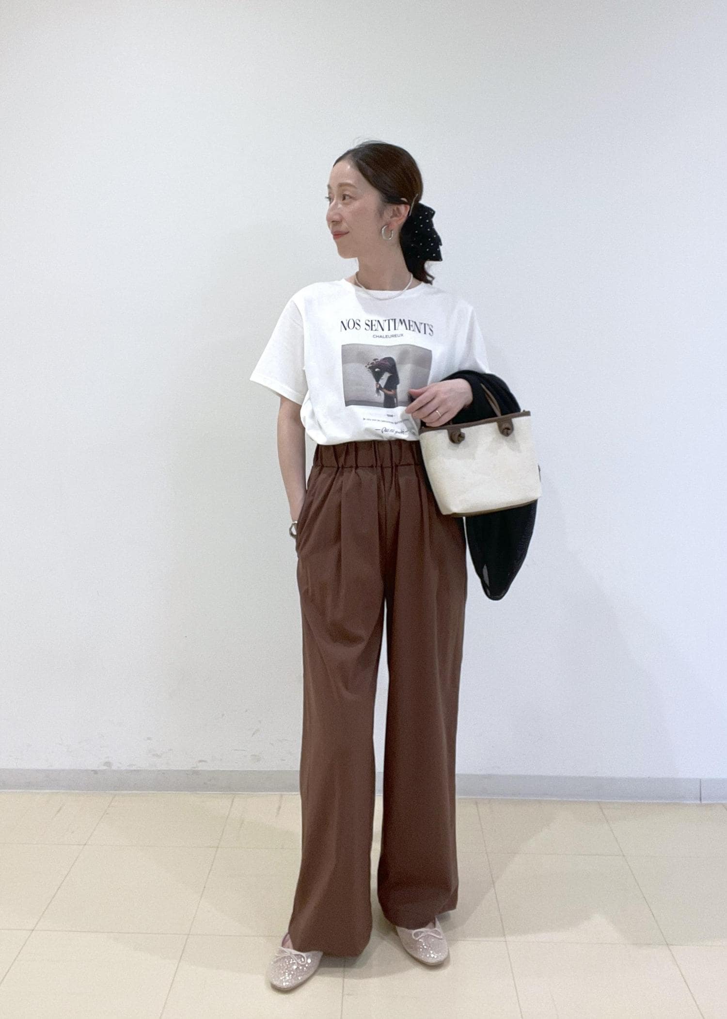 ボトムはウエストゴムのさらっとしたワイドパンツ。