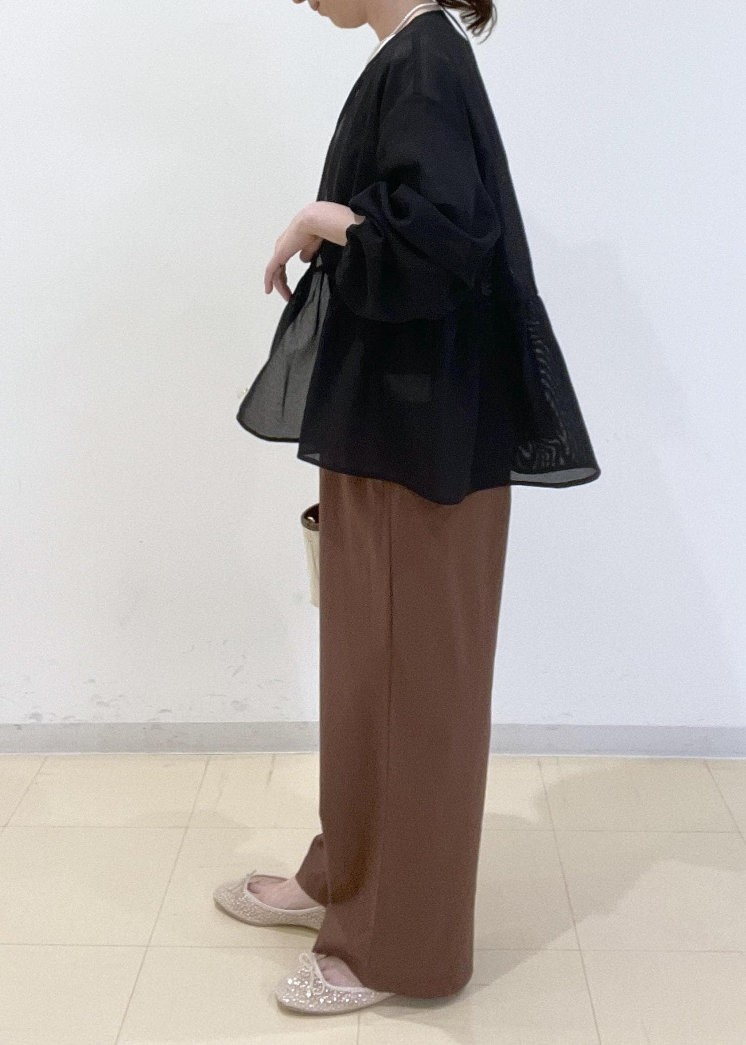 さらっとした素材感で、夏も快適に着ていただけます。脚のラインを拾わないワイドパンツですが、落ち感もあるため広がりすぎず、すっきりとしたシルエット。