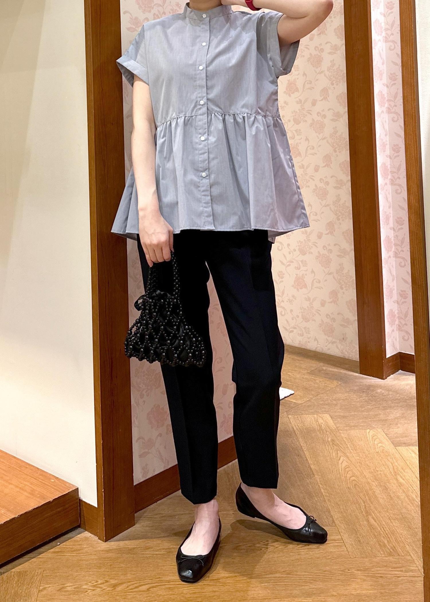 ブラウスはブルー(44)のカラーとネイビーのテーパードパンツを合わせてお肌に透明感が出るような色合わせを意識してみました。着るだけでバランスよく見せてくれます◎
