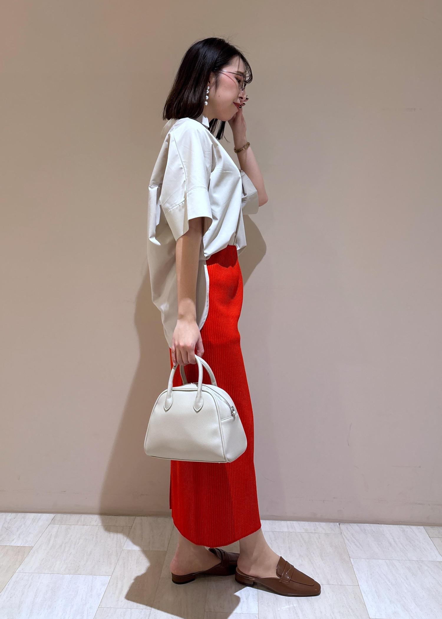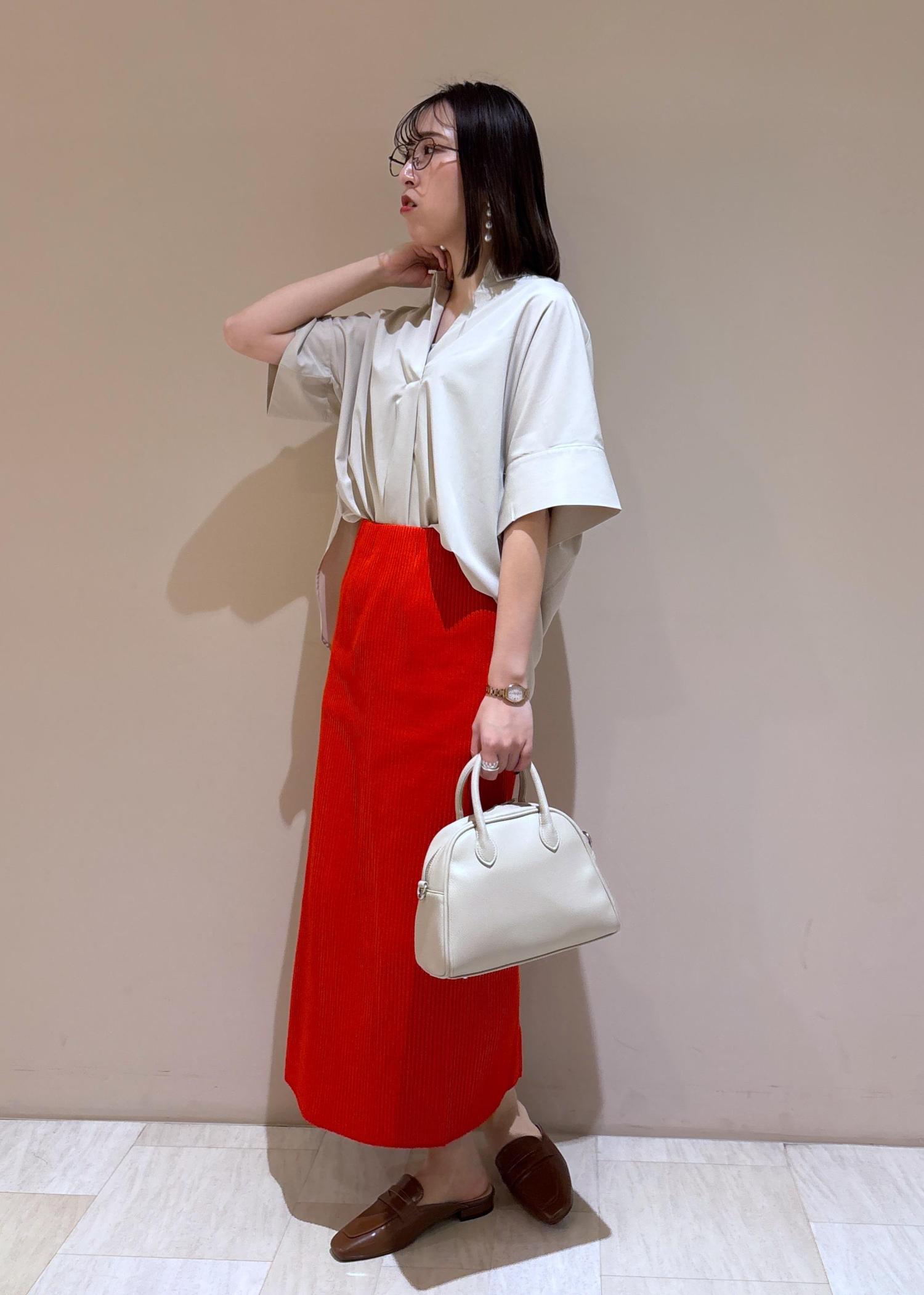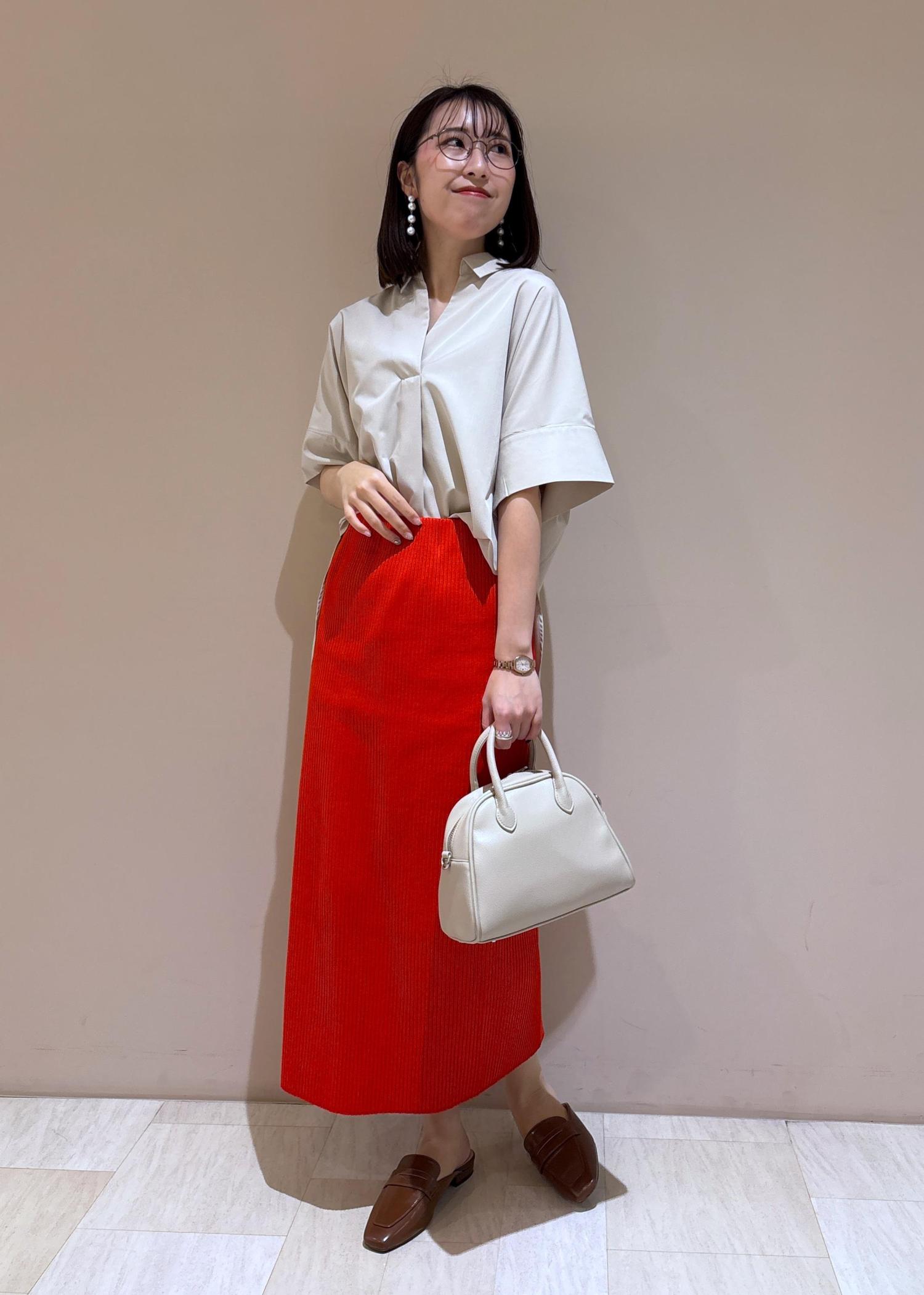 人気のアイラインスカートの新色を使ったオフィスカジュアルコーデ。