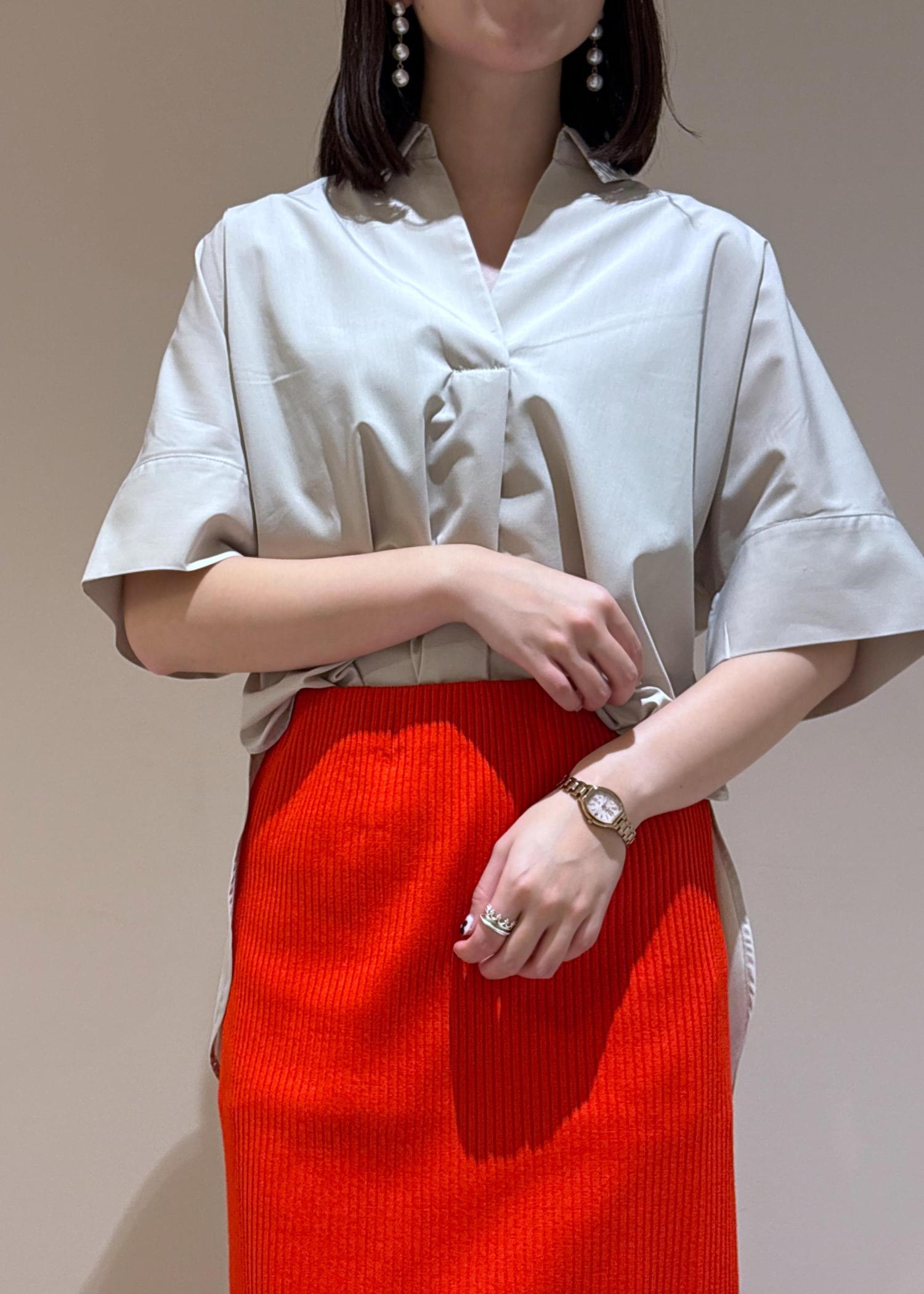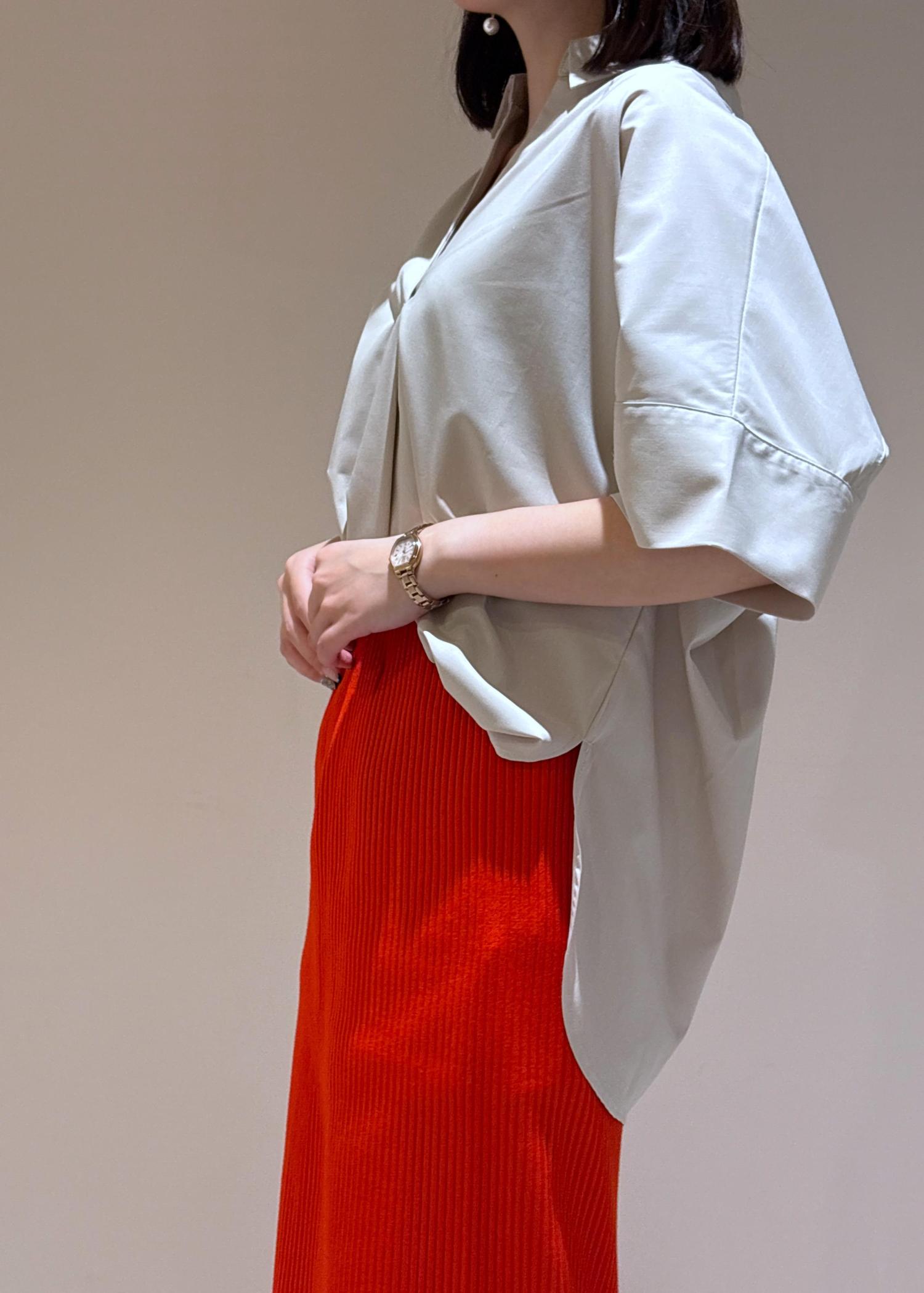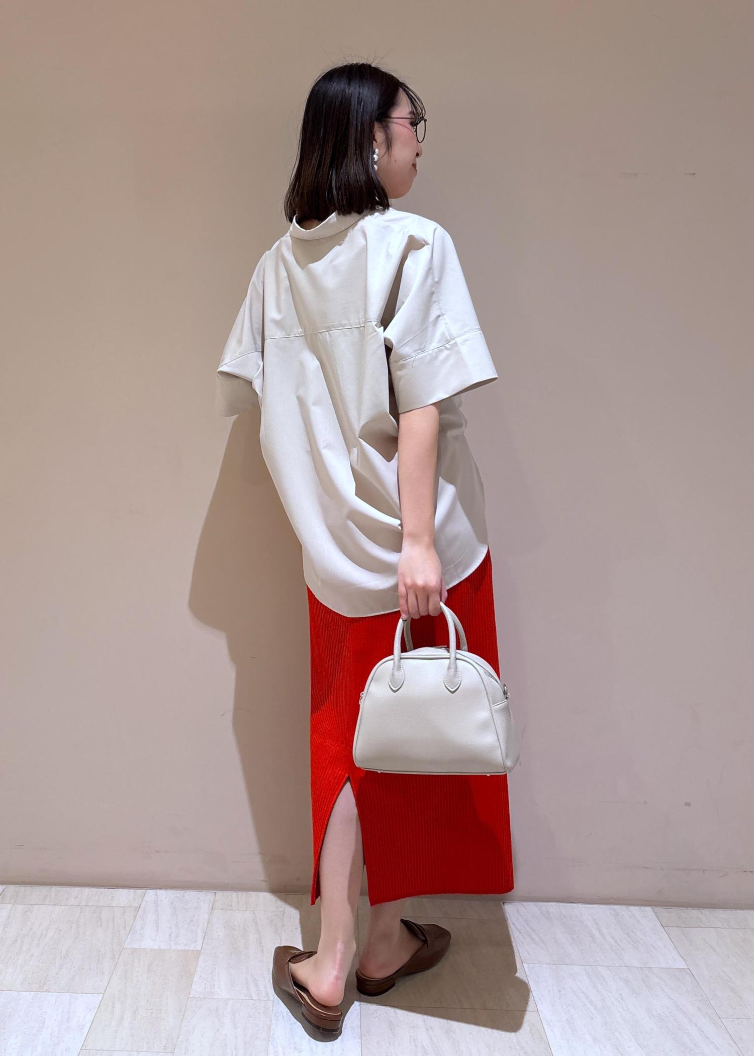人気のアイラインスカートの新色を使ったオフィスカジュアルコーデ。