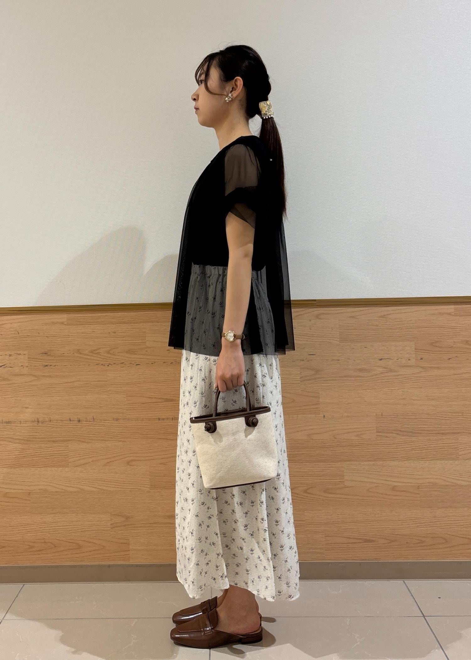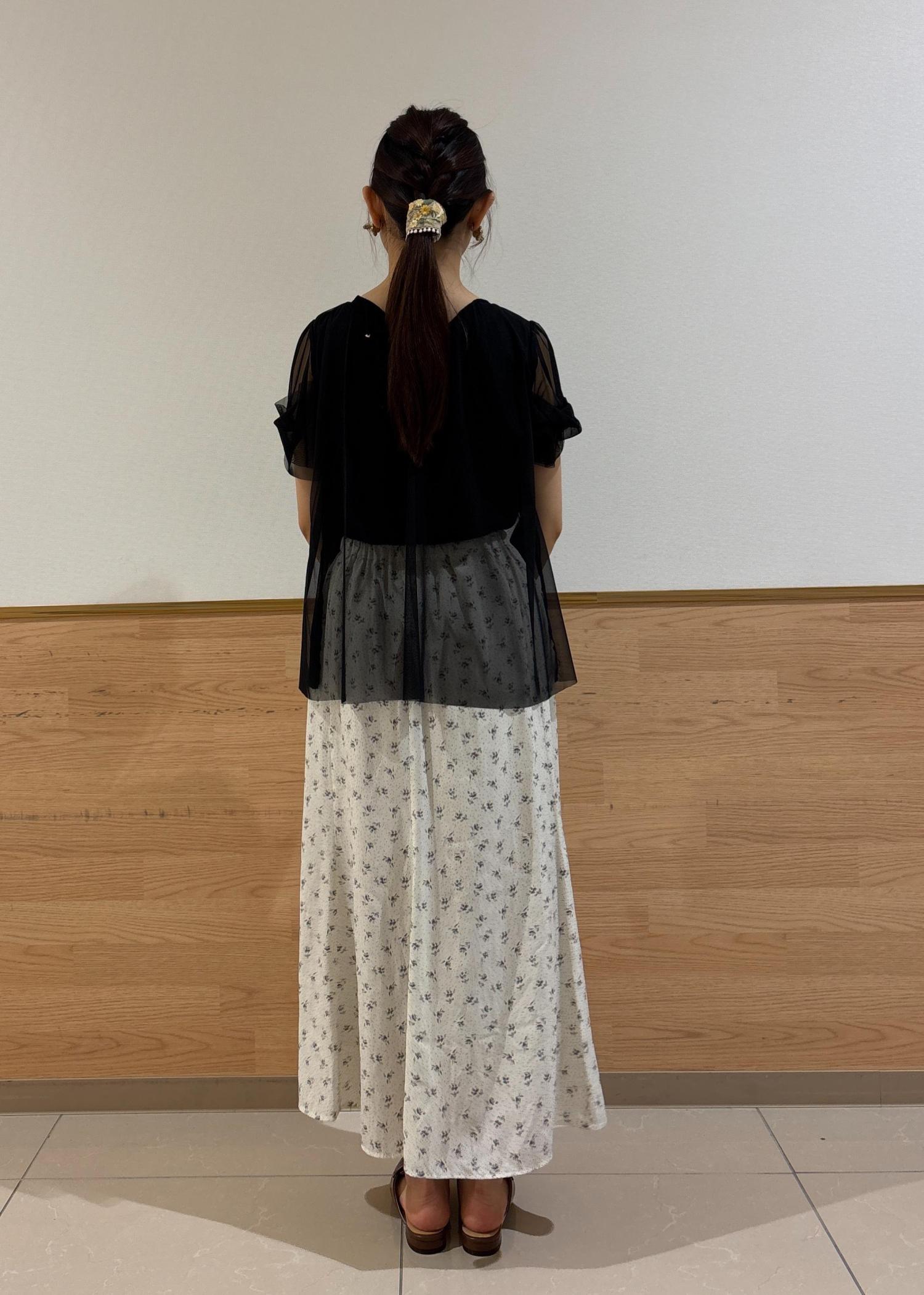 ブラックのチュールトップスにホワイト系の小花柄スカートを合わせ可愛らしいスタイリングにしました。