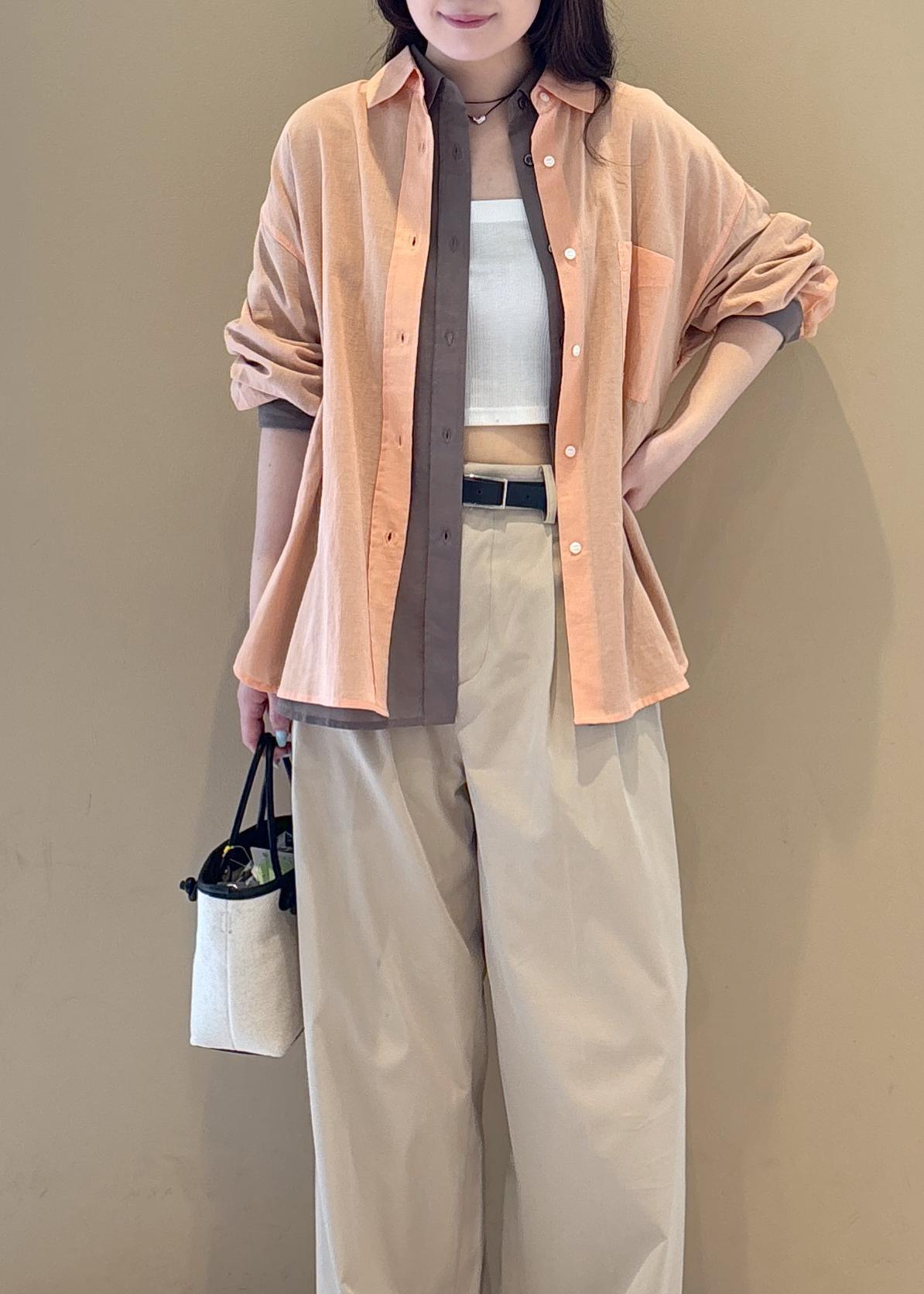 新鮮でトレンド感のあるシャツのレイヤードスタイル。より薄い色を上から重ねるようにするとコントラストが綺麗です。コーデ全体を同系色にするとまとまりが出て挑戦しやすいです。