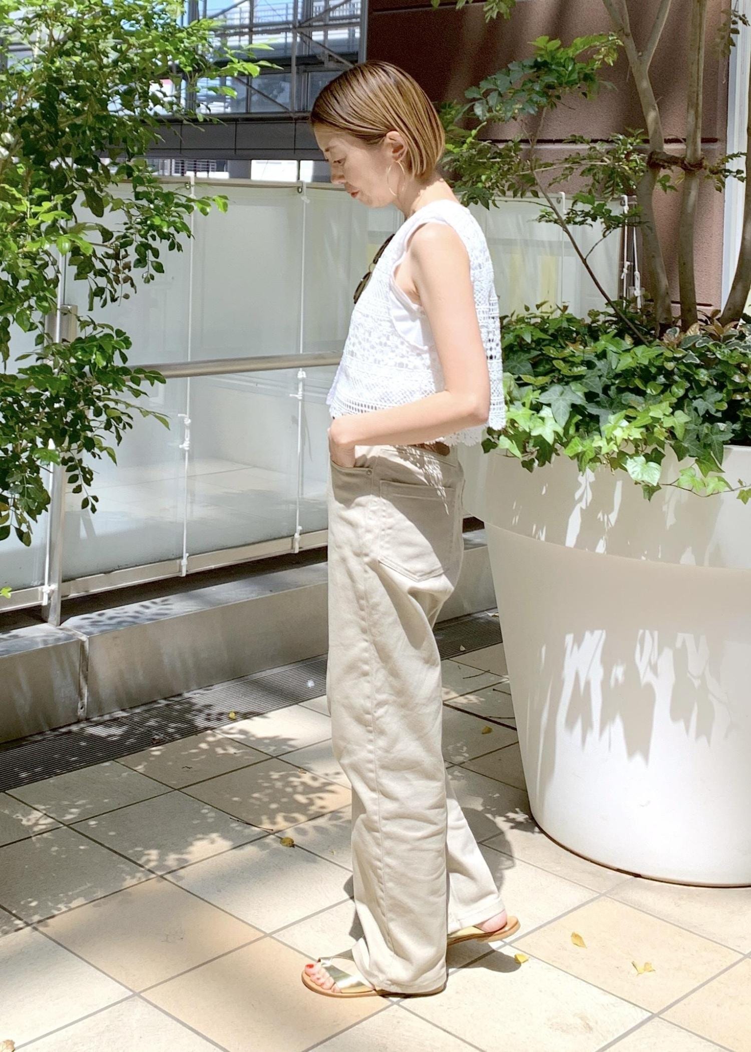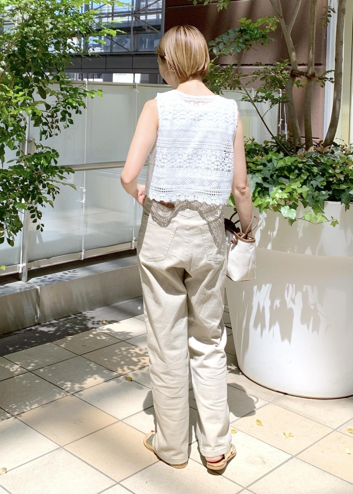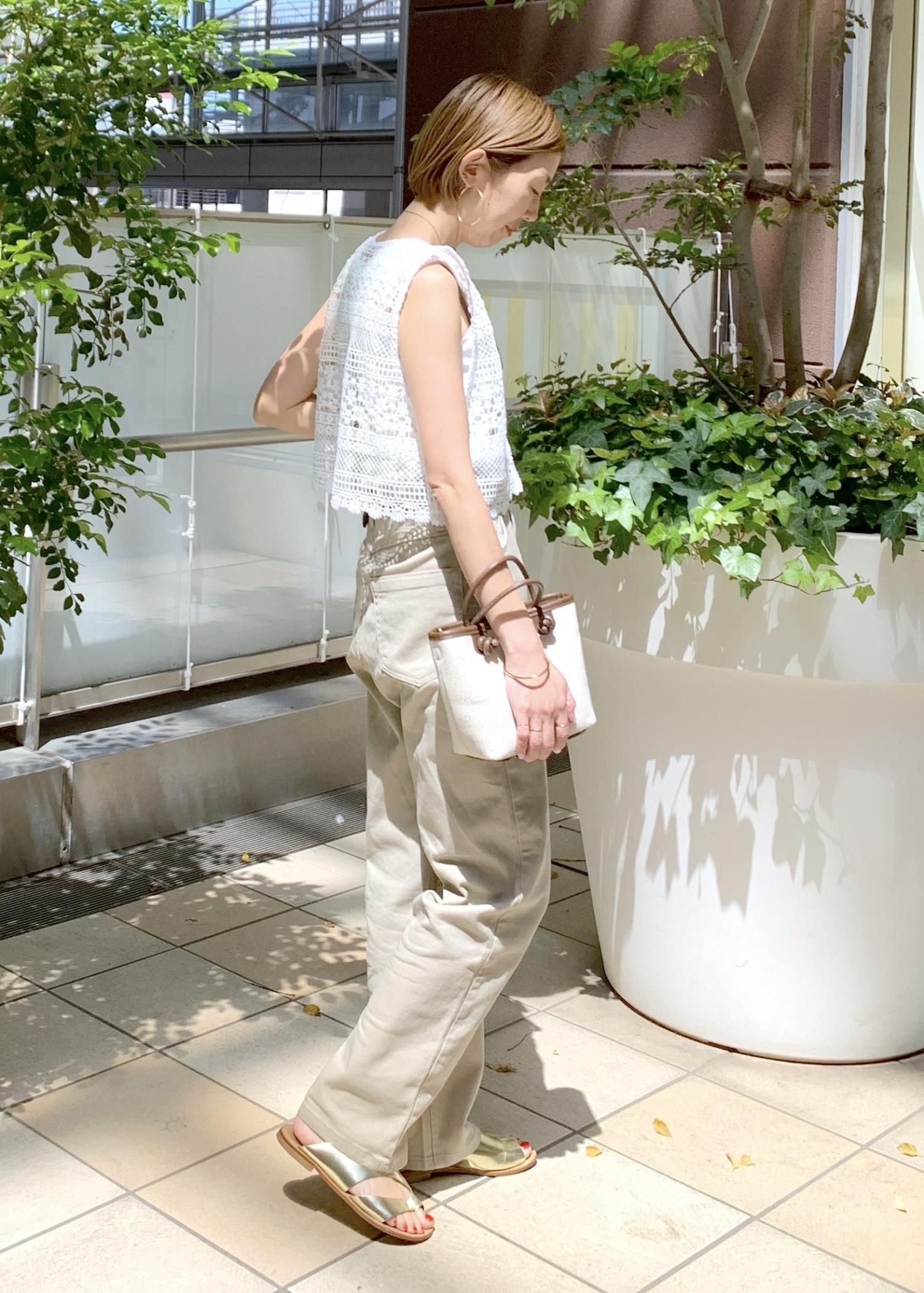 タンクトップの上にレースベストを羽織ったレースベストが主役の夏スタイリング。