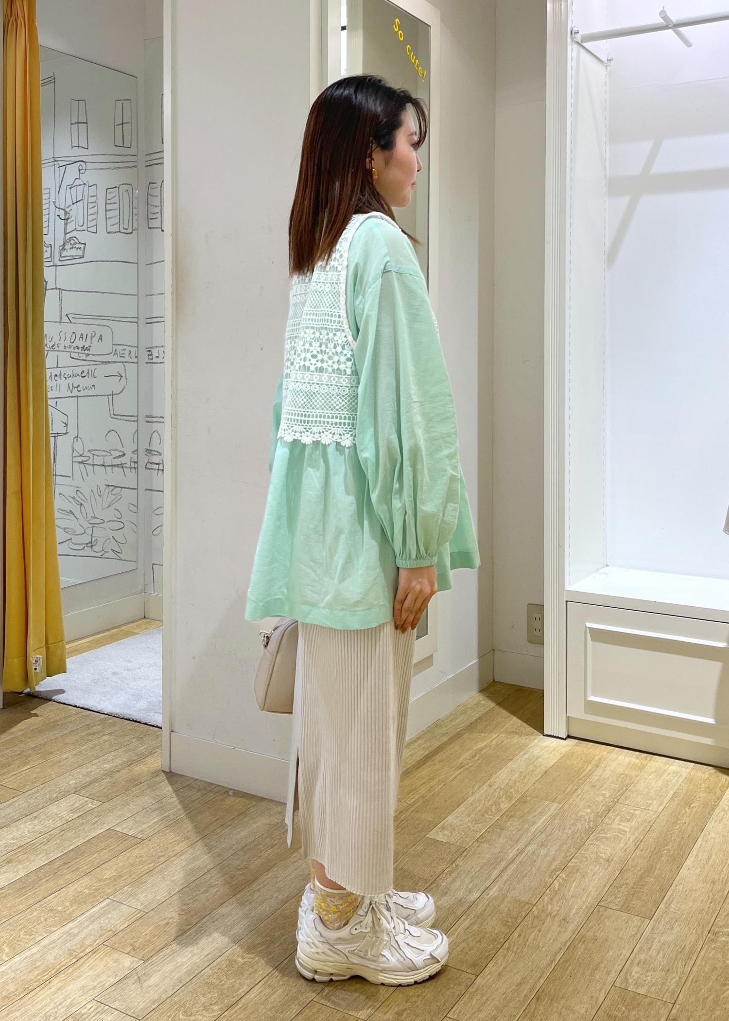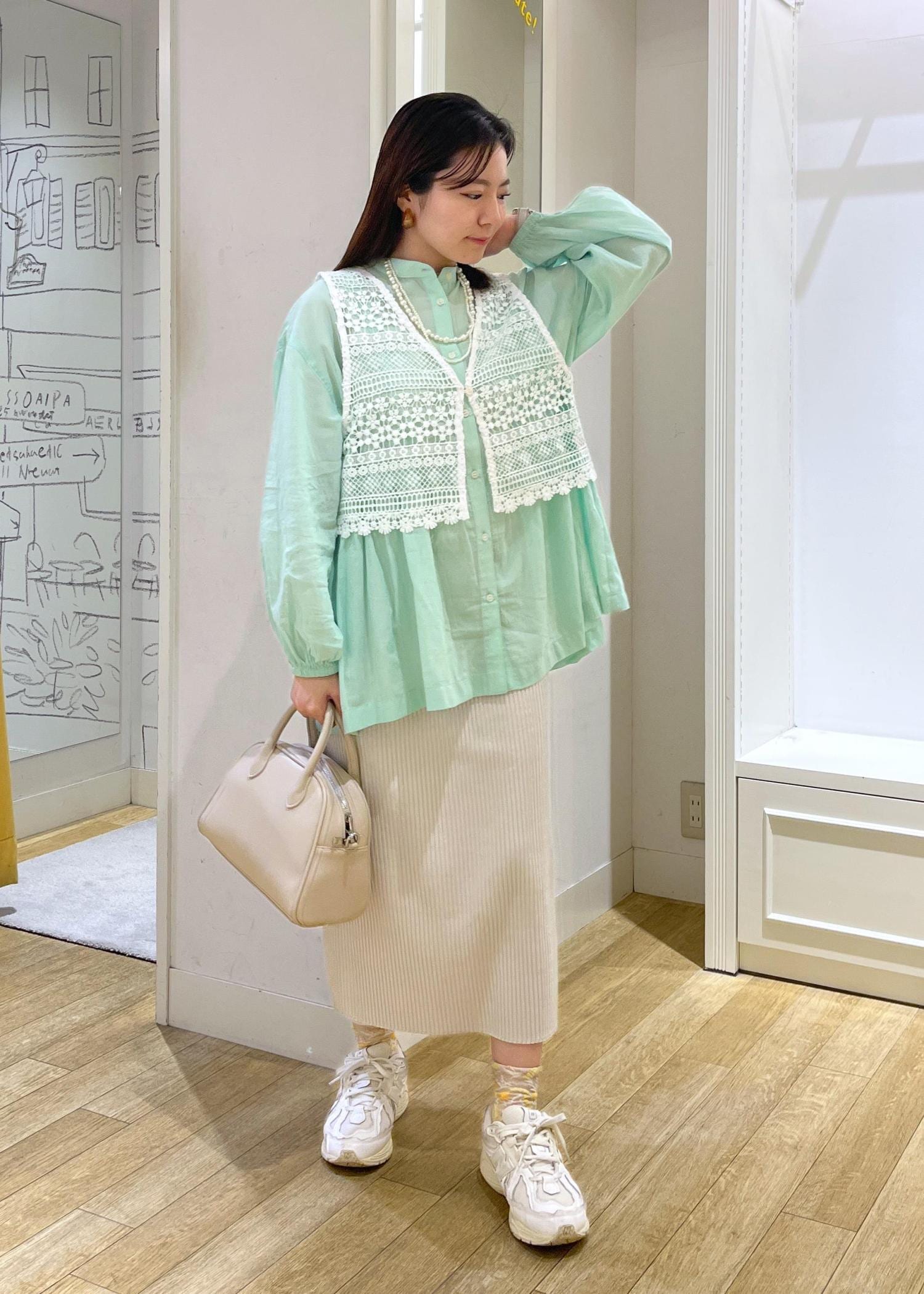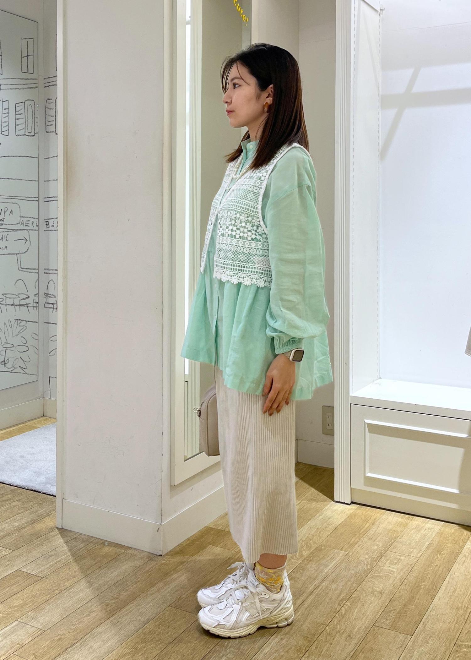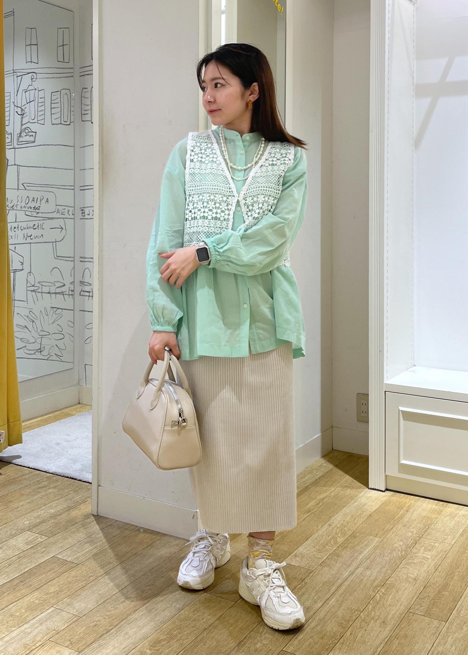 綺麗なグリーンのトップスを際立たせたかったので、他のアイテムは白やベージュ系でまとめました。